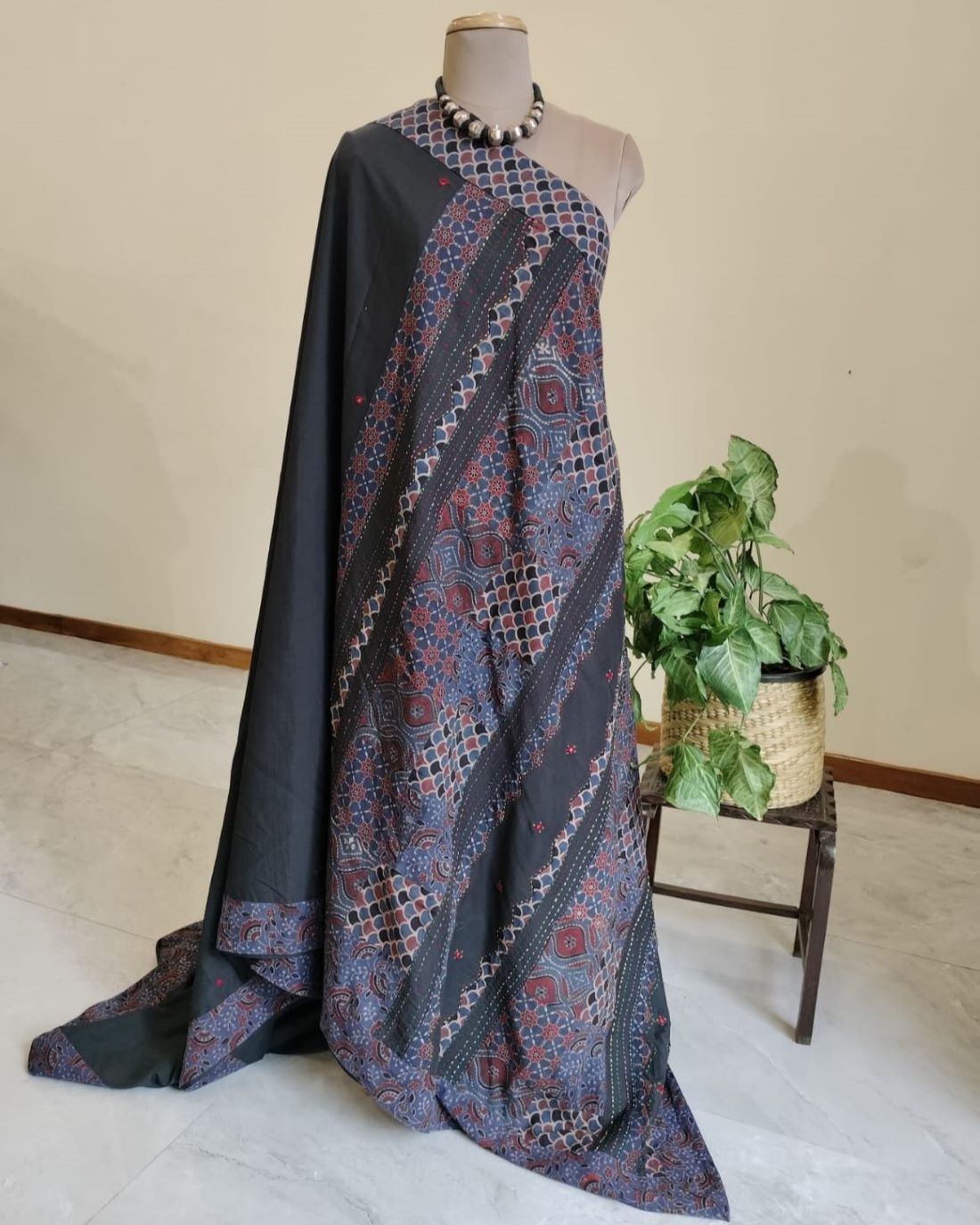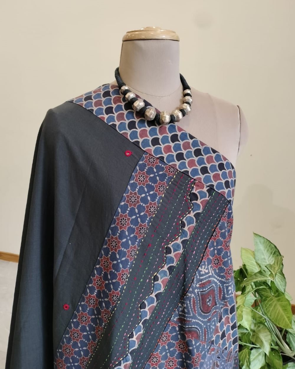 The applique is a patchwork of Ajrakh handblock; it’s artistically done in natural dyes. And the mirror work buttis on the body are also so daintily executed.