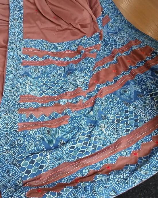 The applique is a patchwork of Ajrakh handblock; it’s artistically done in natural dyes.