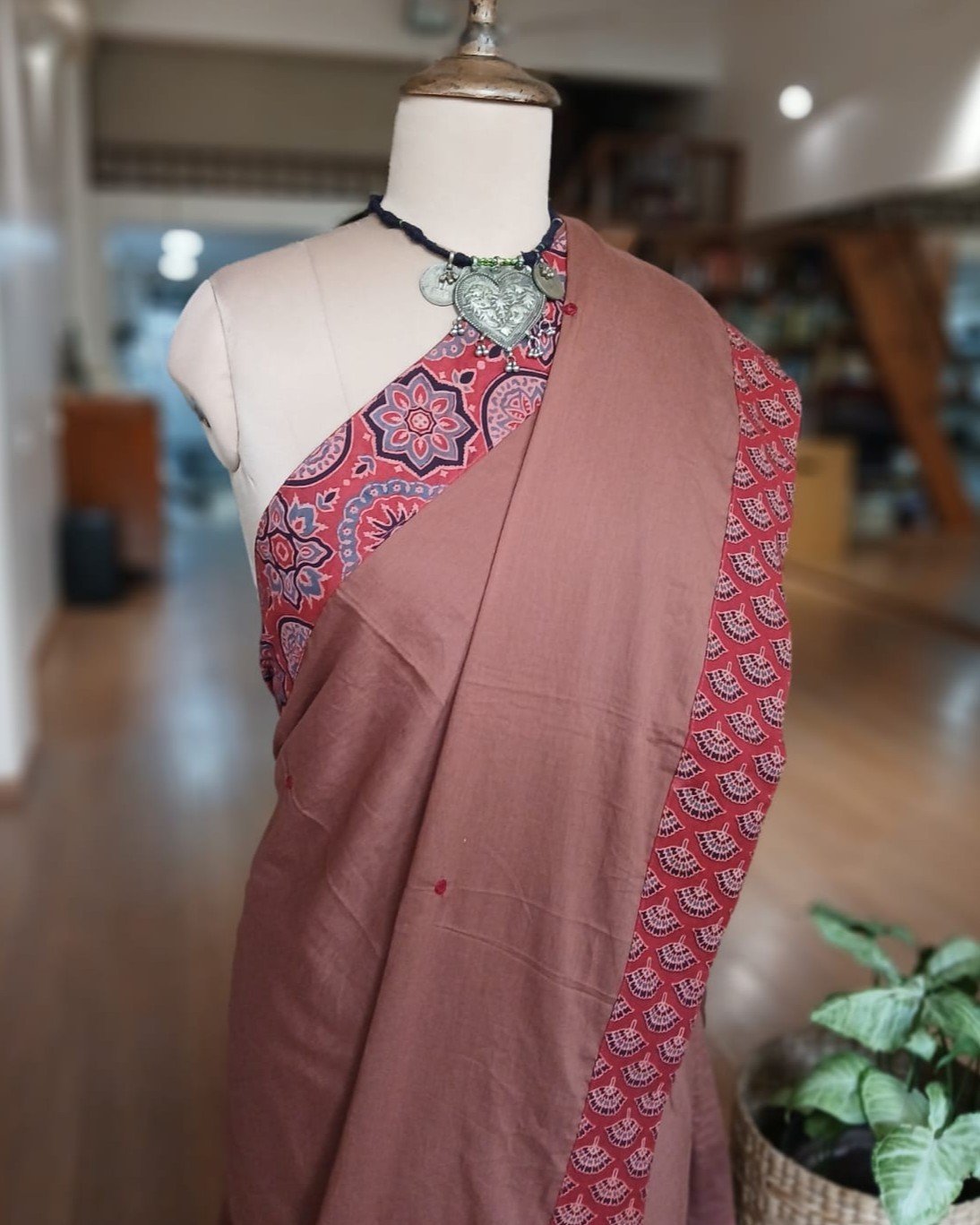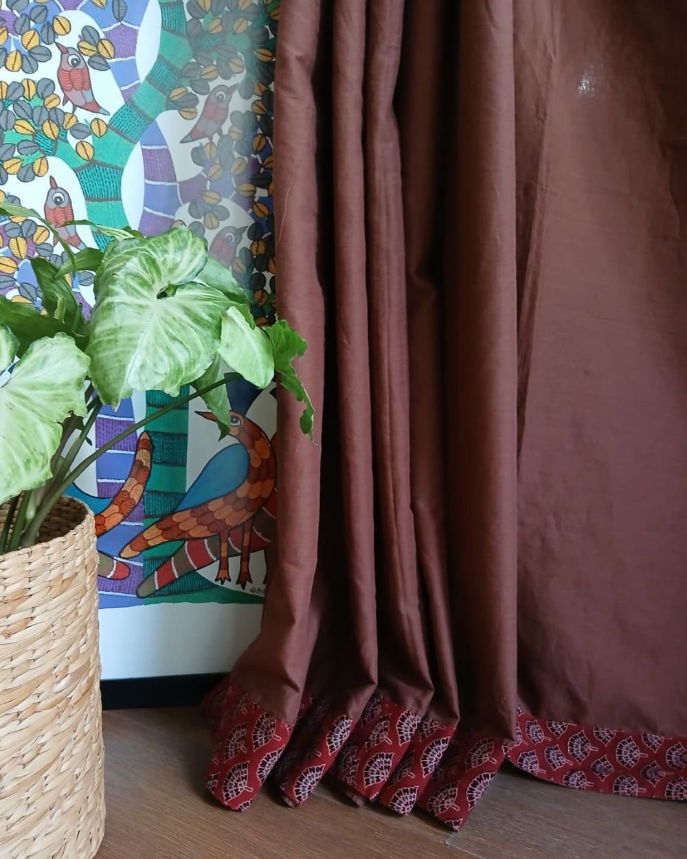 The applique is a patchwork of Ajrakh handblock; it’s artistically done in natural dyes.