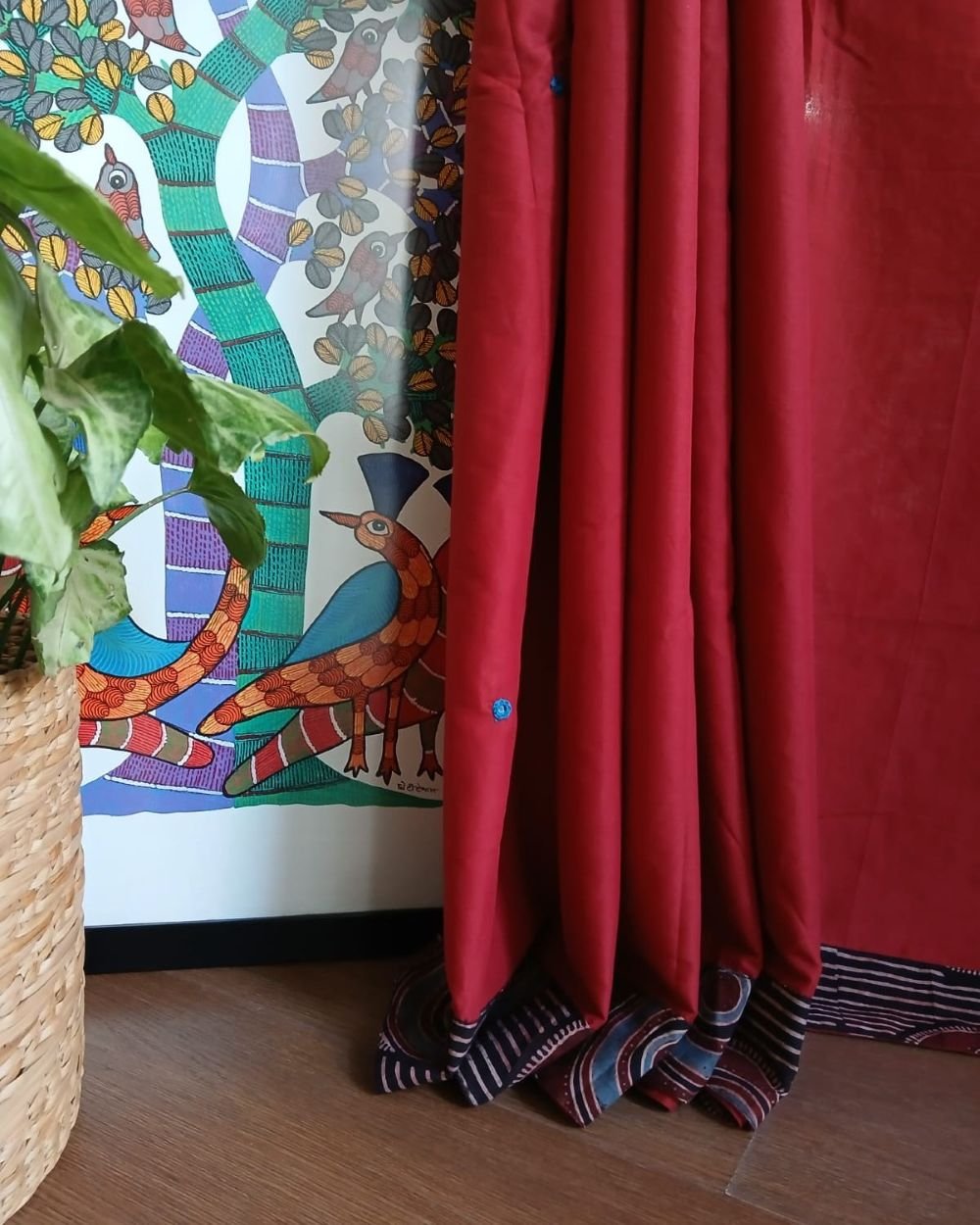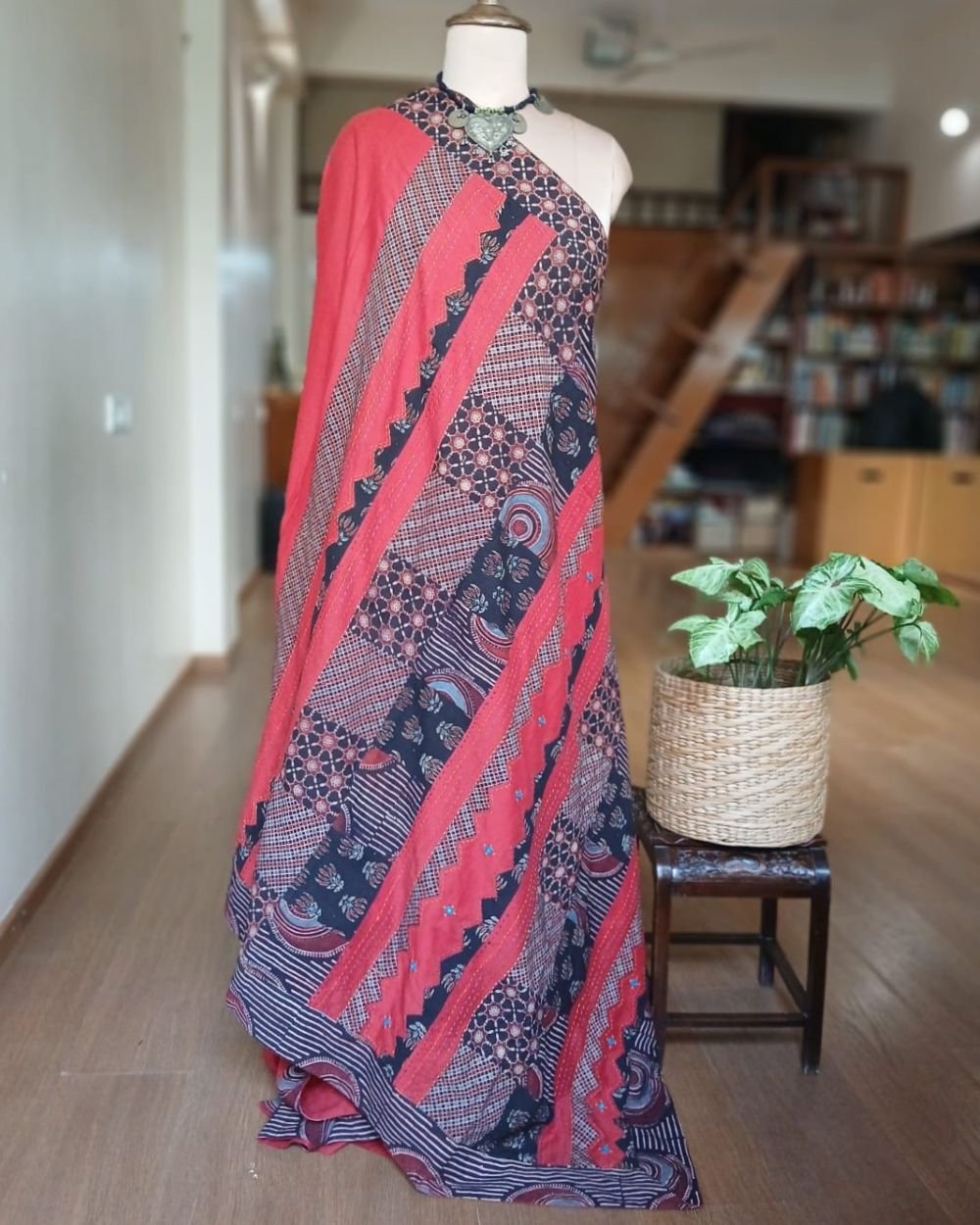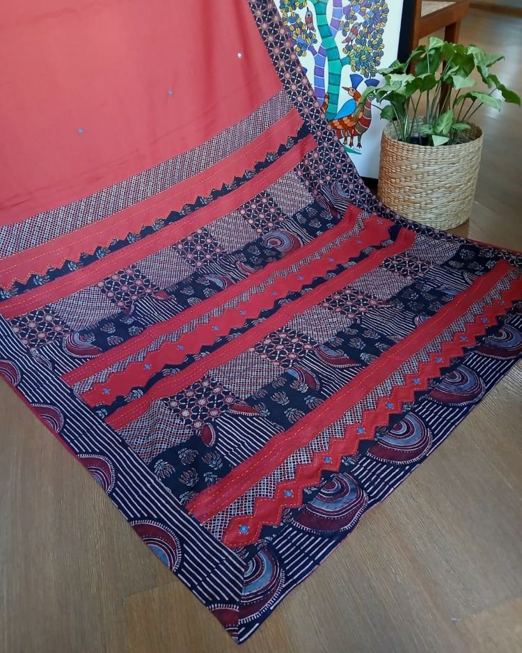 The applique is a patchwork of Ajrakh handblock; it’s artistically done in natural dyes.