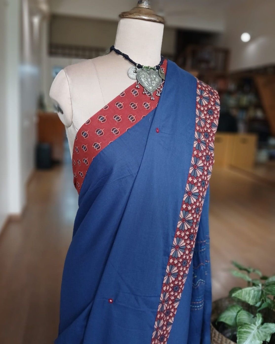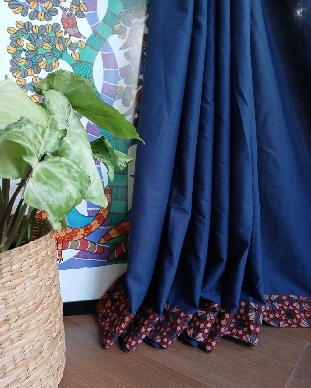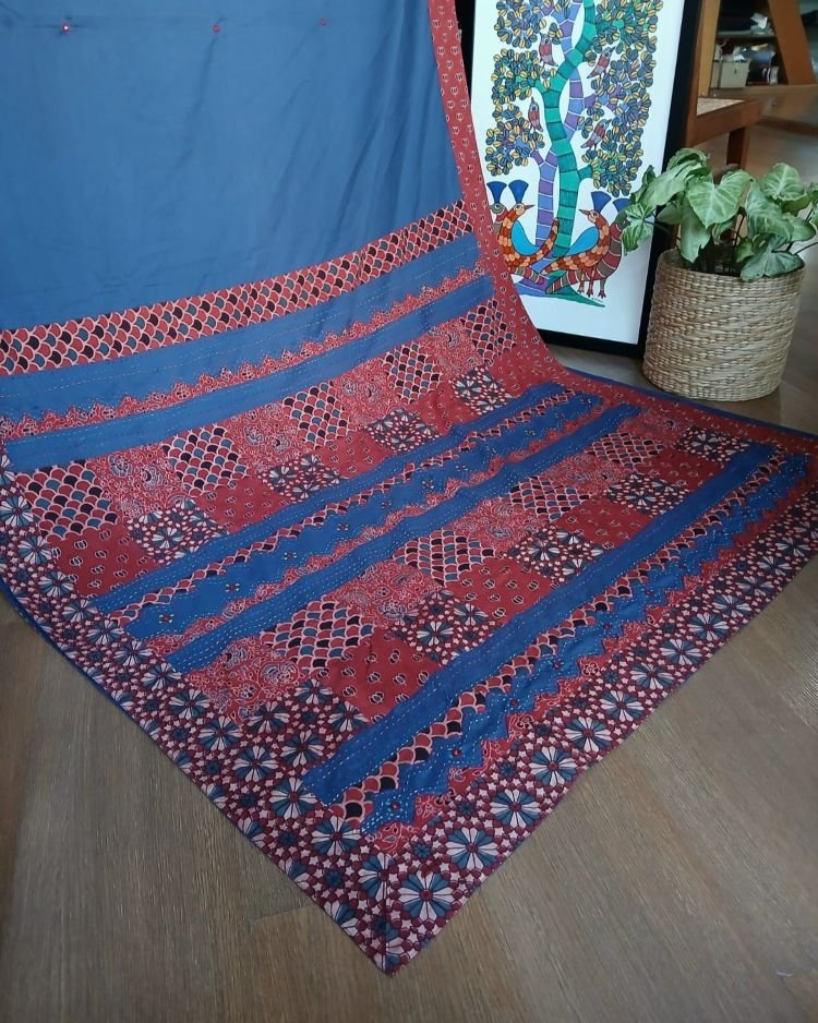 The applique is a patchwork of Ajrakh handblock; it’s artistically done in natural dyes.