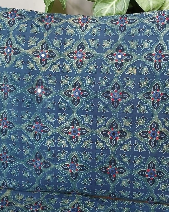 Ajrakh cushion covers in cotton with hand embroidery and patchwork.