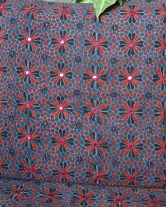 Ajrakh cushion covers in natural dyes, hand embroidered with mirrorwork from Barmer in Rajasthan.