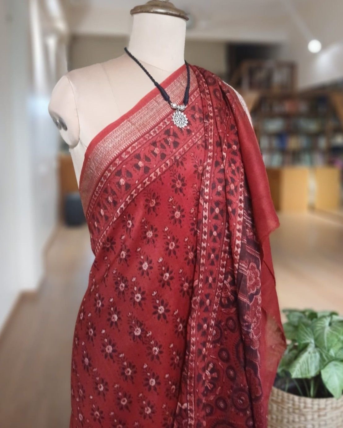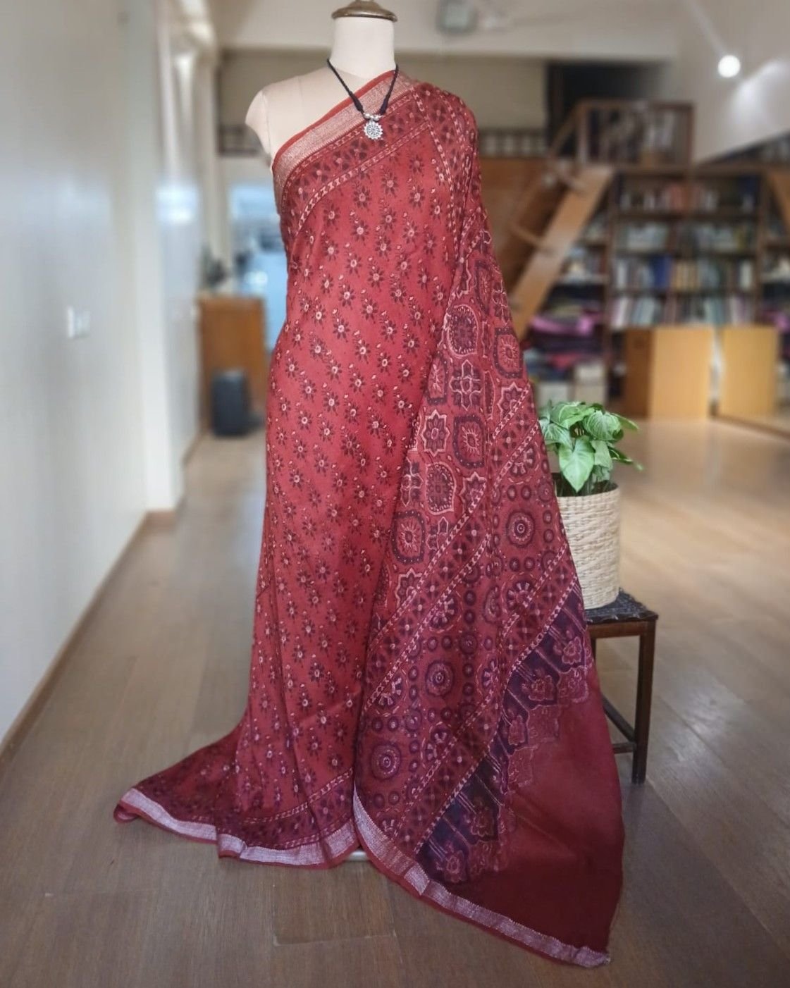 Ajrakh handblock saree on silk-cotton. From Barmer in Rajasthan. See more details below