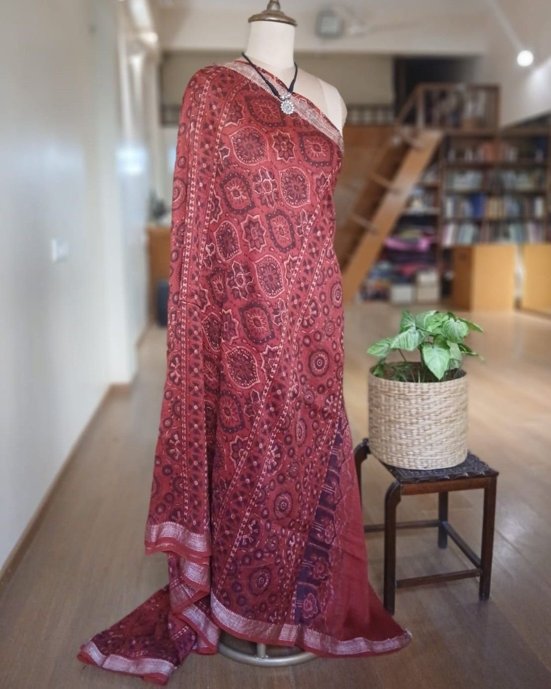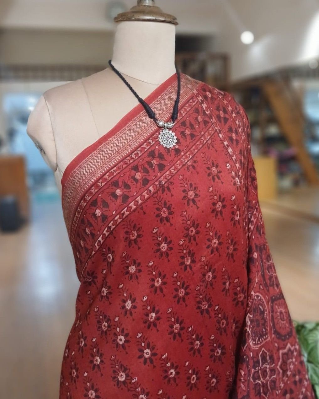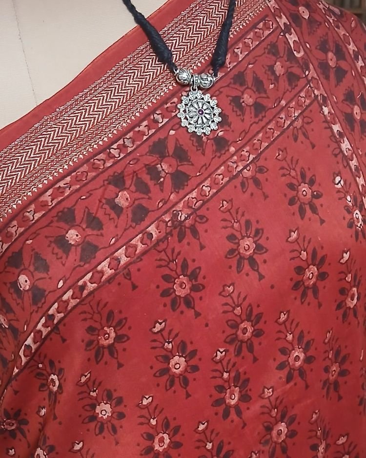 Ajrakh handblock saree on silk-cotton. From Barmer in Rajasthan.