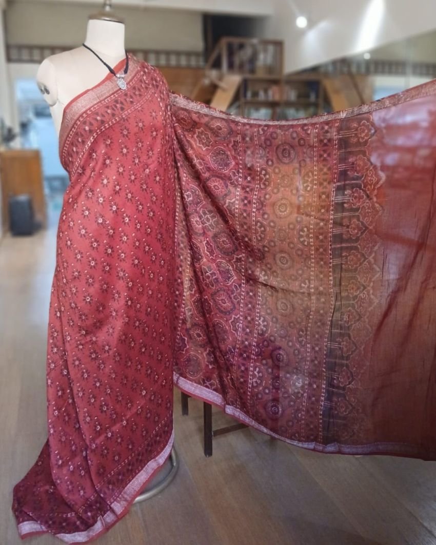 Ajrakh Handblock Saree on Silk-Cotton – (AHSC0003)
