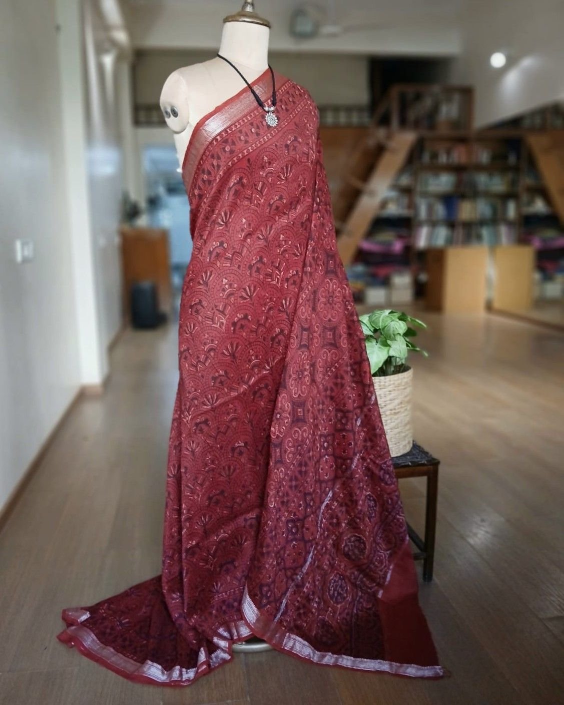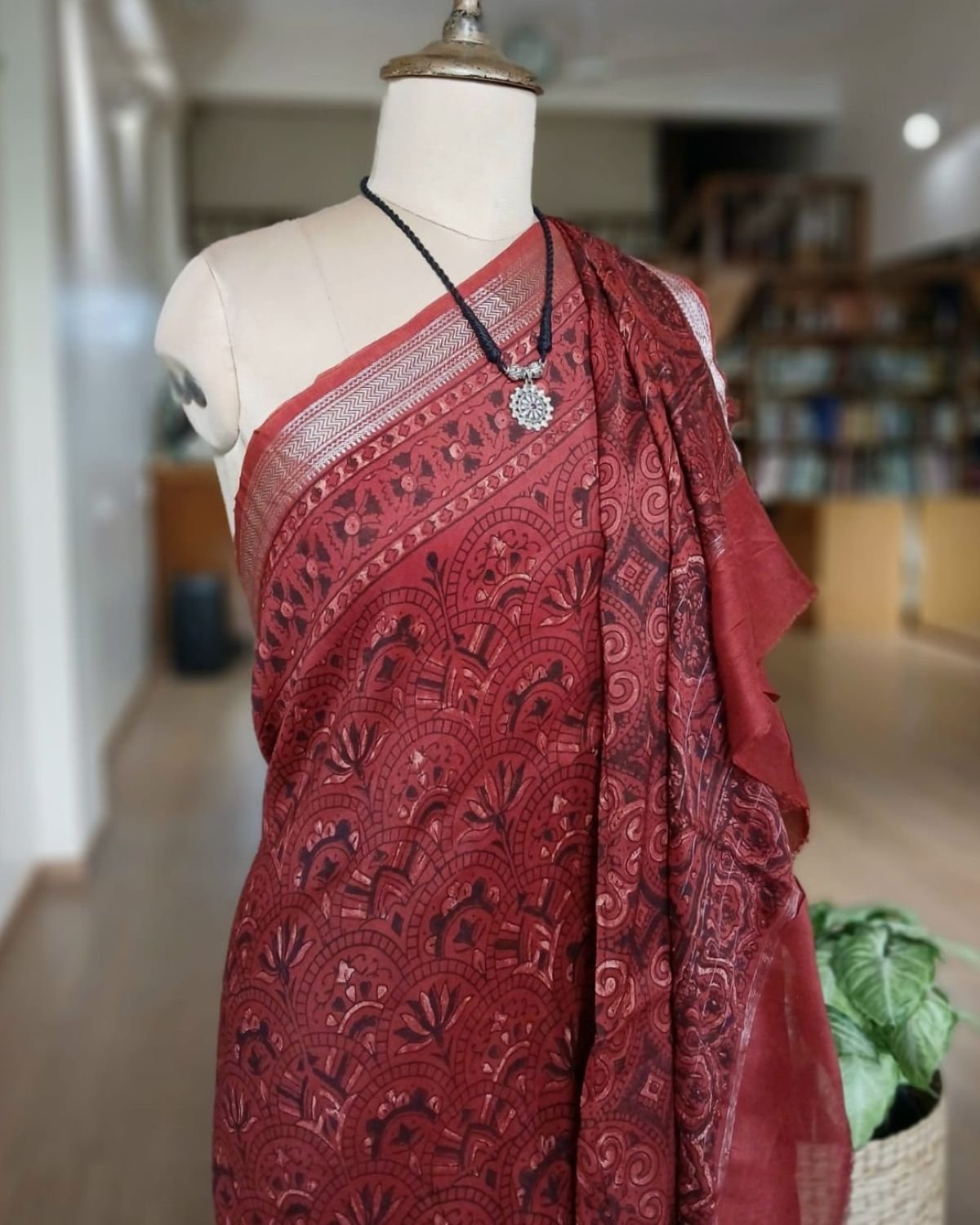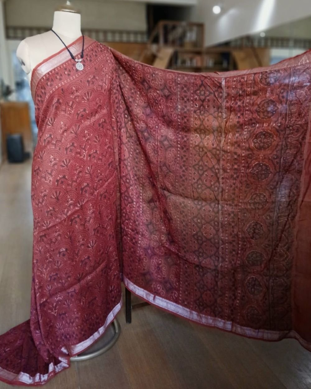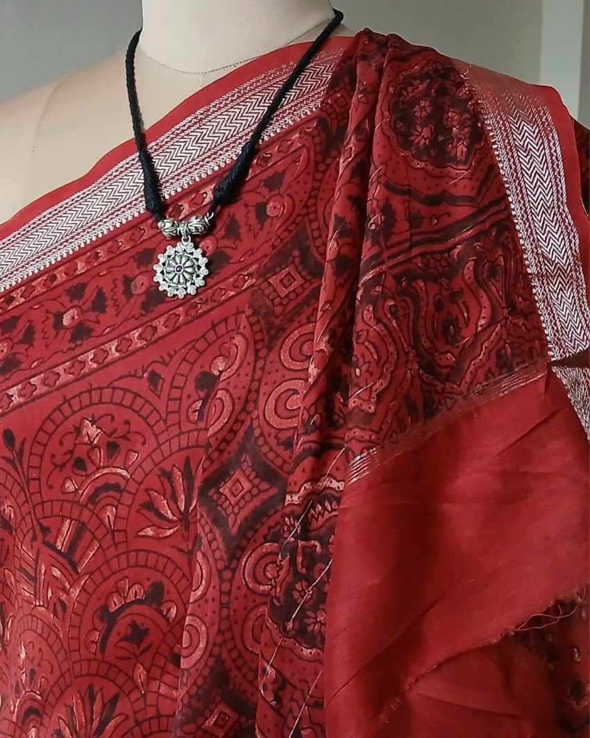 Ajrakh Handblock Saree on Silk-Cotton – (AHSC0009)