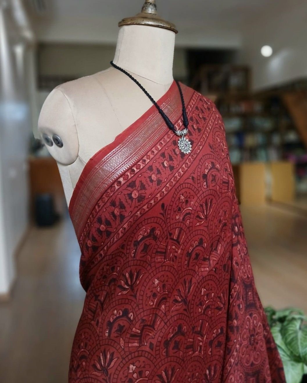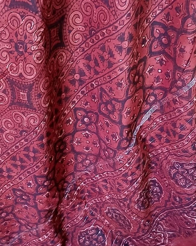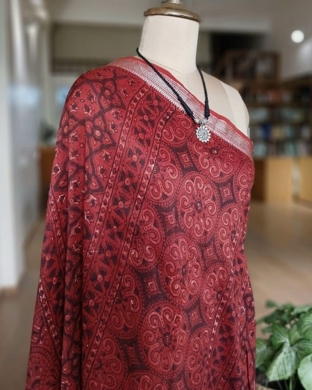 Ajrakh handblock saree on silk-cotton. From Barmer in Rajasthan.