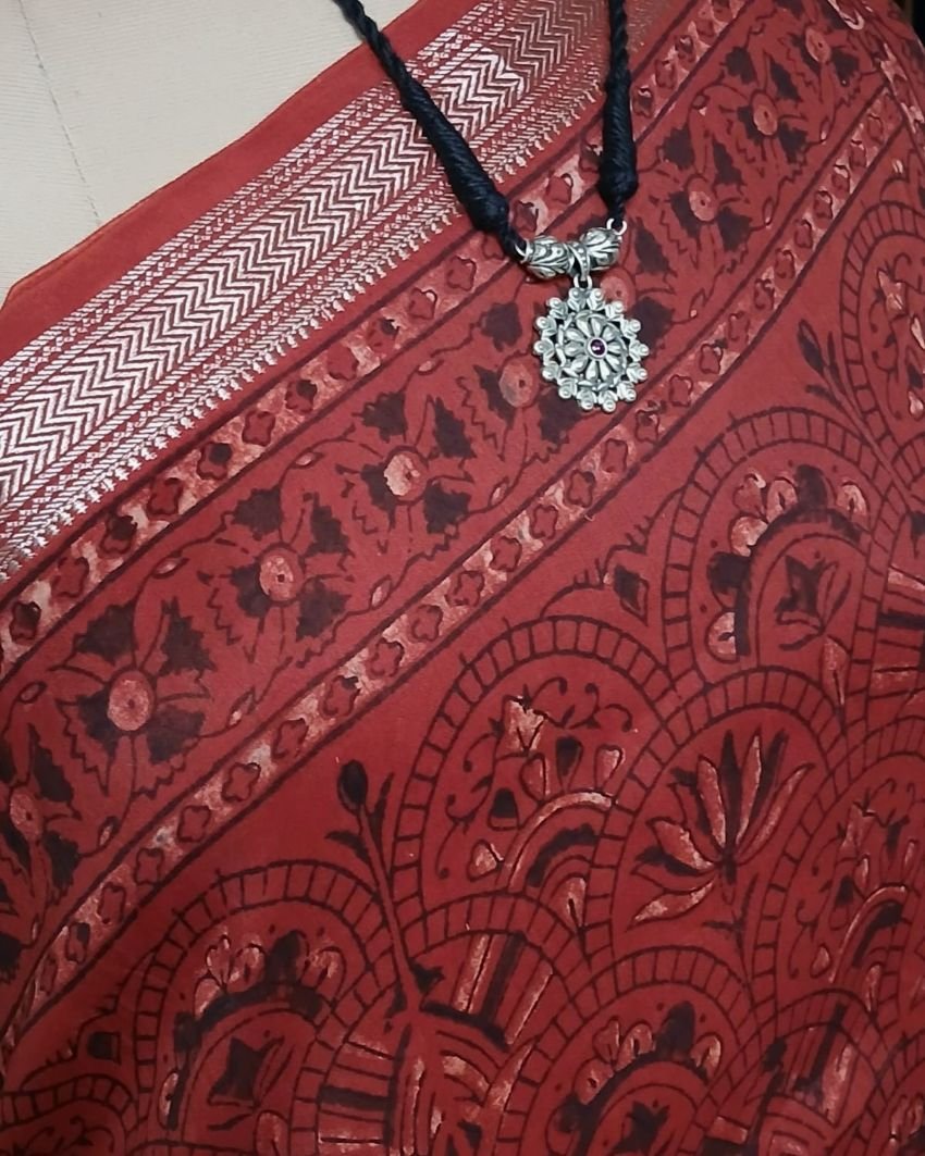 Ajrakh handblock saree on silk-cotton. From Barmer in Rajasthan. See more details below