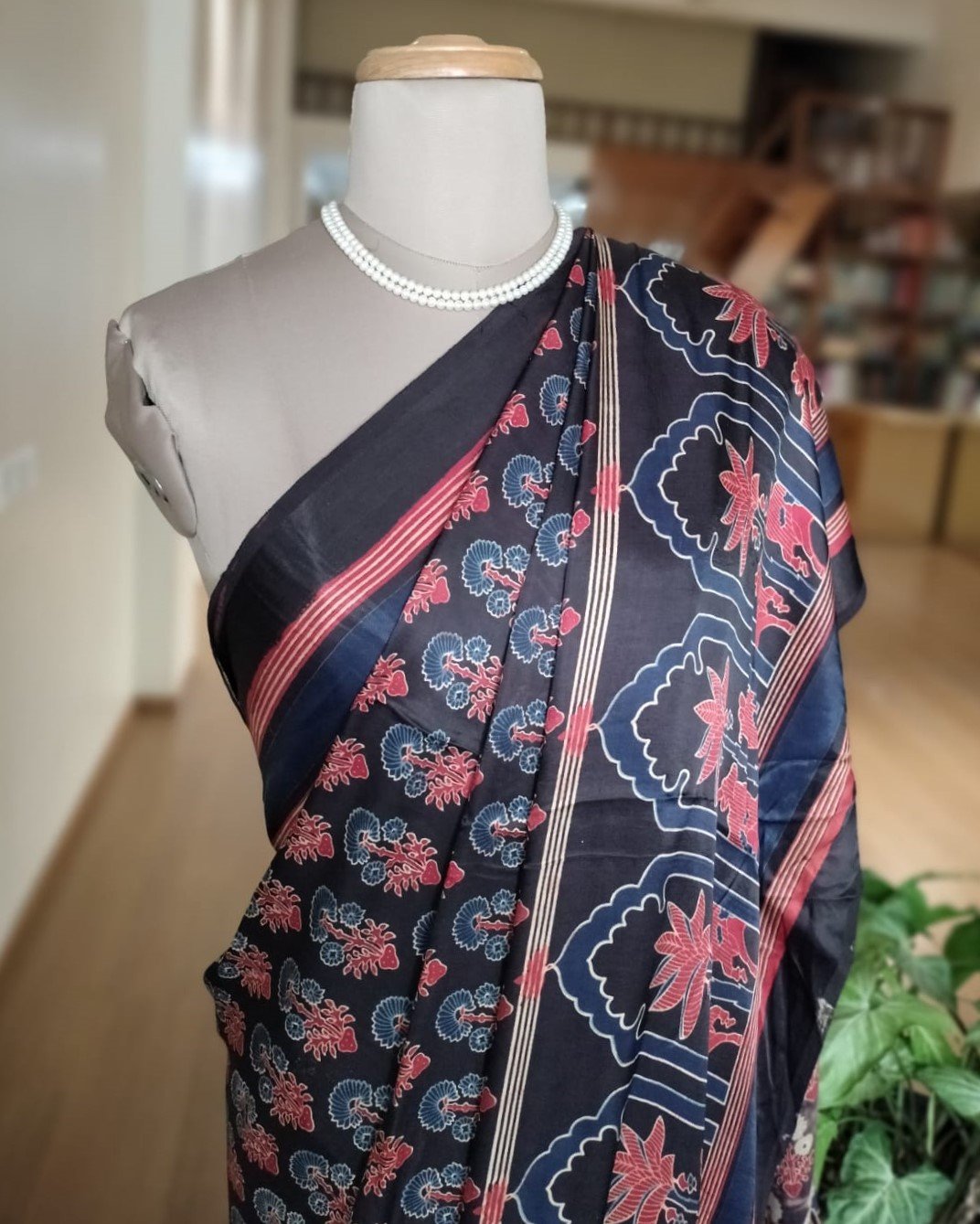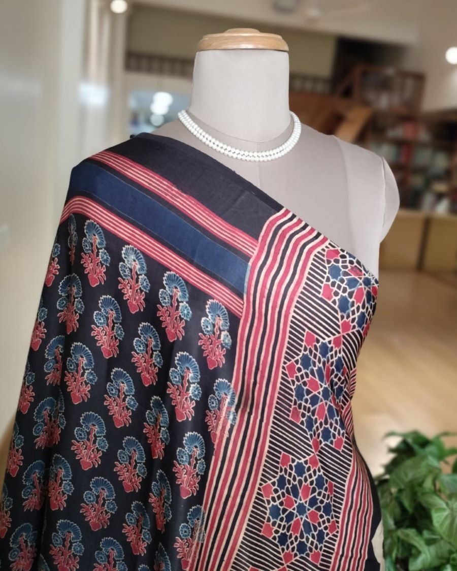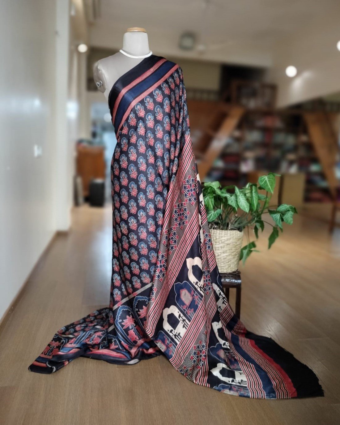 Ajrakh Modal Silk Saree from Barmer – Black (MODA0032)