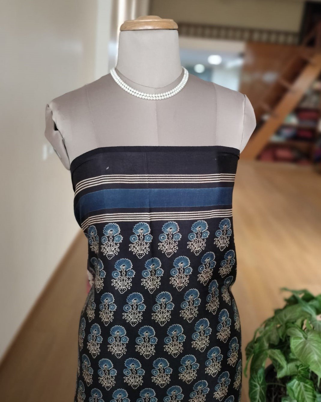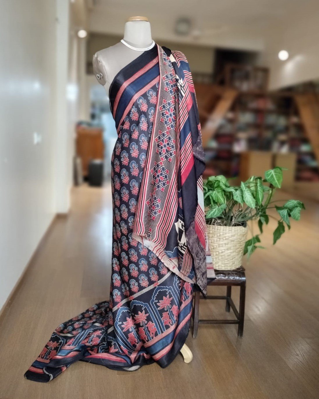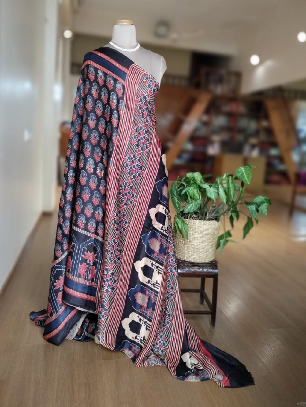 Ajrakh Modal Silk Saree from Barmer – Black (MODA0032)
