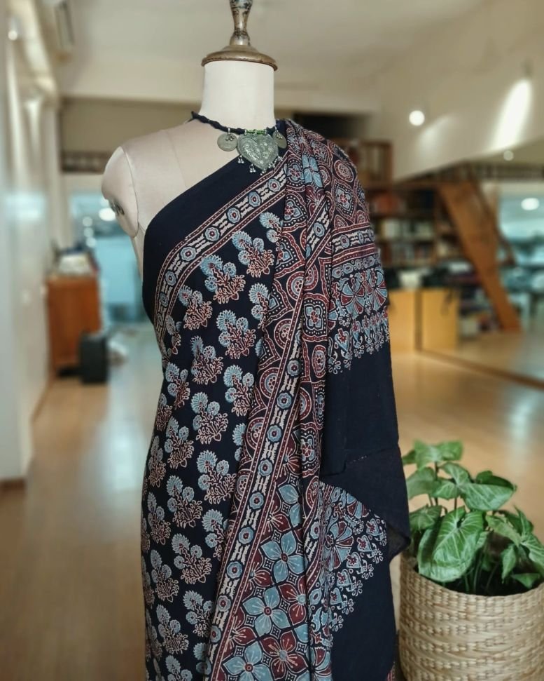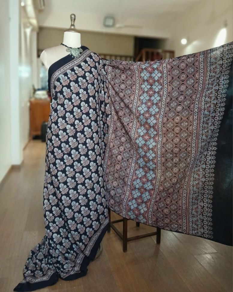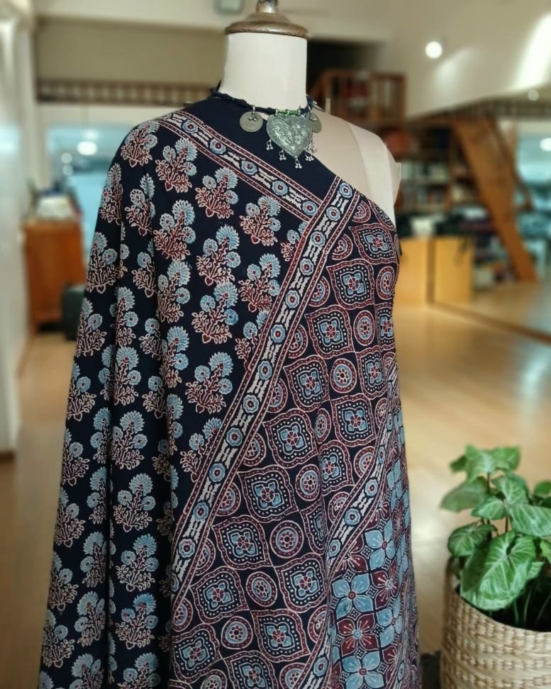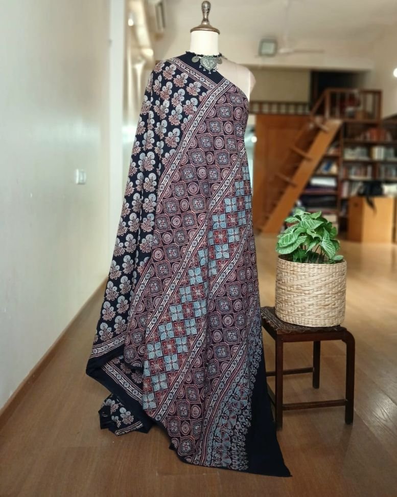 Ajrakh in Natural Dyes on Mul Cotton Saree