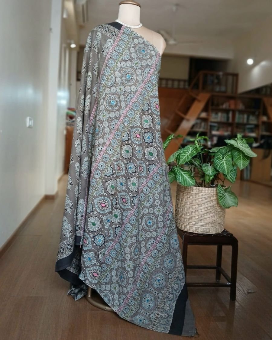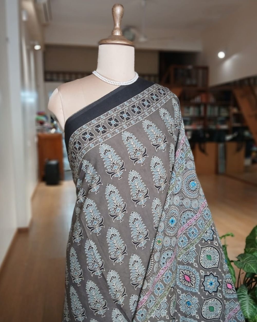 Ajrakh in Natural Dyes on Mul Cotton Saree, with embroidered palla.