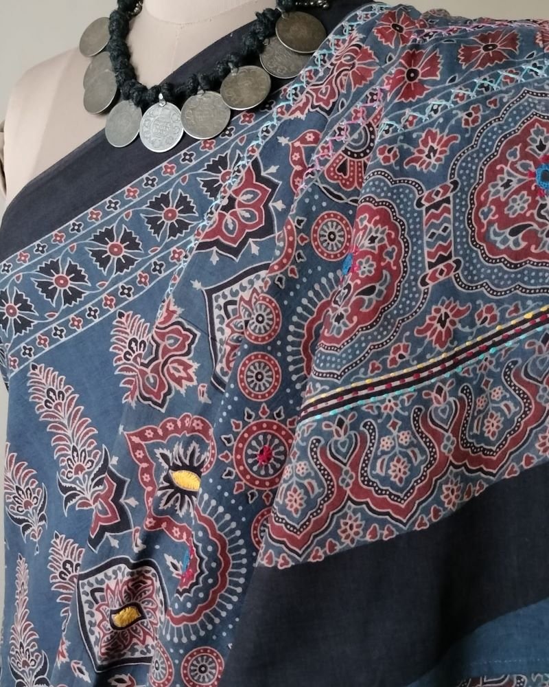 Ajrakh Mul Cotton With Embroidery – Blue