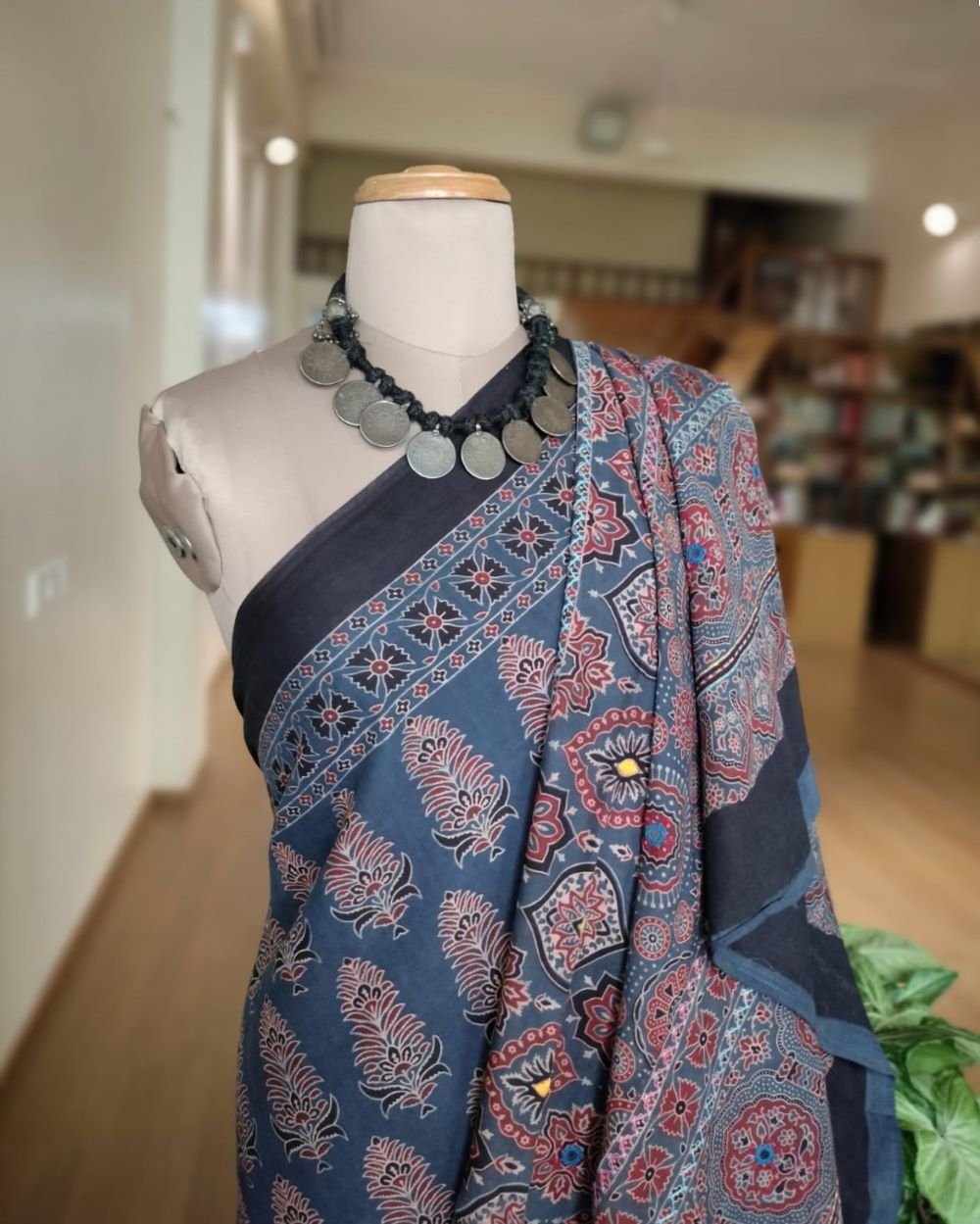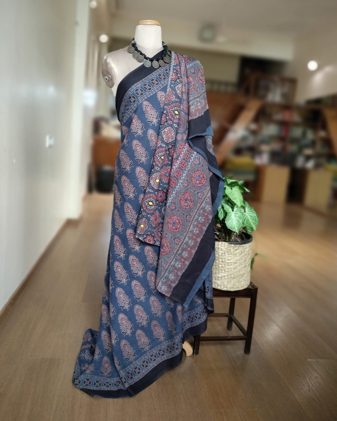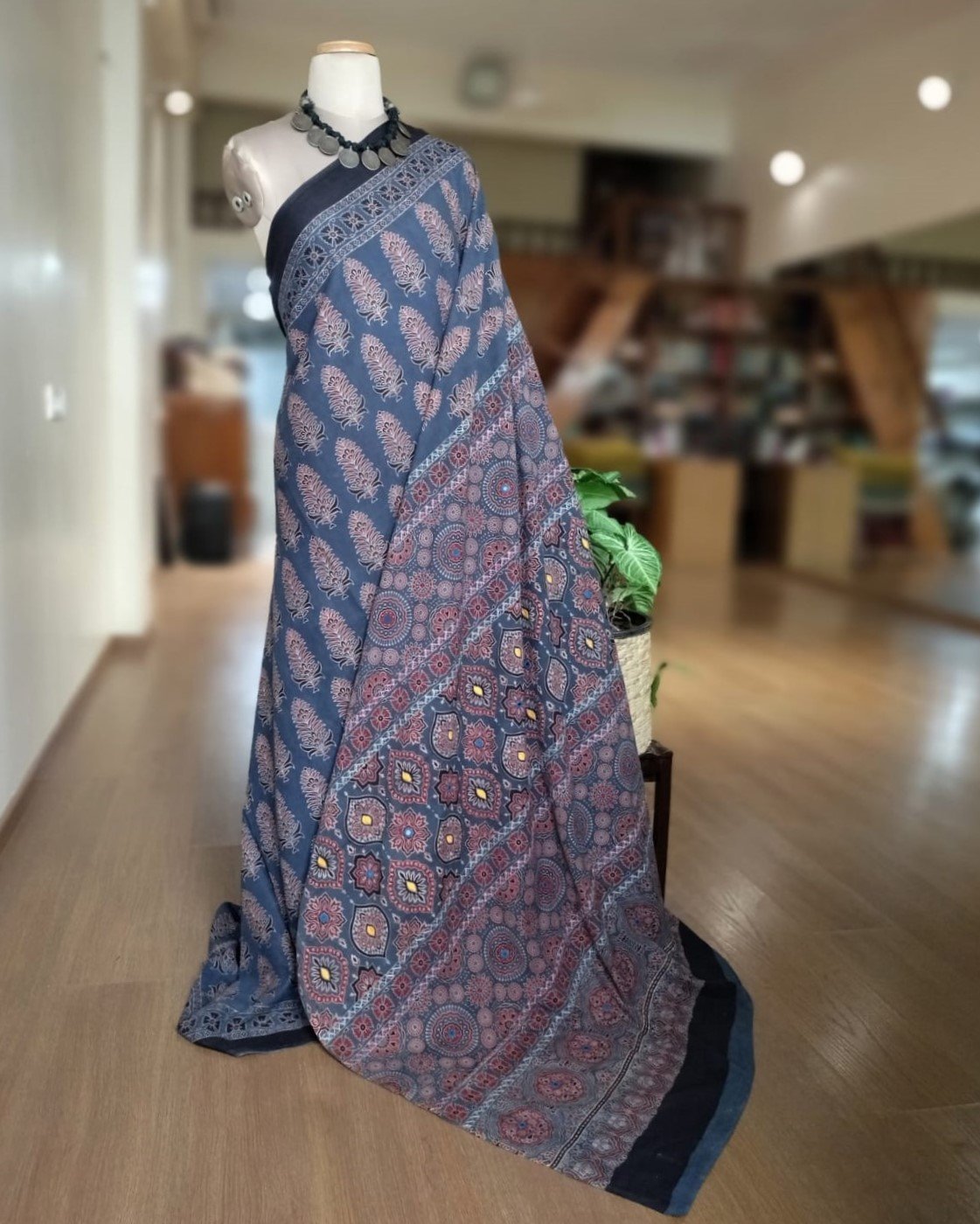 Ajrakh in Natural Dyes on Mul Cotton Saree, with embroidered palla