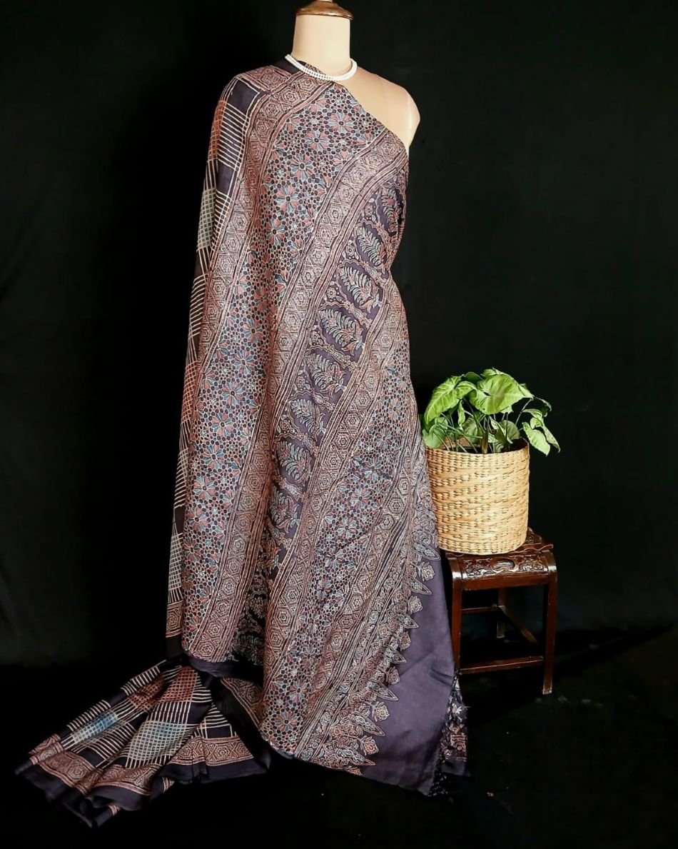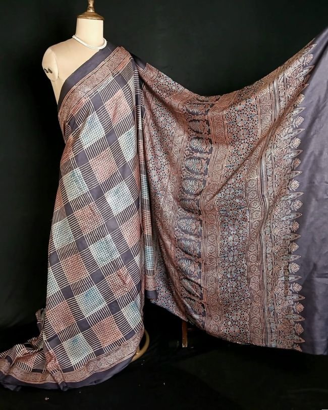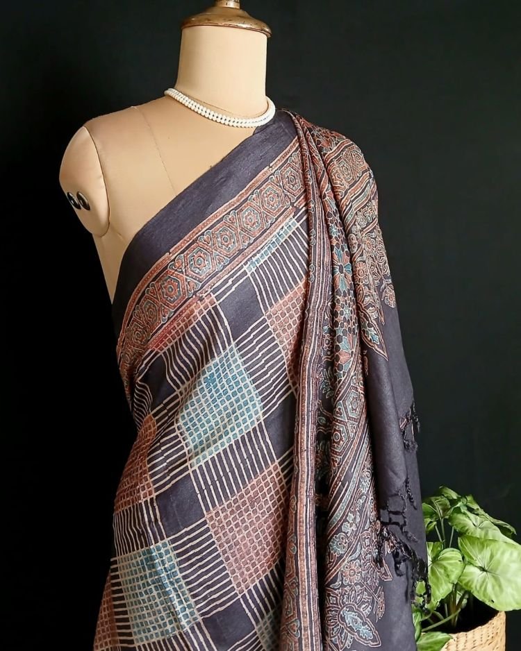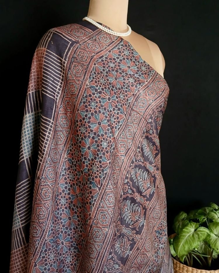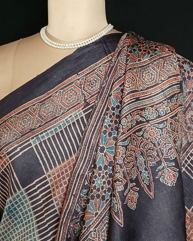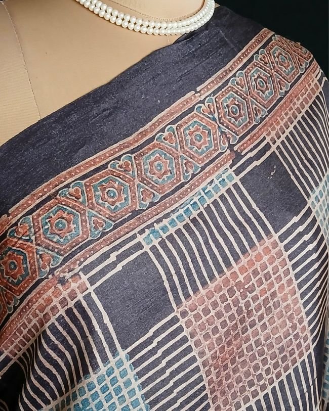 Soyab’s Tussar Silk saree printed with handblock Ajrakh in natural dyes. From Ajrakhpur in Kutch.