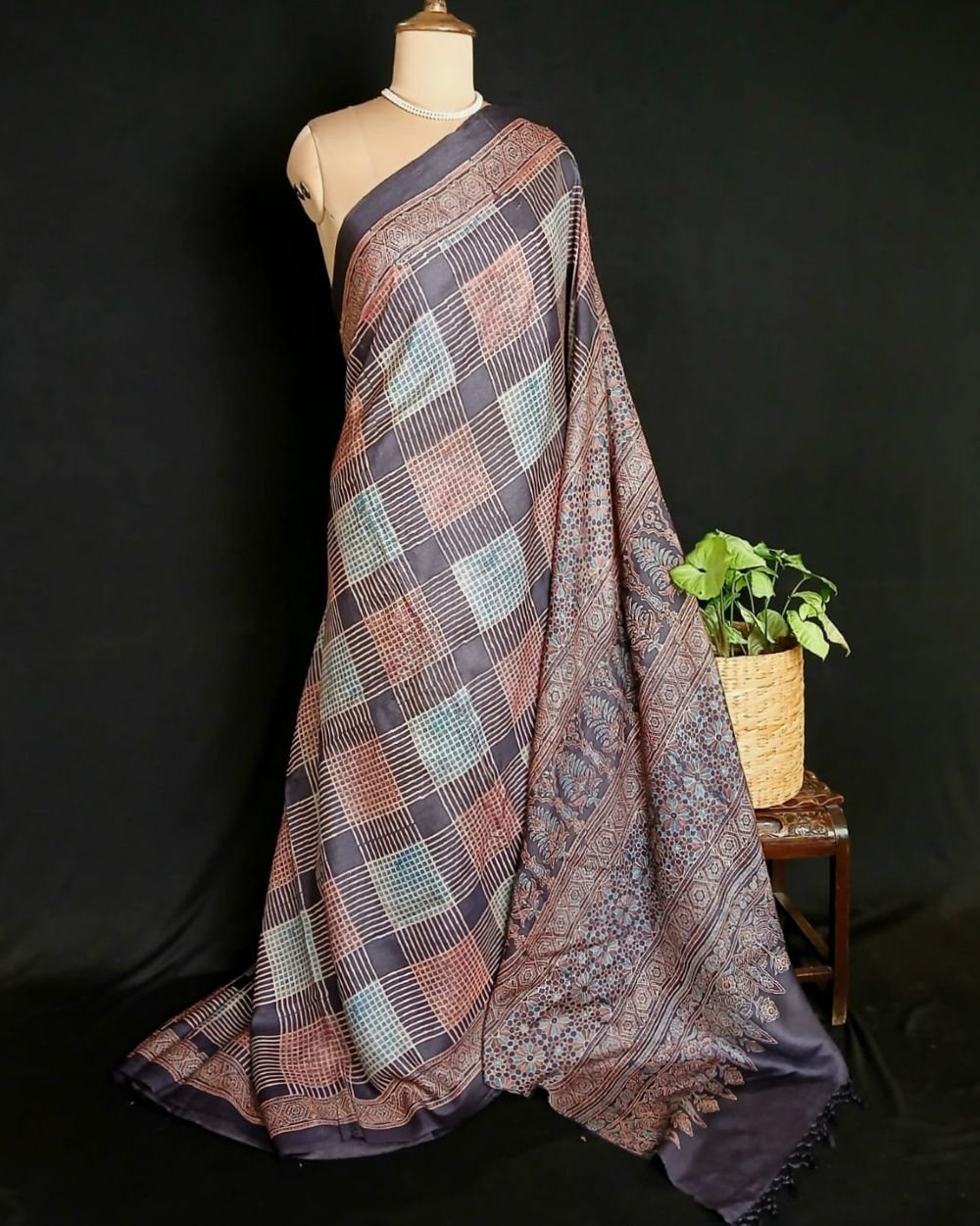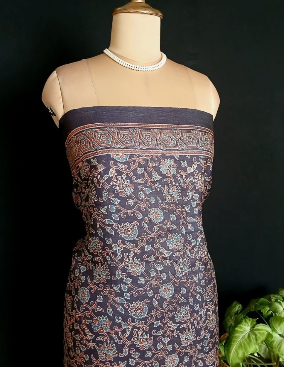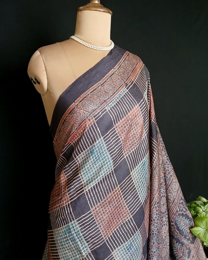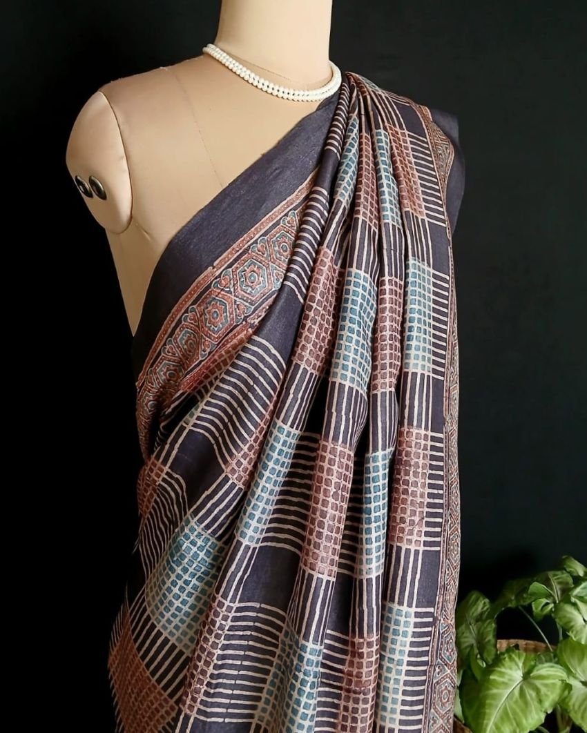 Soyab’s Tussar Silk saree printed with handblock Ajrakh in natural dyes. From Ajrakhpur in Kutch.