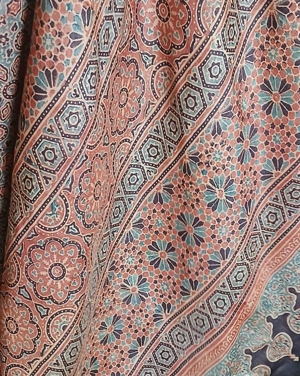 Soyab’s Tussar Silk saree printed with handblock Ajrakh in natural dyes. From Ajrakhpur in Kutch.