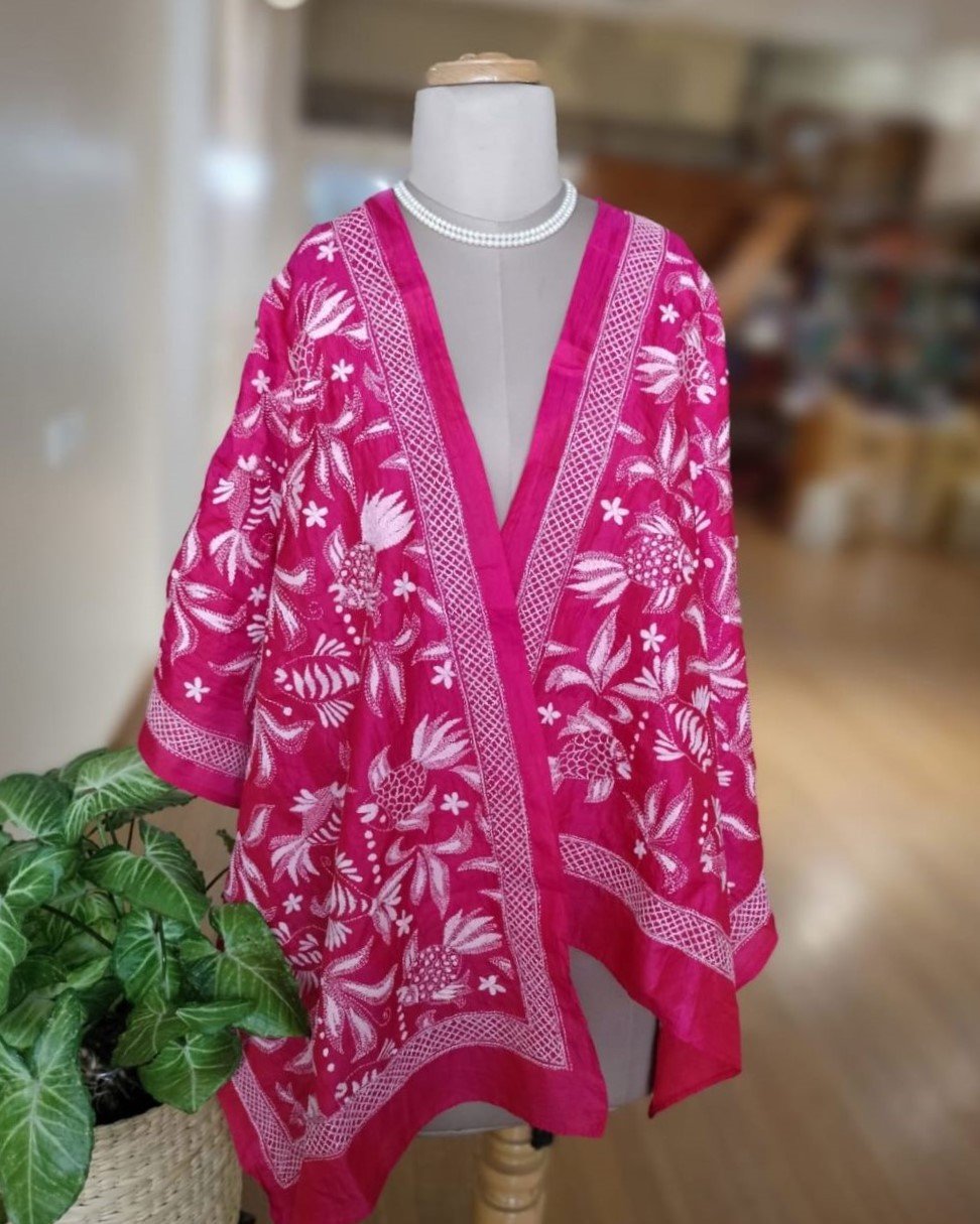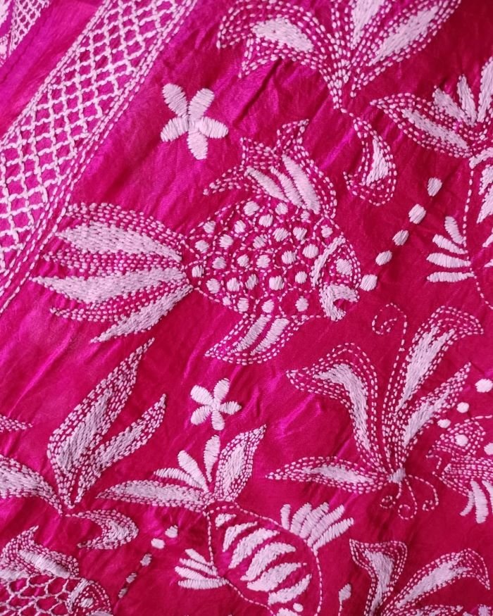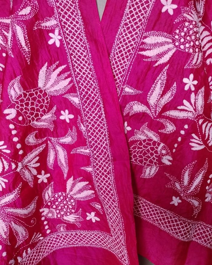 Kantha hand-embroidery on artsilk, in rani pink. Made in West Bengal.
