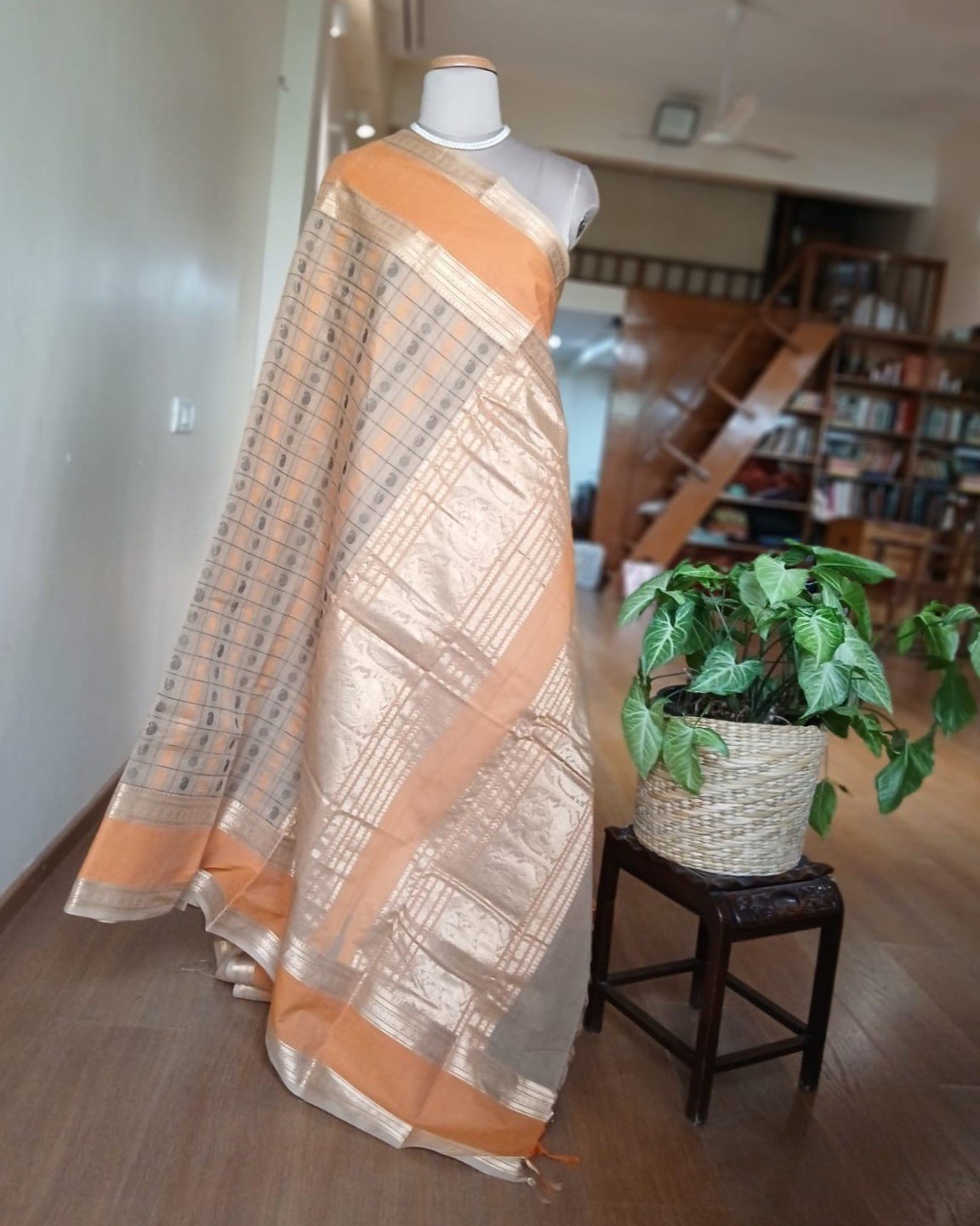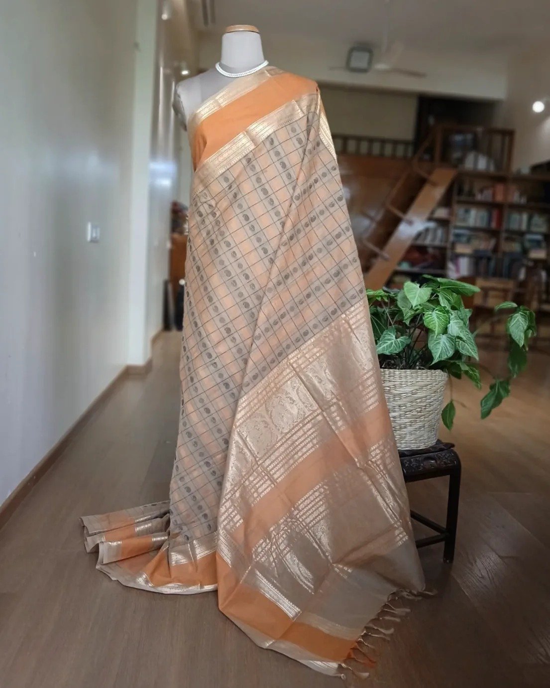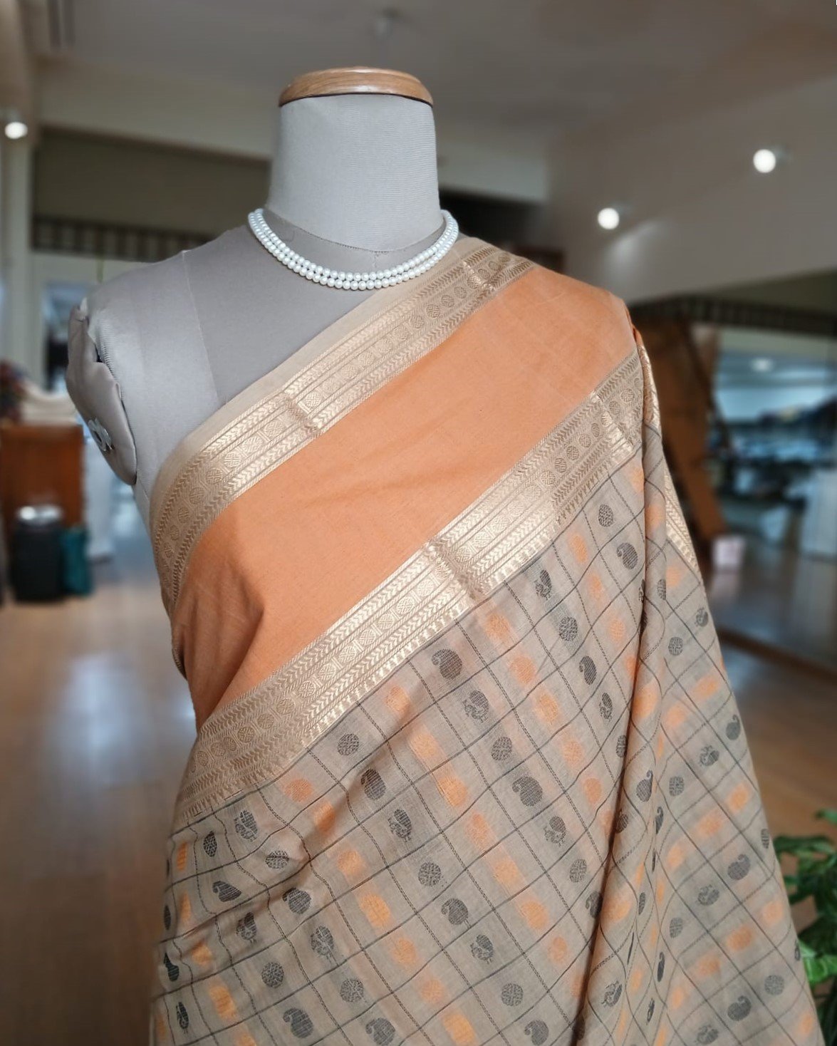 The saree has richly woven borders and pallu. There are woven rudraksha, peacock and mango buttis in the body.