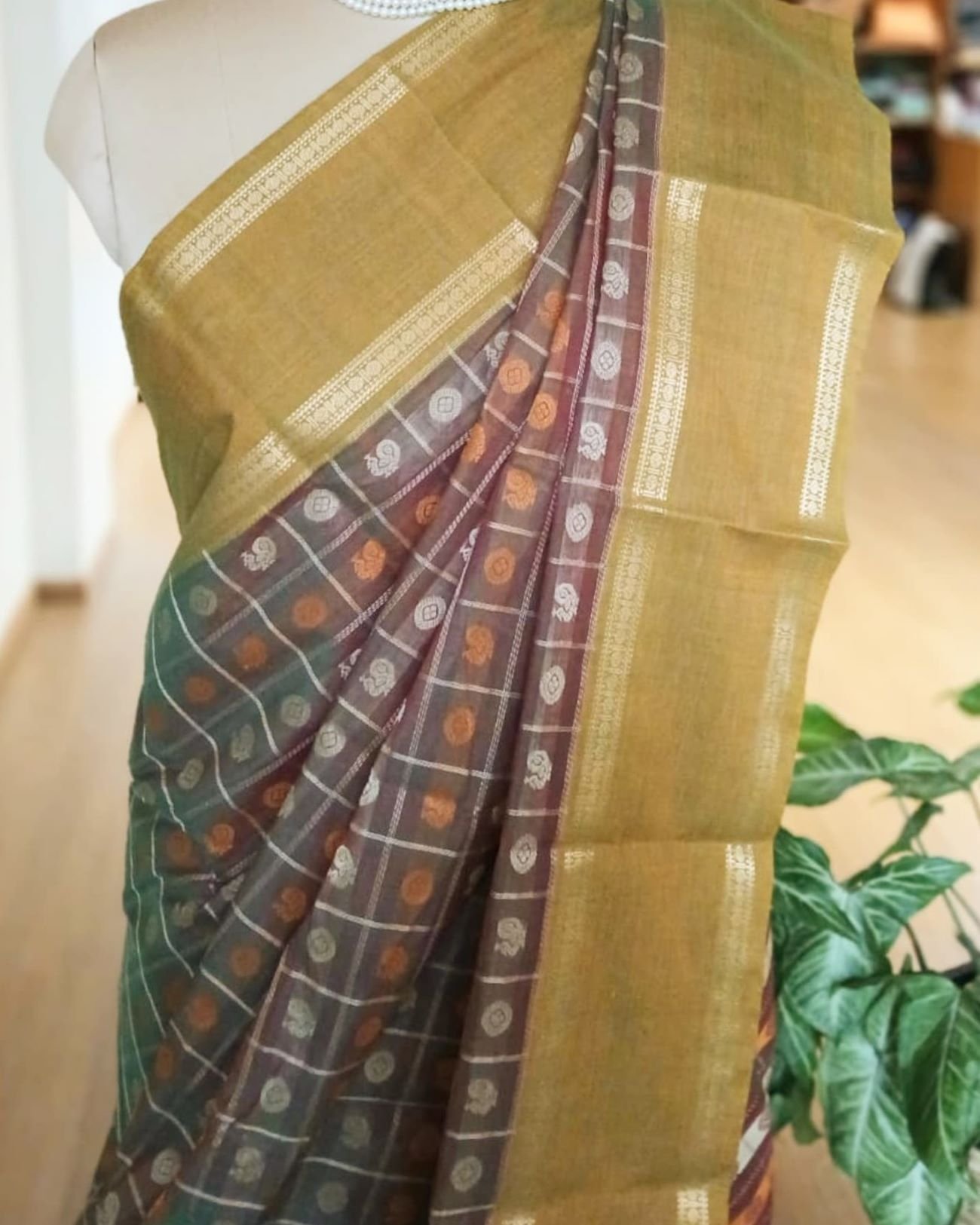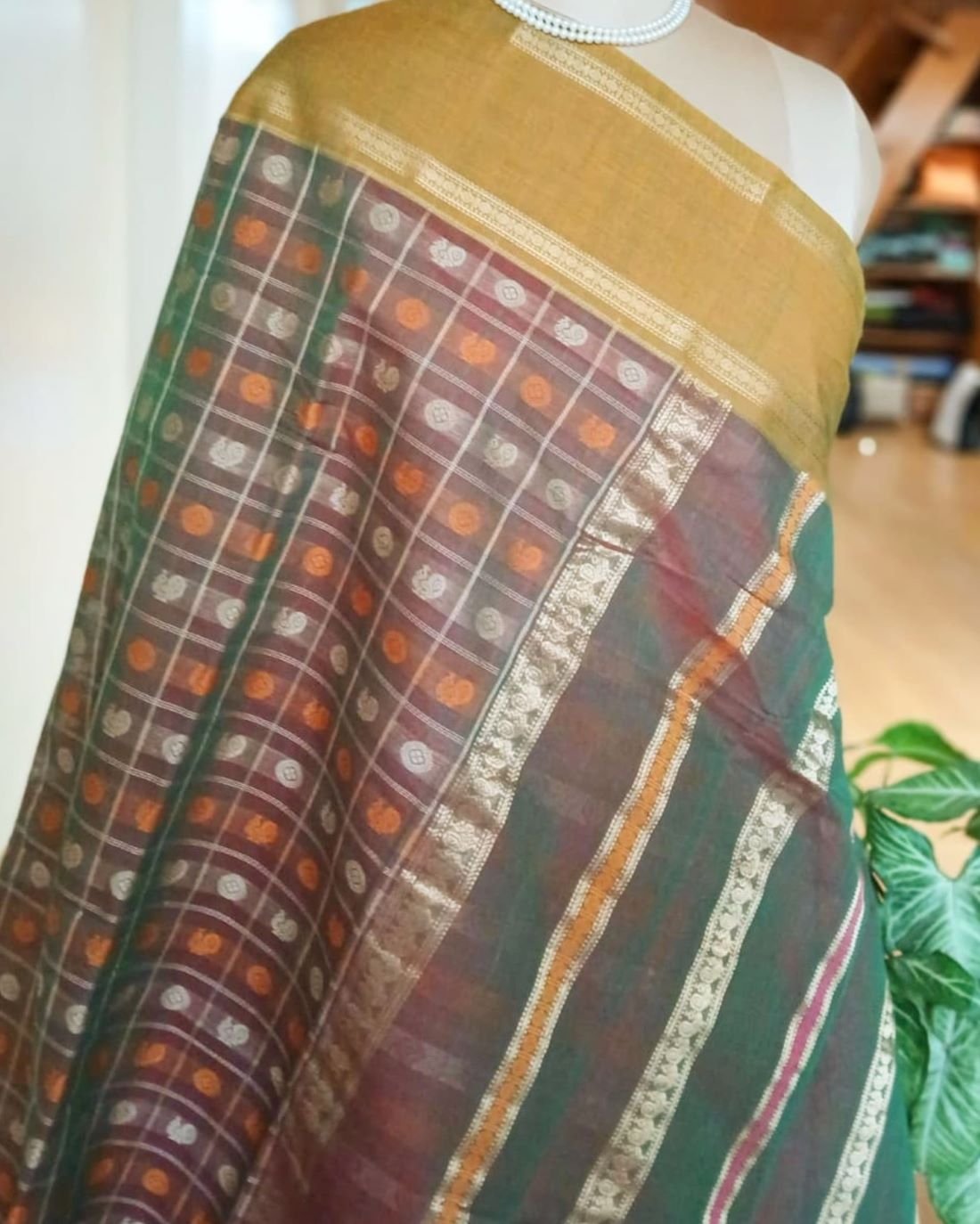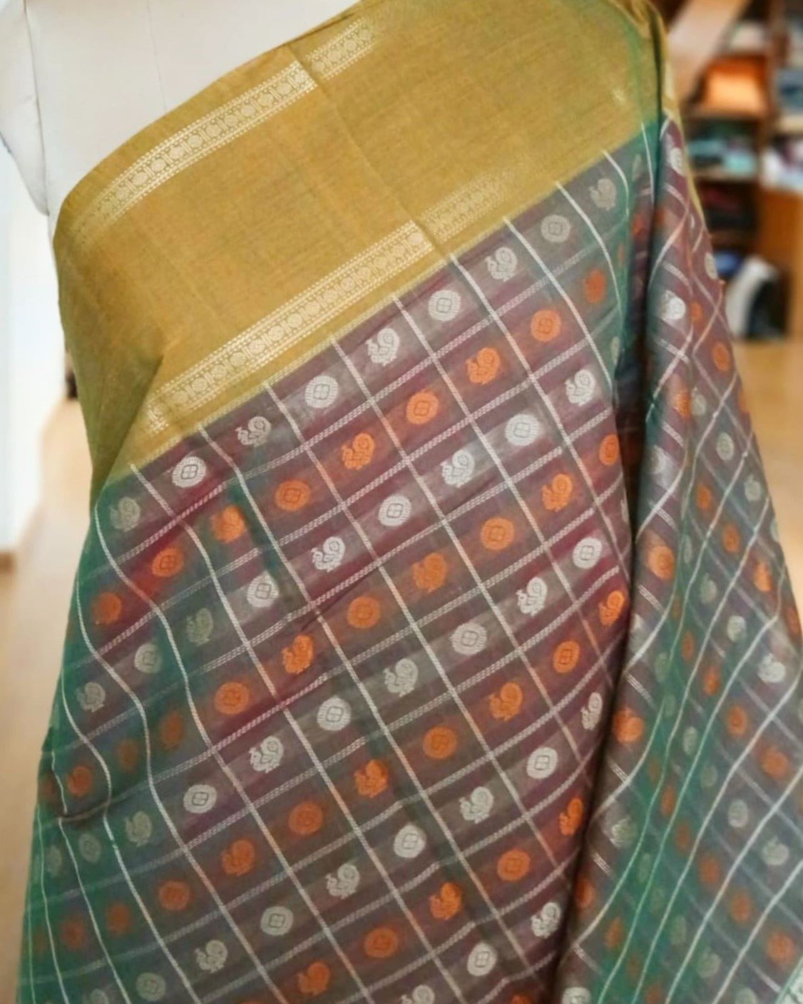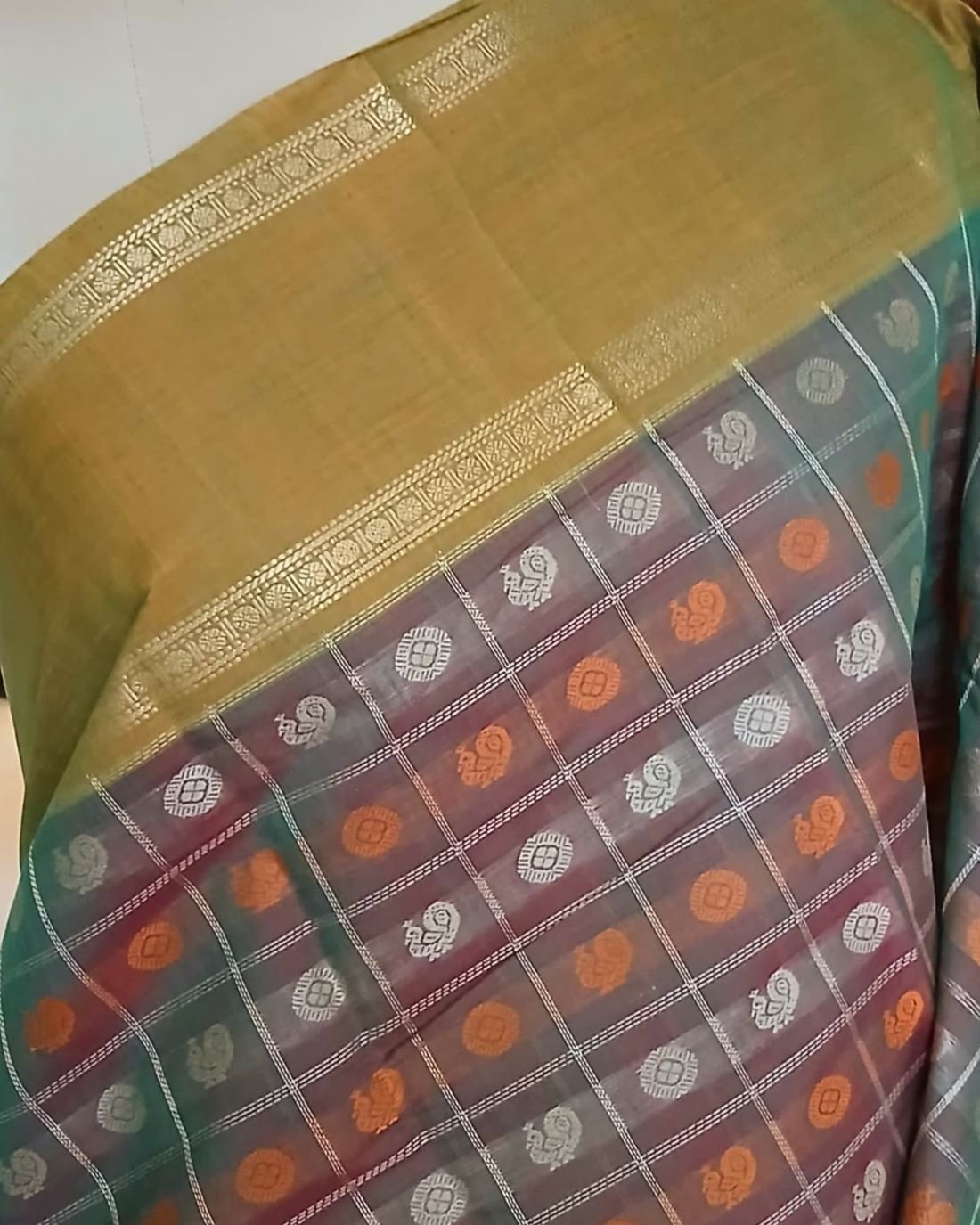 Ayiram Butta Kanchipuram hand weave in cotton with beautiful mustard border highlighted by zari. The palla has zari stripes with mayil motif. There is no zari in the body of this saree. The buttis are in rudraksham and mayil motifs, and the base colour is a two tone.