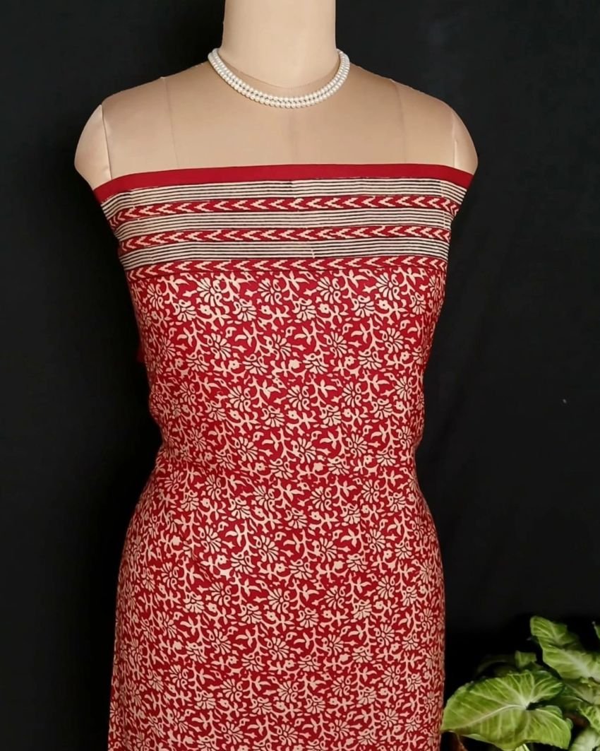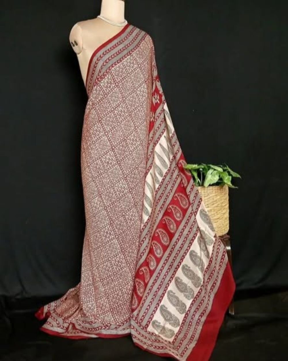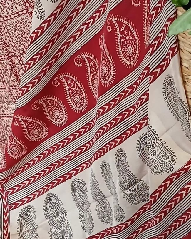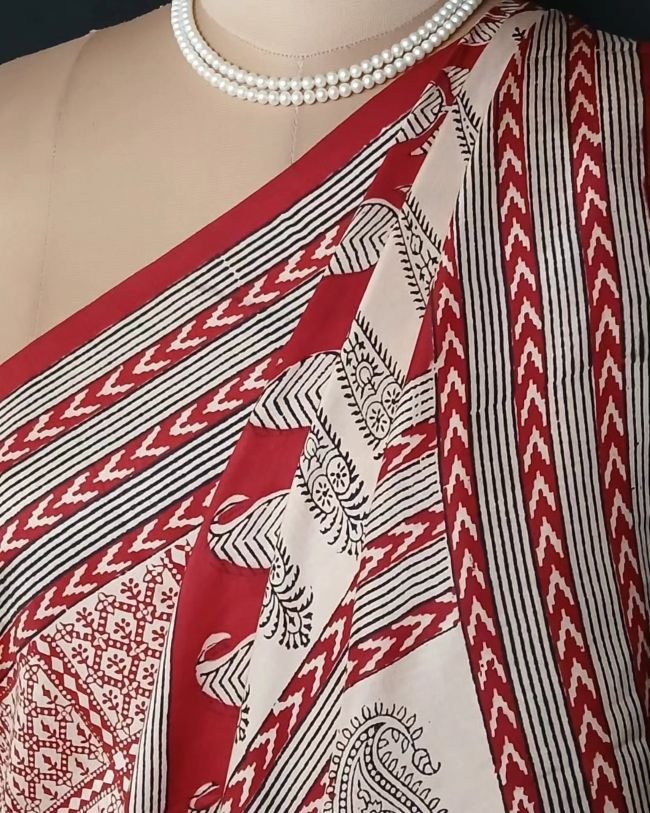 The base saree is pure mulberry silk, on which printing has been done using only natural dyes.
