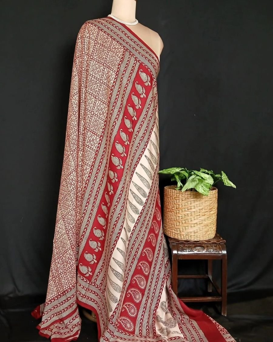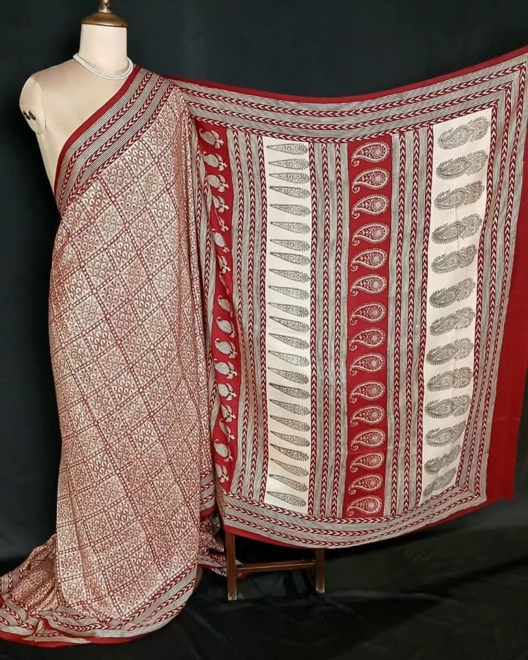 Collector’s Delight: From the workshop of Shilpguru and national award winner Mohammed Yusuf Khatri of Bagh, a high-quality hand block saree in traditional Bagh colours.