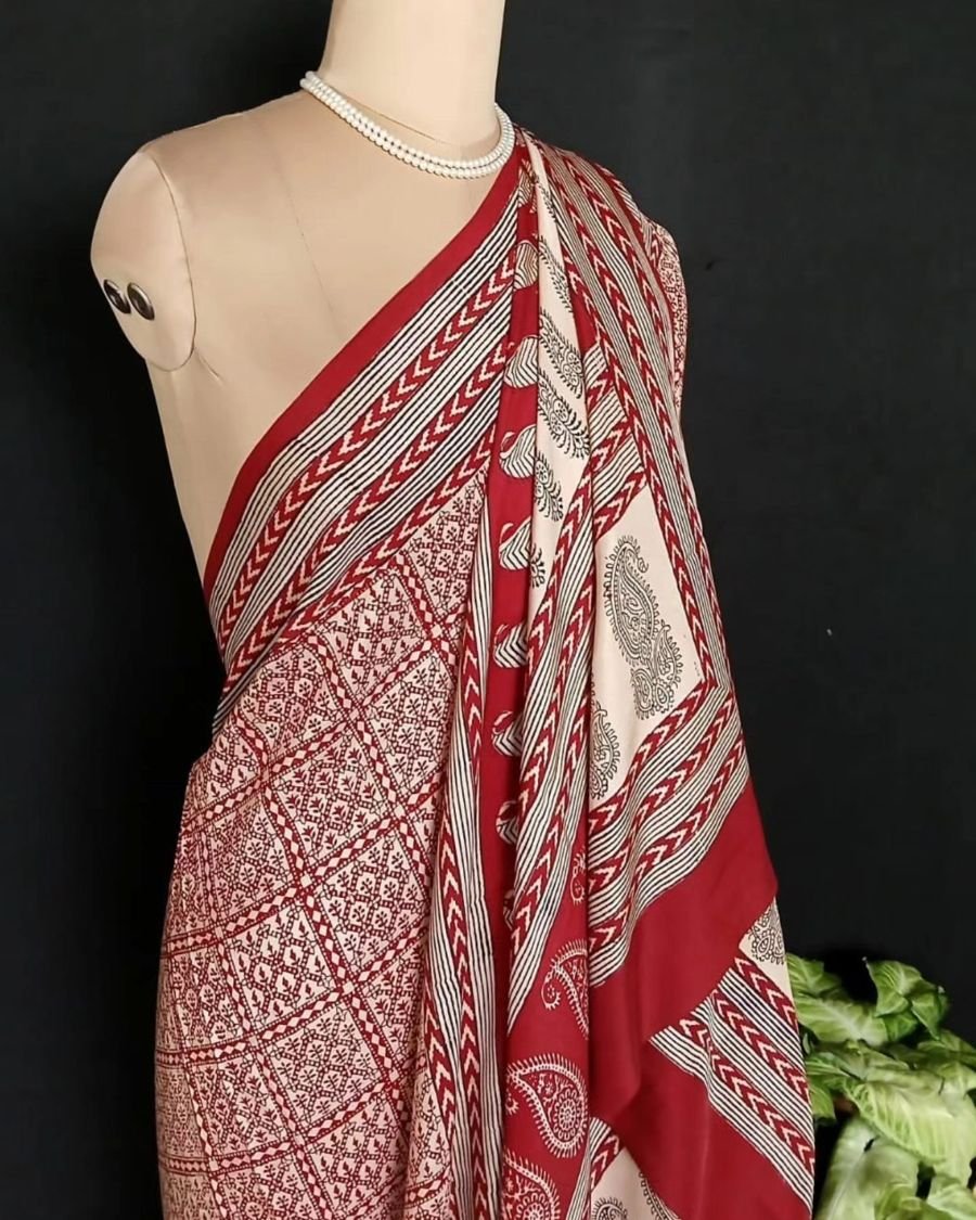 Smoothly flowing saree, elegant, and suitable for formal and informal occasions, from boardrooms to conferences to parties.