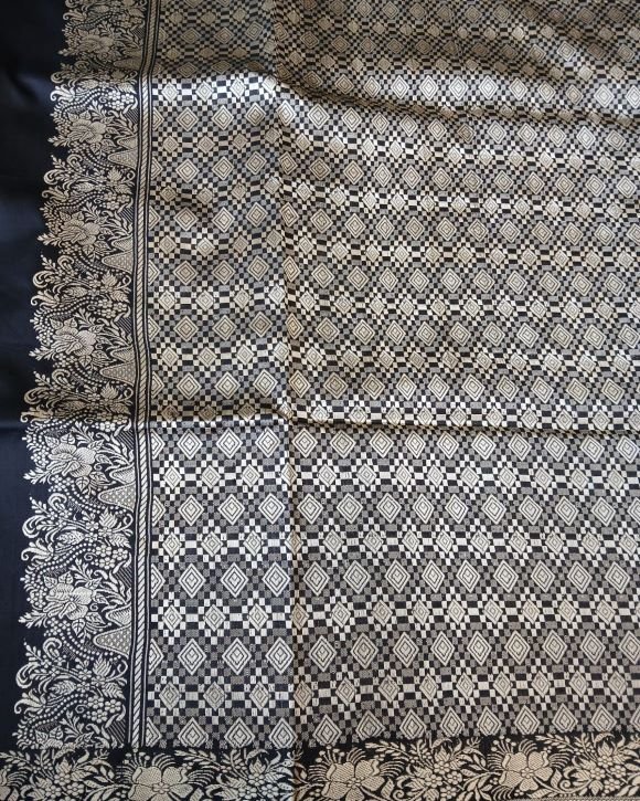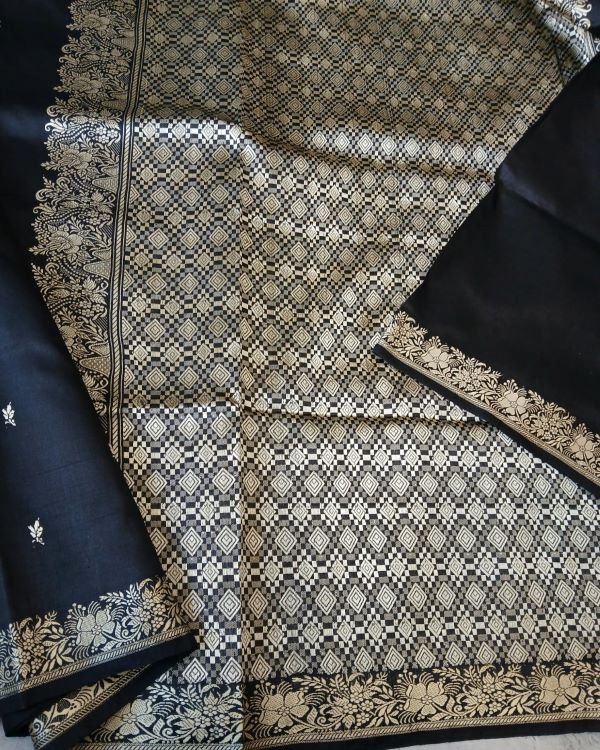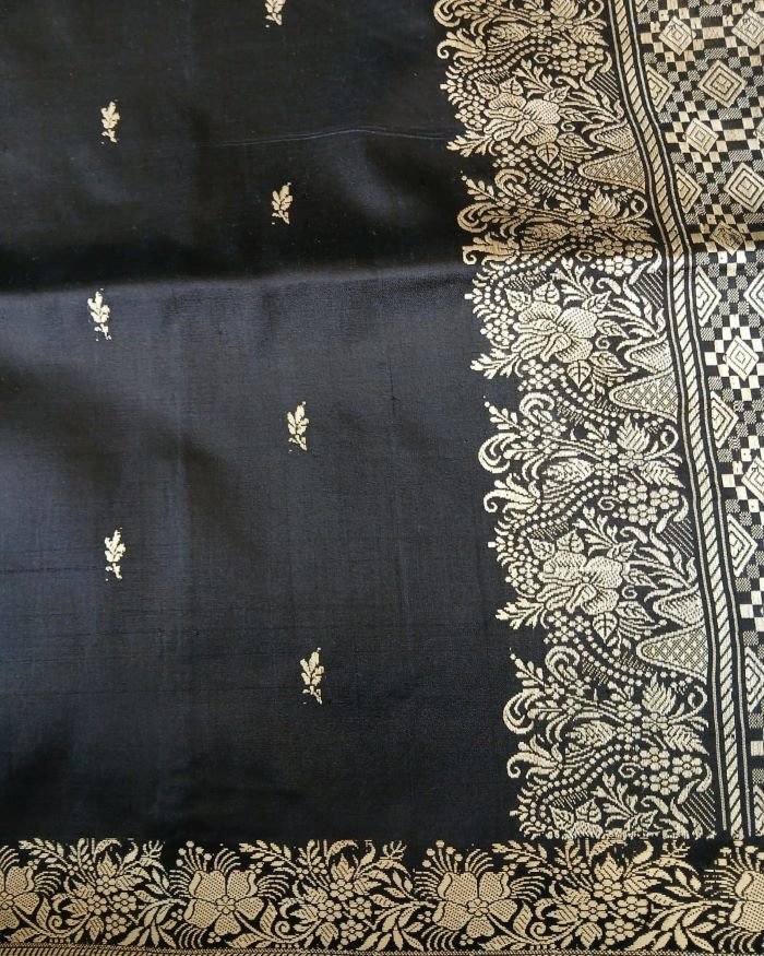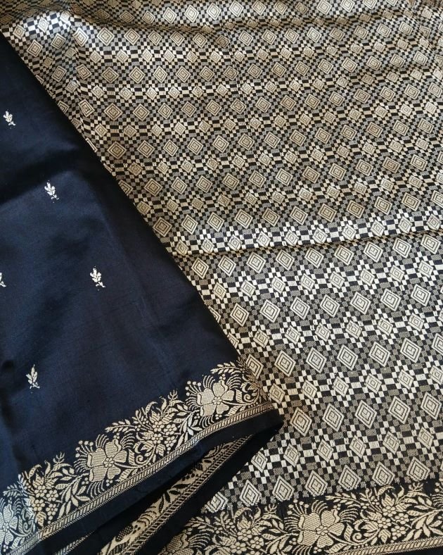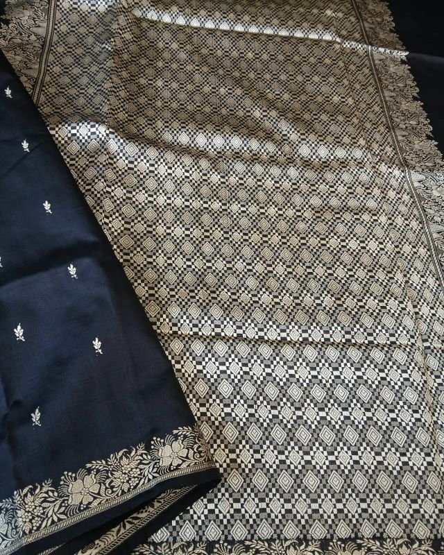 No Zari Banarsi pure katan silk sarees with resham (silk thread) border and palla. Buttis handwoven in kadua technique.