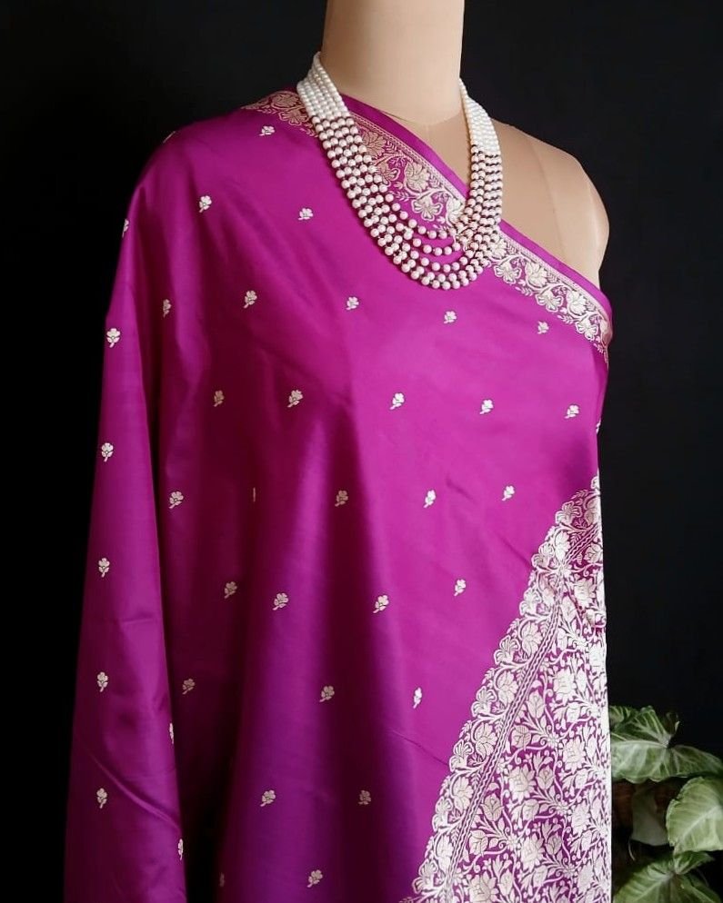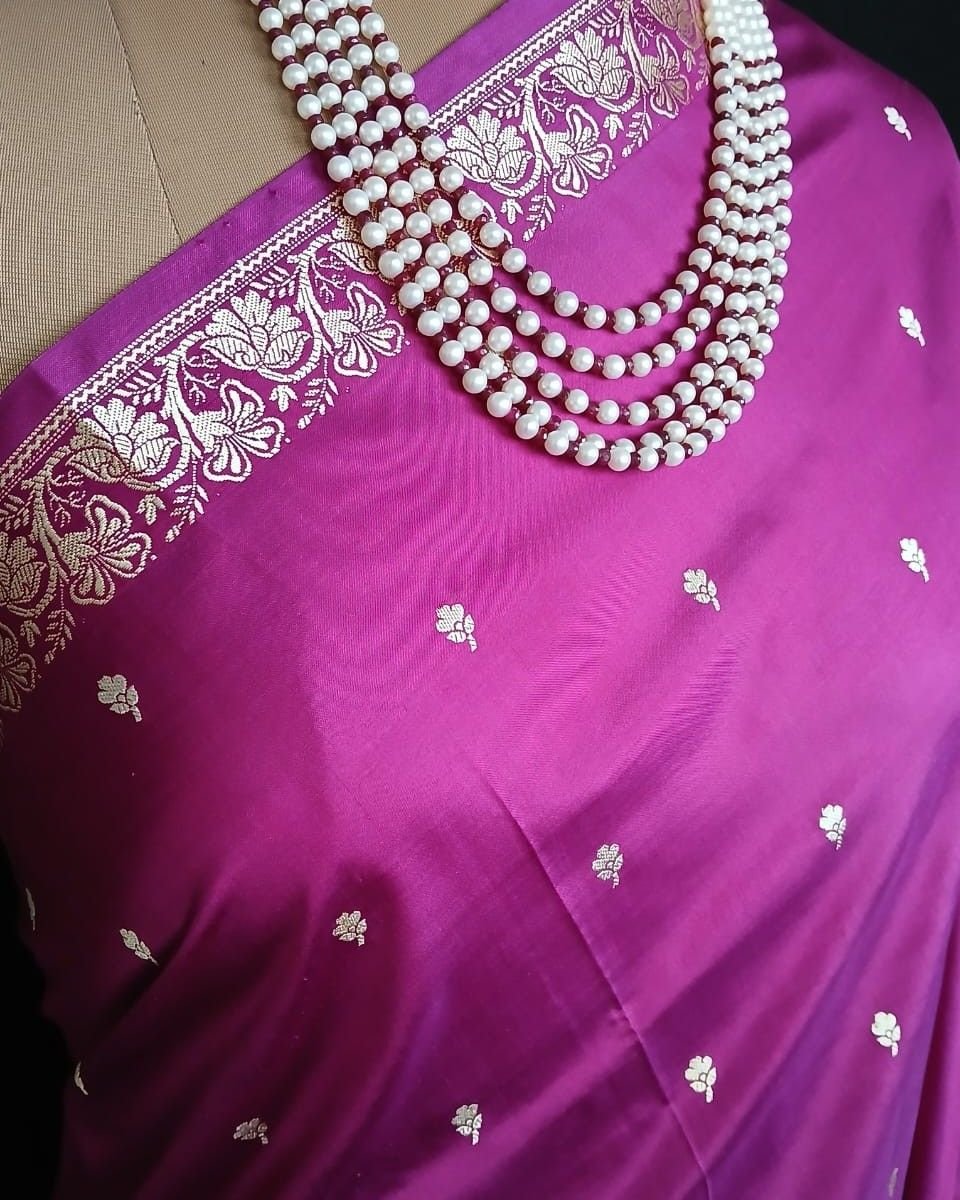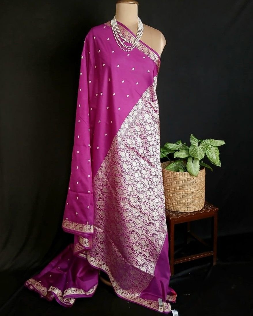 No Zari Banarasi pure katan silk sarees with resham (silk thread) border and palla. Buttis handwoven in kadua technique.