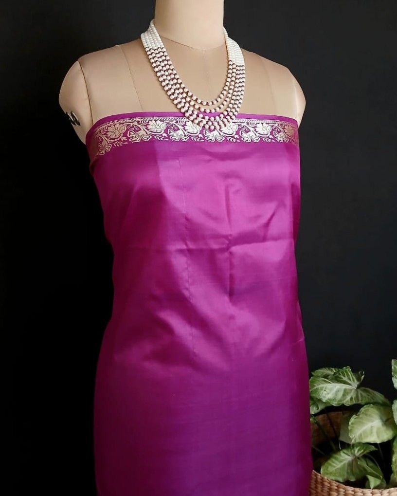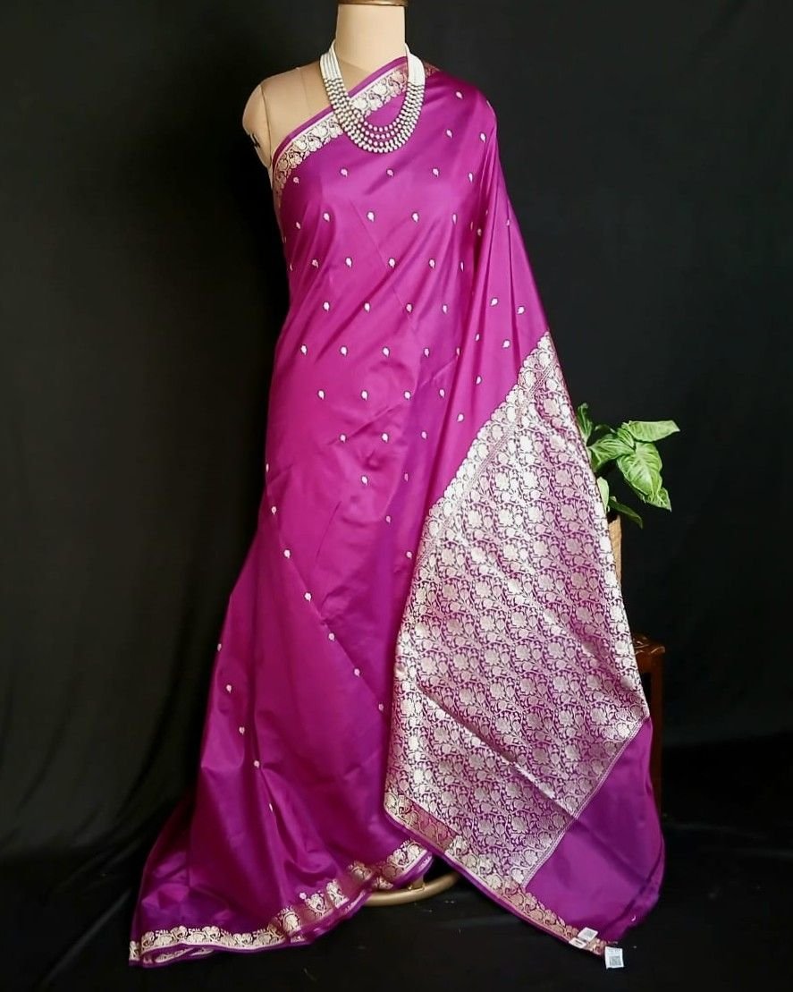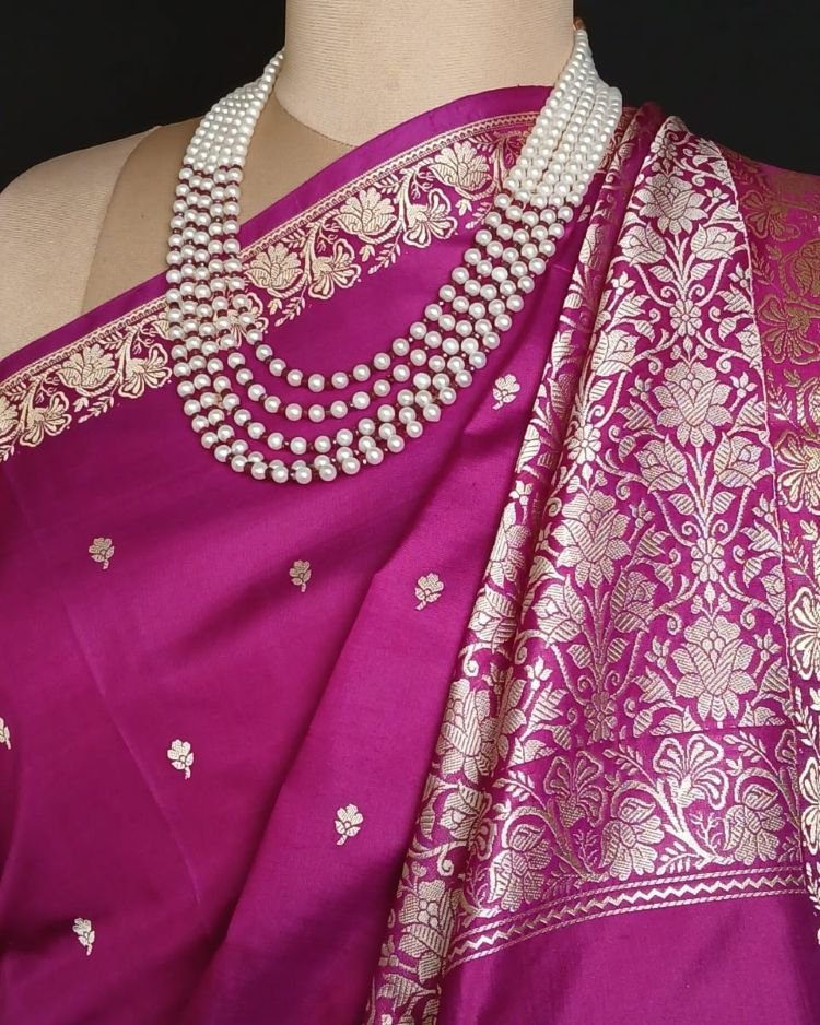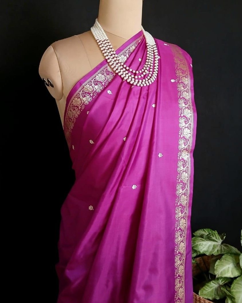No Zari Banarasi pure katan silk sarees with resham (silk thread) border and palla. Buttis handwoven in kadua technique.