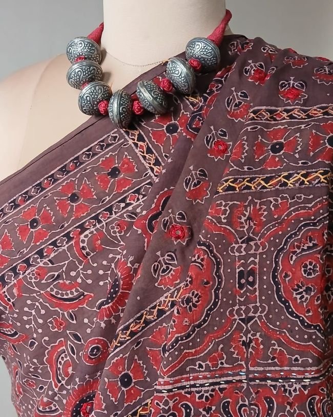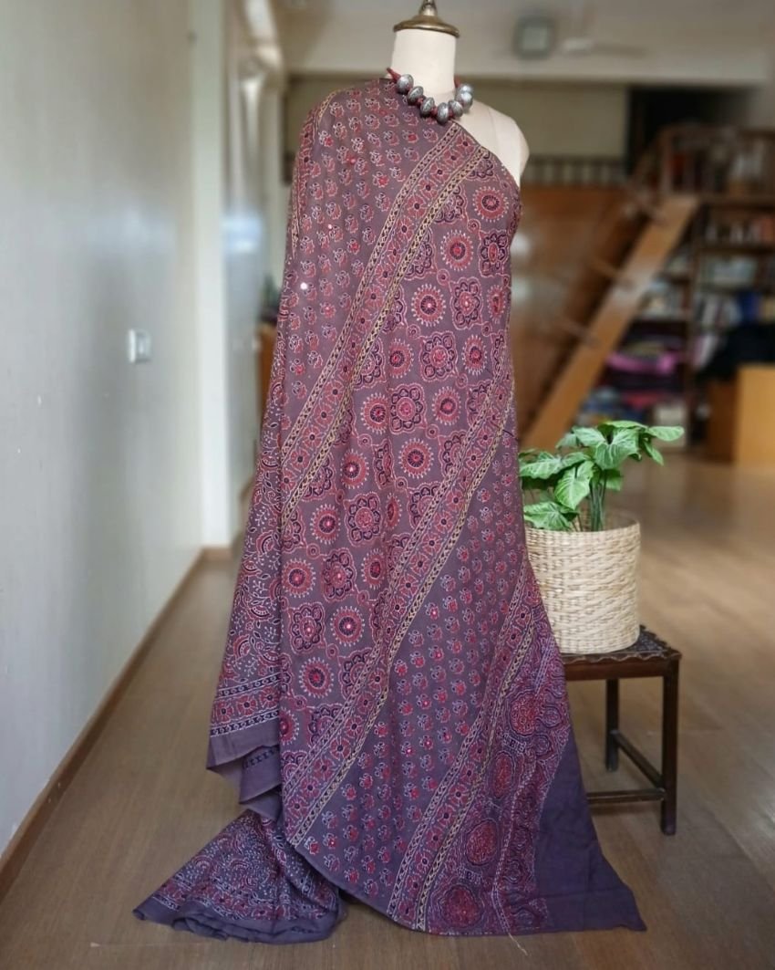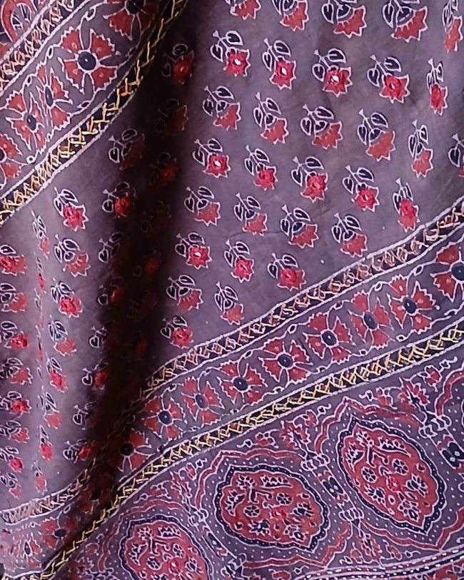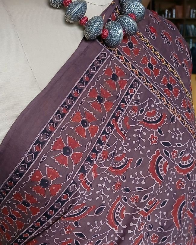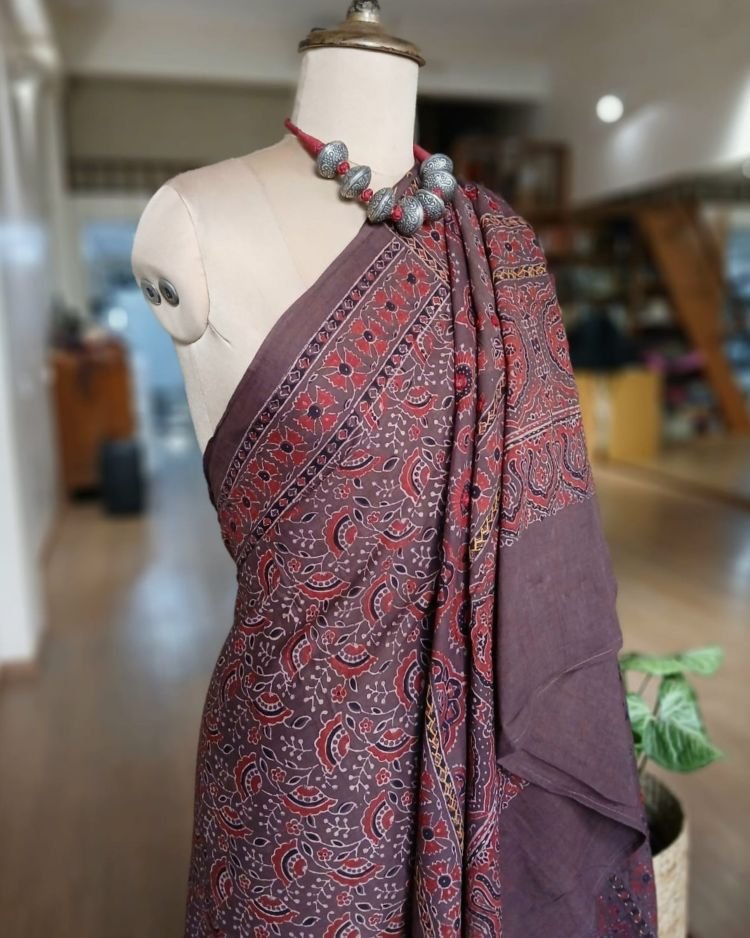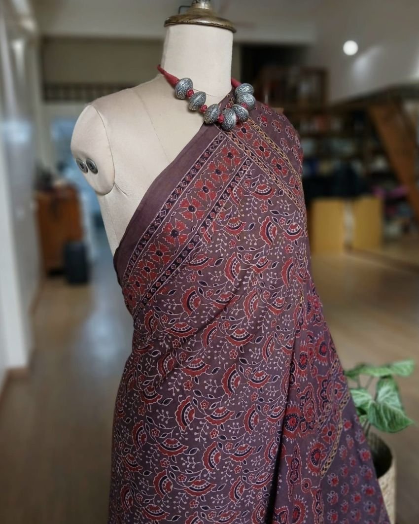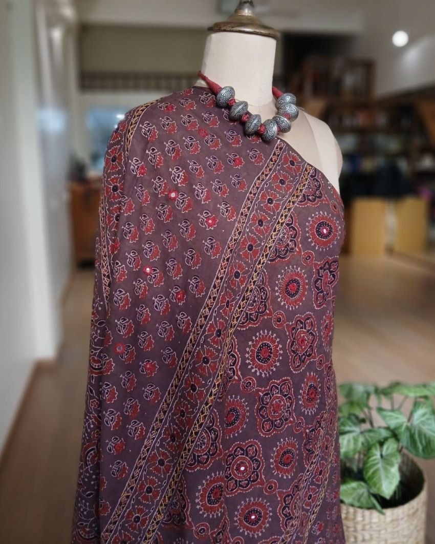 Barmer Handblock Ajrakh in Natural Dyes on Mul Cotton Saree, with hand embroidery on the palla.