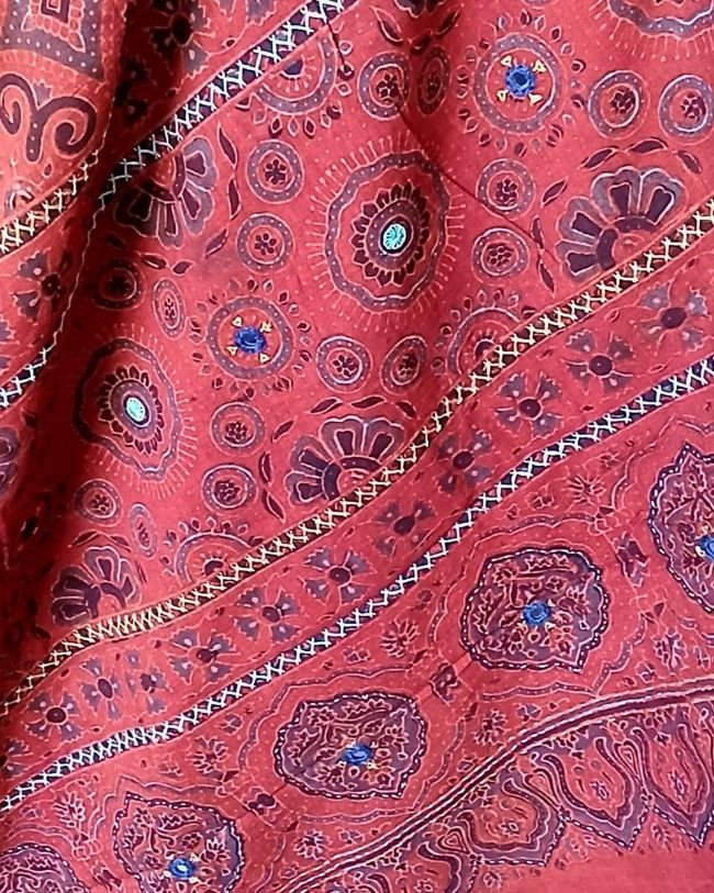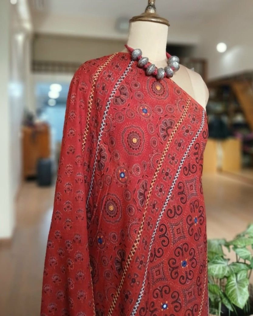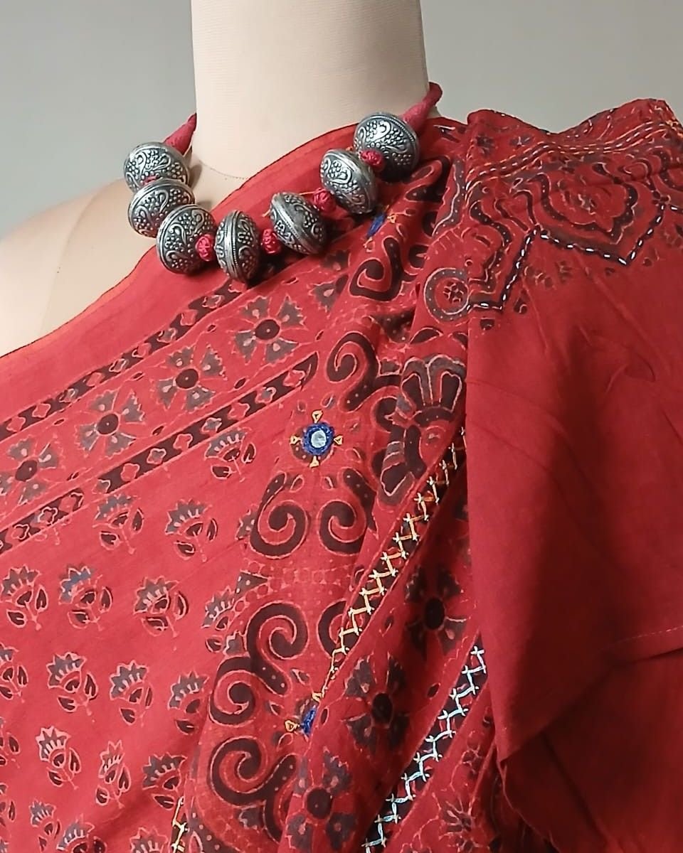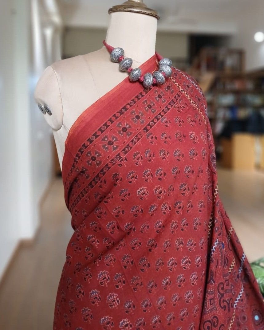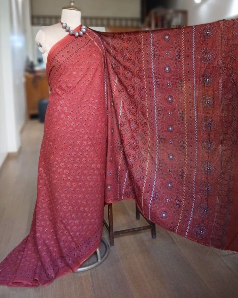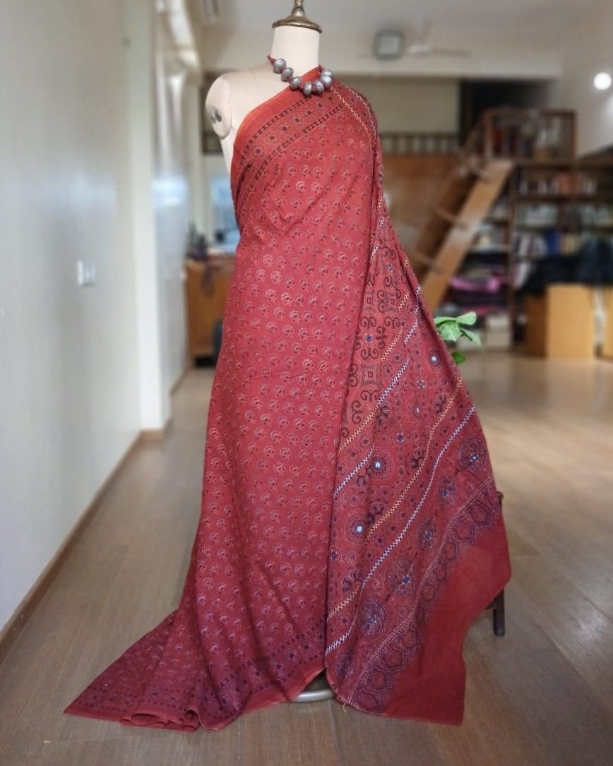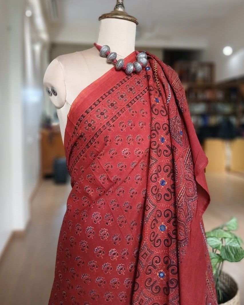 Barmer Handblock Ajrakh in Natural Dyes on Mul Cotton Saree, with hand embroidery on the palla.