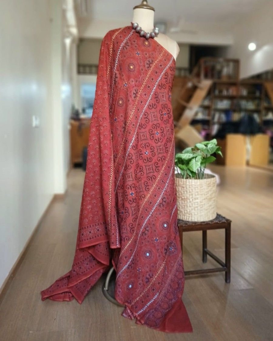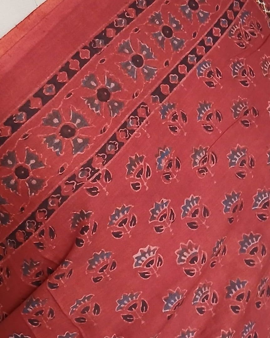 Barmer Handblock Ajrakh in Natural Dyes on Mul Cotton Saree. See more details below