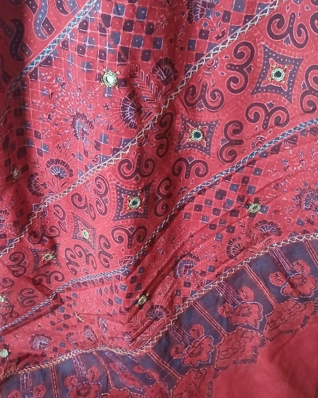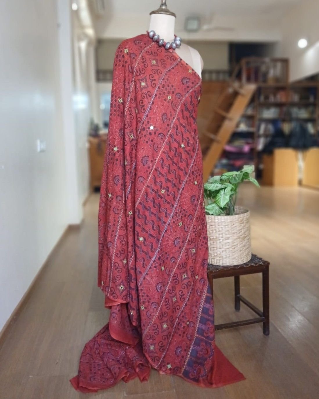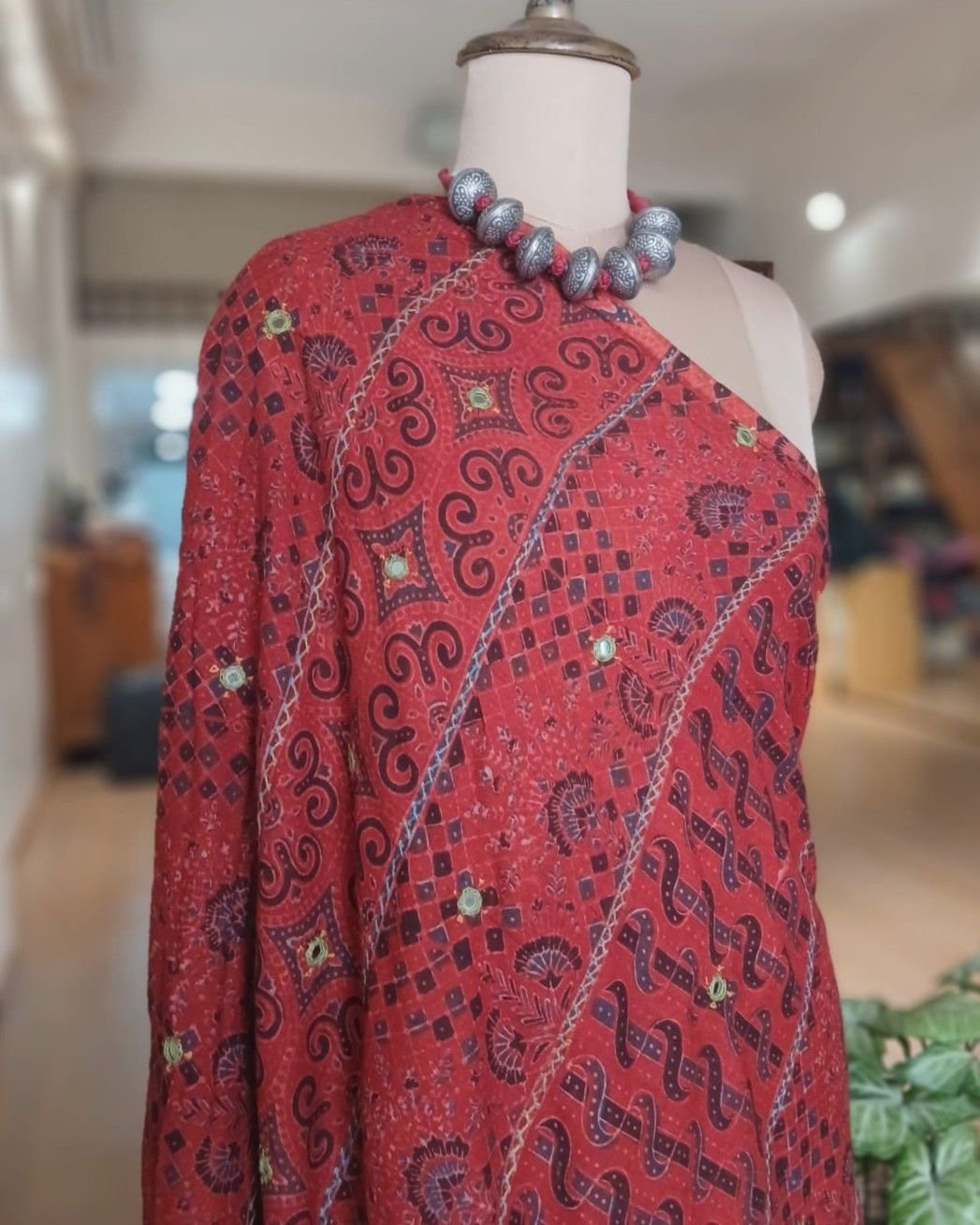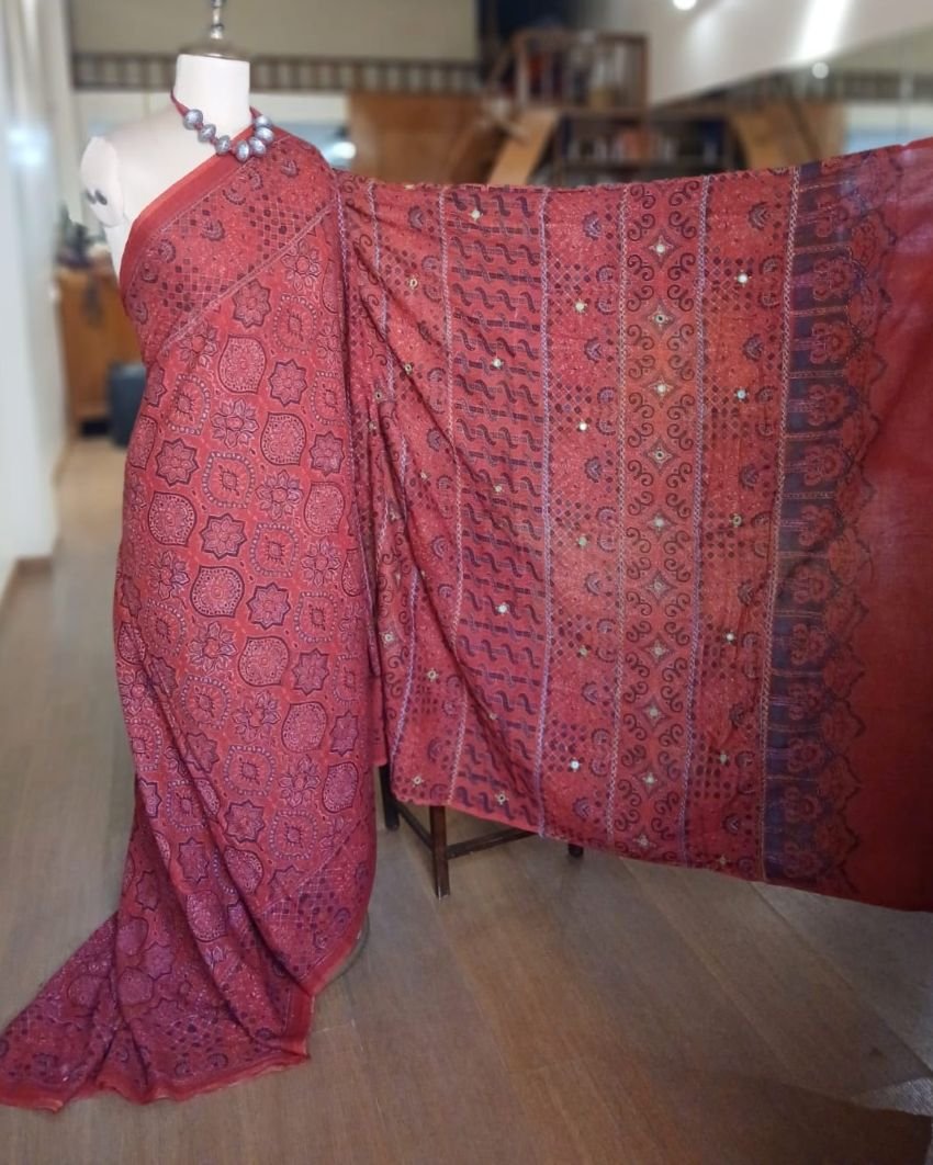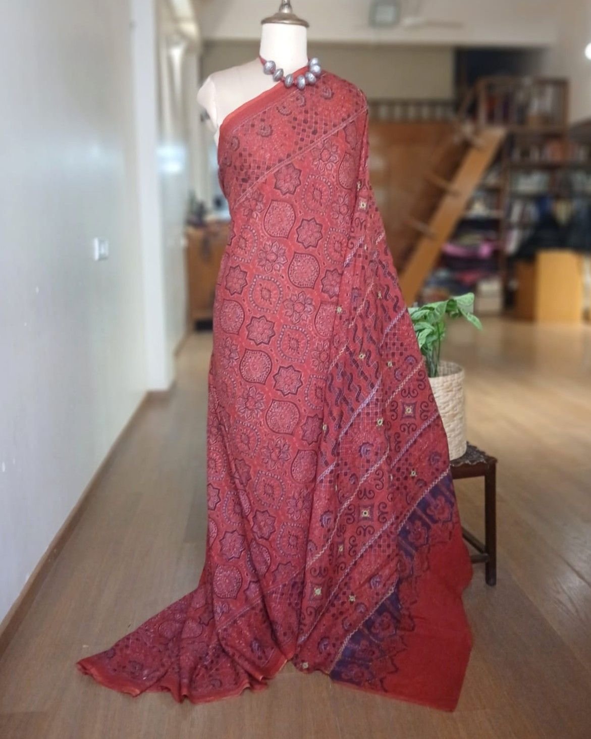 Barmer Handblock Ajrakh in Natural Dyes on Mul Cotton Saree, with hand embroidery on the palla.