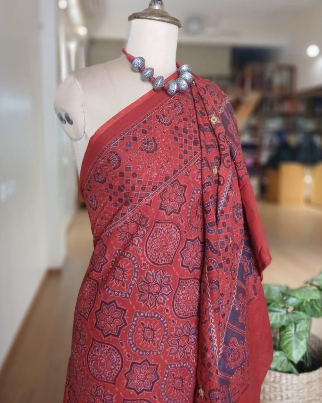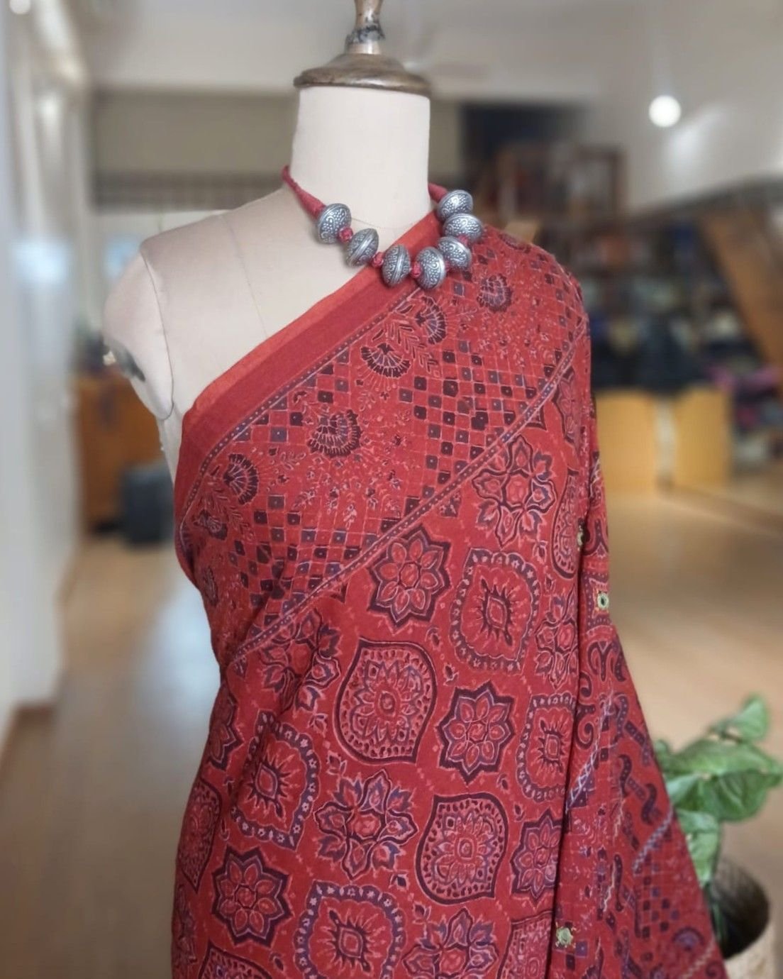 Barmer Handblock Ajrakh in Natural Dyes on Mul Cotton Saree. See more details below