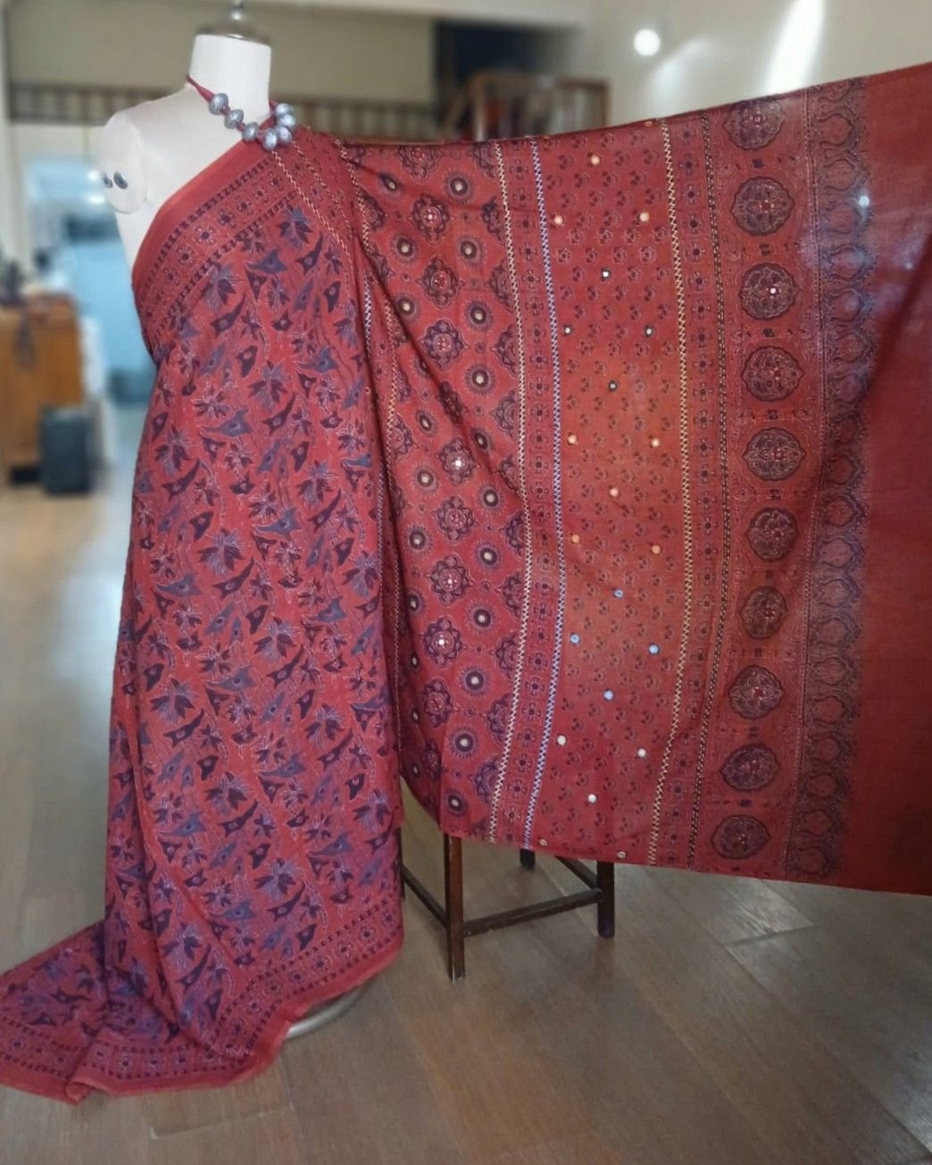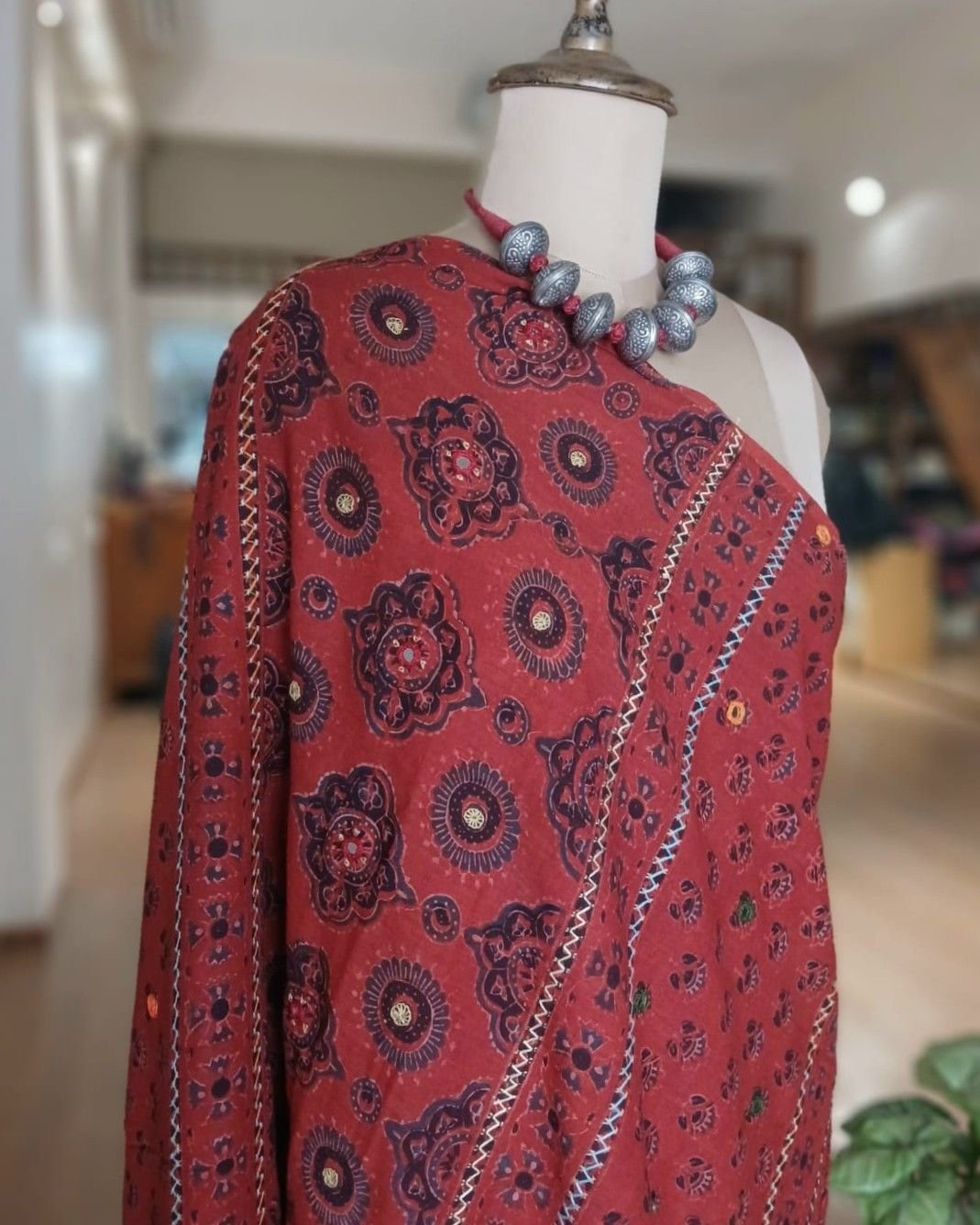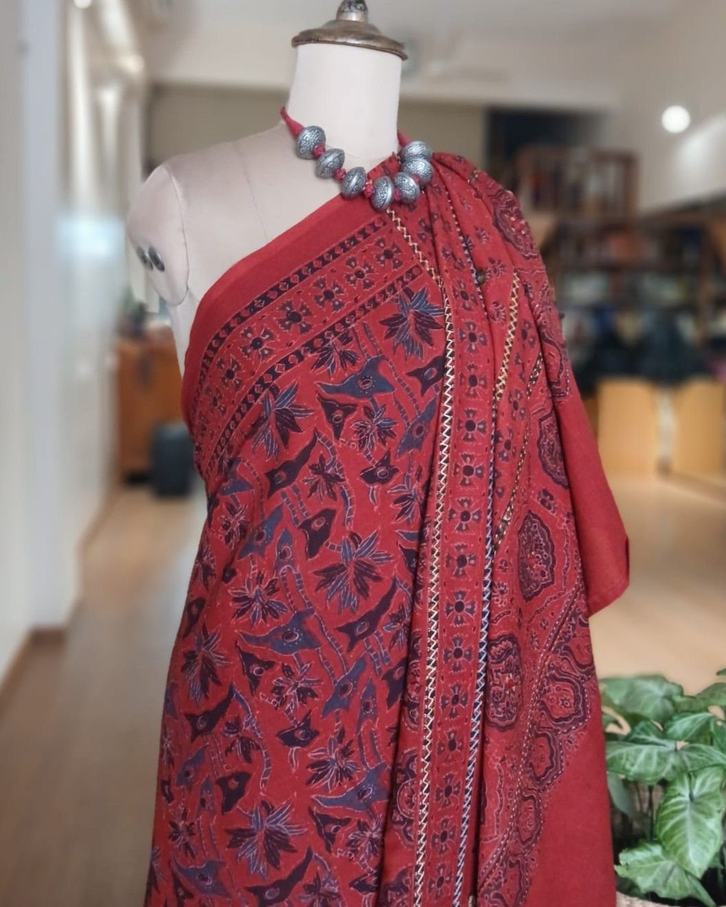Barmer Handblock Ajrakh in Natural Dyes on Mul Cotton Saree, with hand embroidery on the palla.