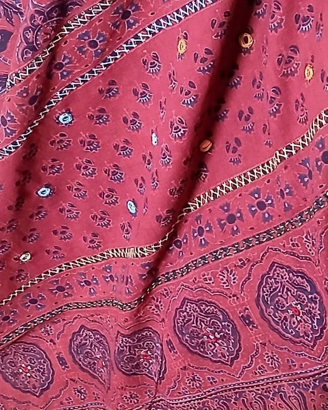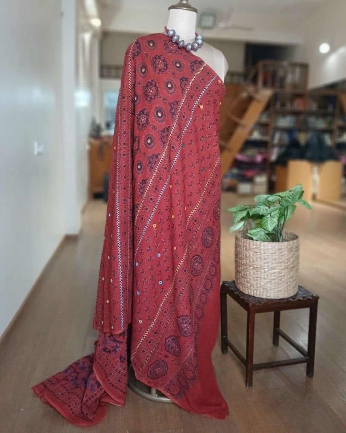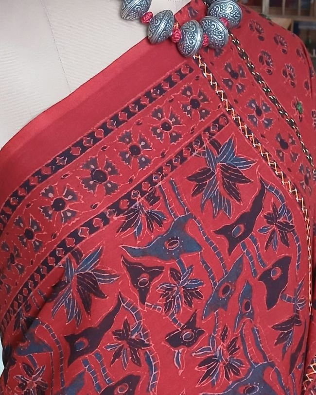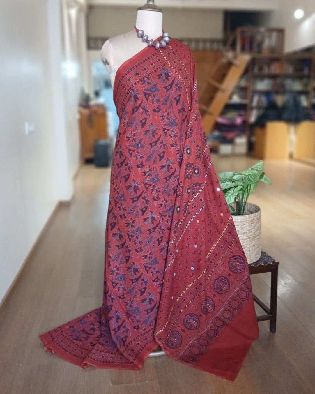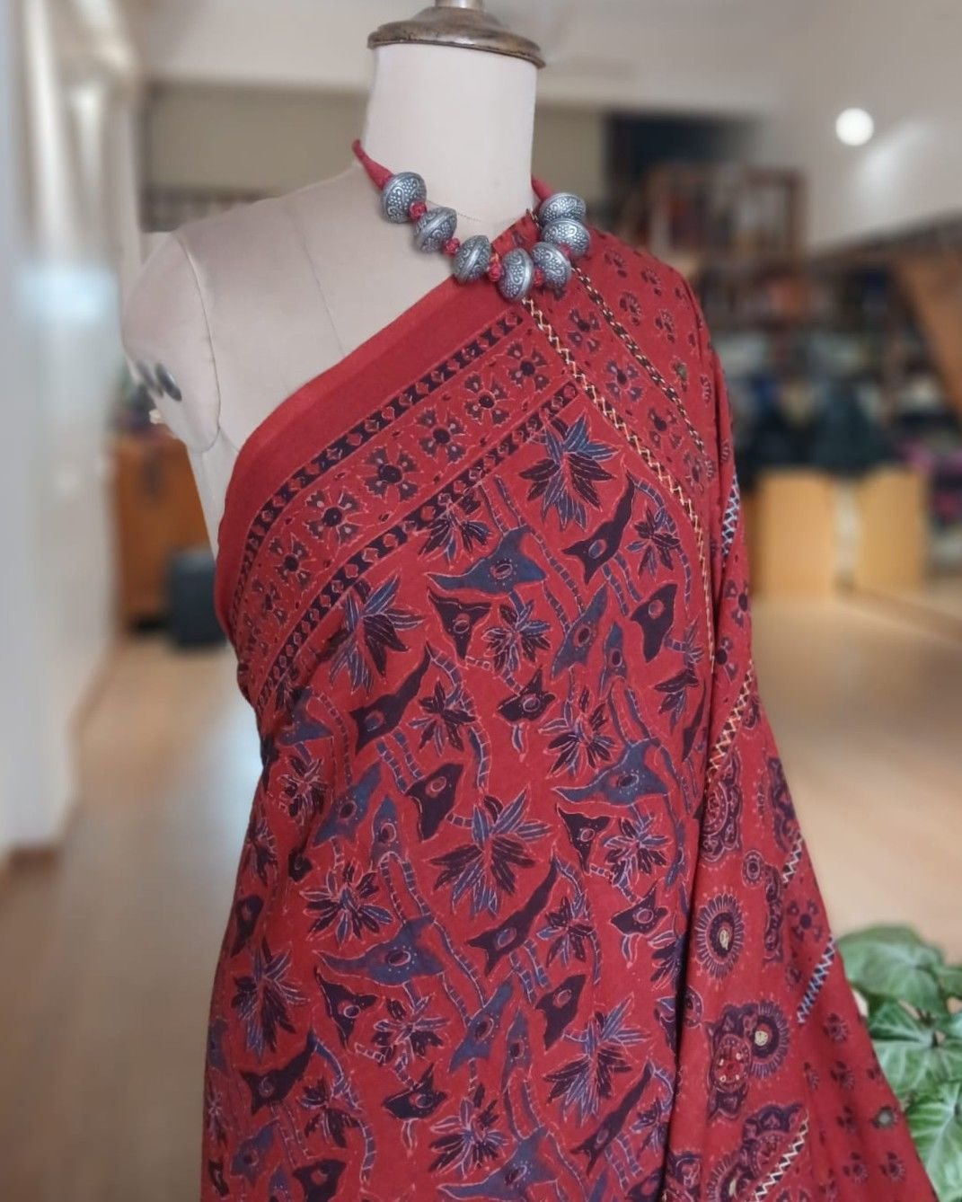 Barmer Handblock Ajrakh in Natural Dyes on Mul Cotton Saree, with hand embroidery on the palla.