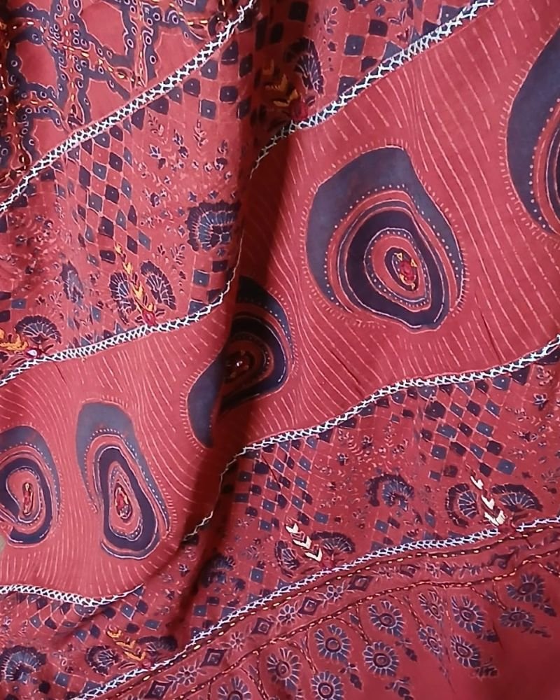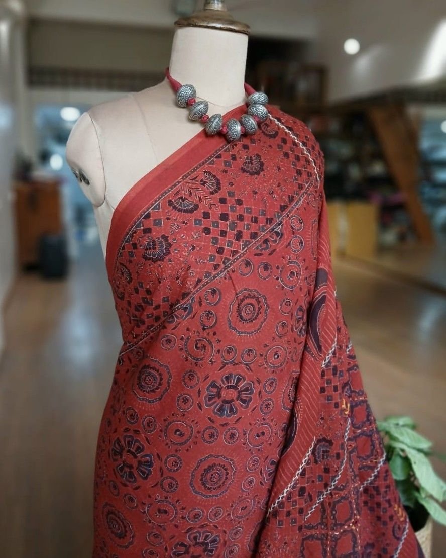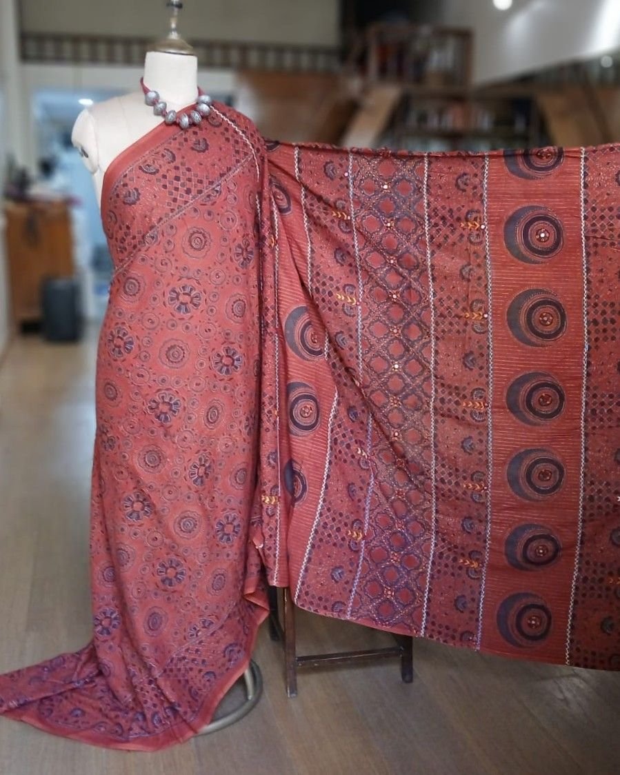 Barmer Handblock Ajrakh in Natural Dyes on Mul Cotton Saree, with hand embroidery on the palla.