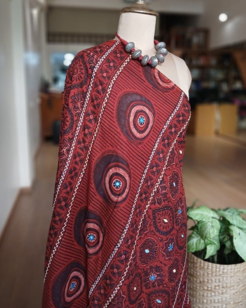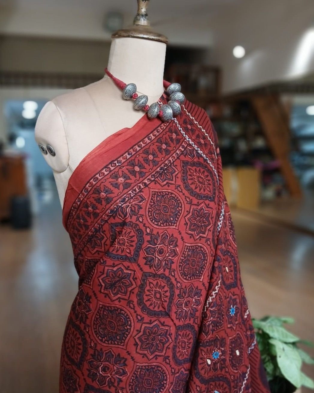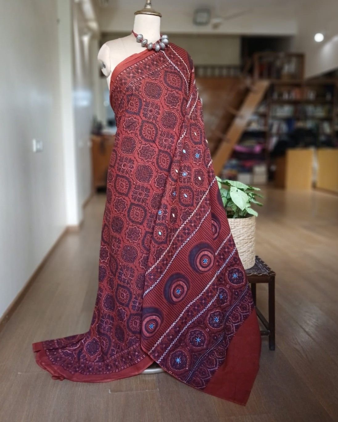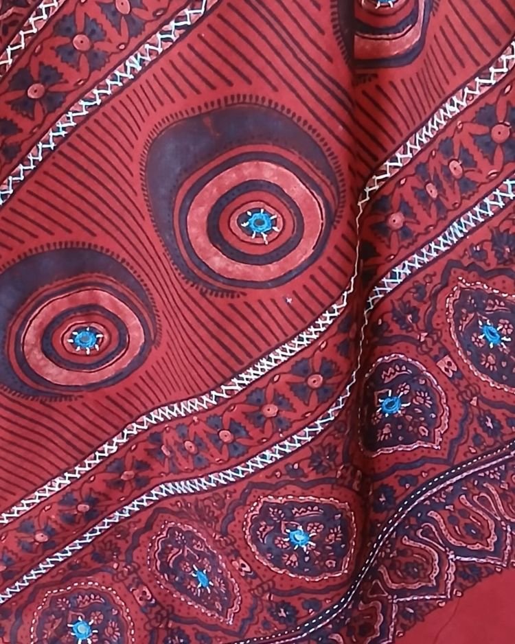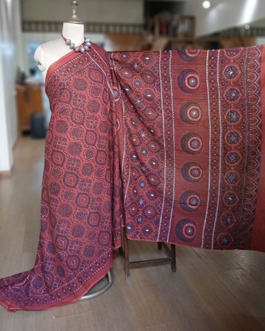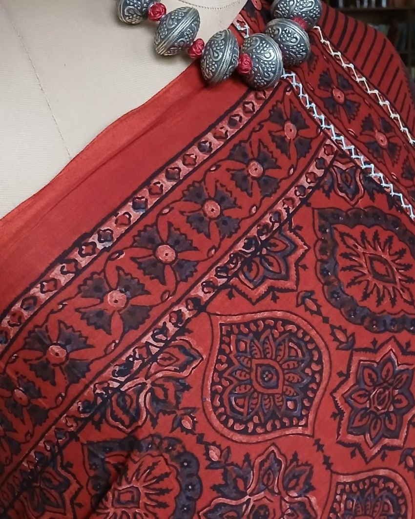 Barmer Handblock Ajrakh in Natural Dyes on Mul Cotton Saree, with hand embroidery on the palla.