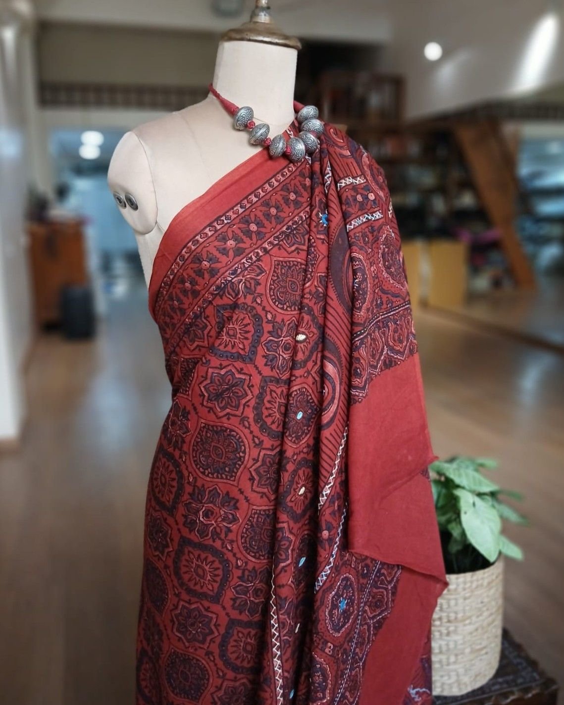 Barmer Handblock Ajrakh in Natural Dyes on Mul Cotton Saree. See more details below