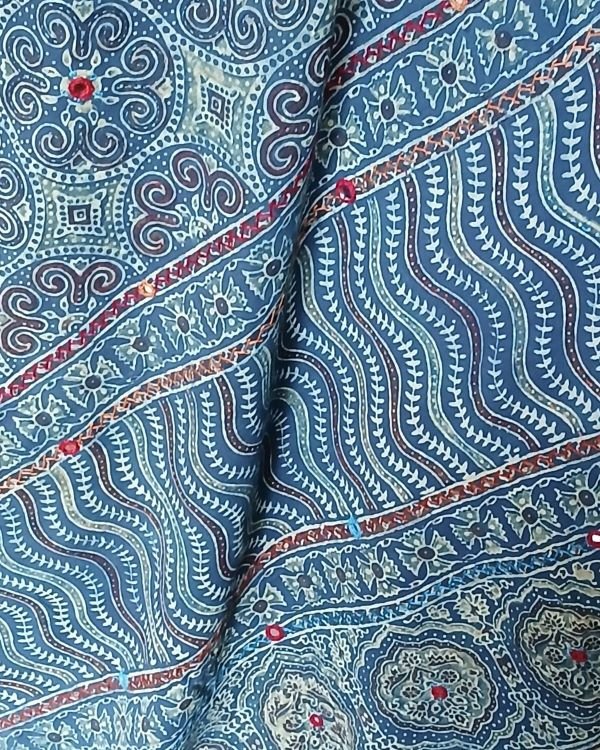 Saree is 6.3 meters in length including a printed Ajrakh blousepiece. Height 45 inches suitable for tall people