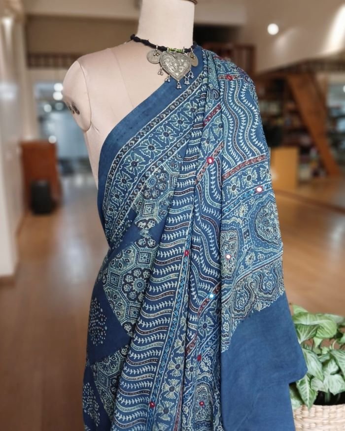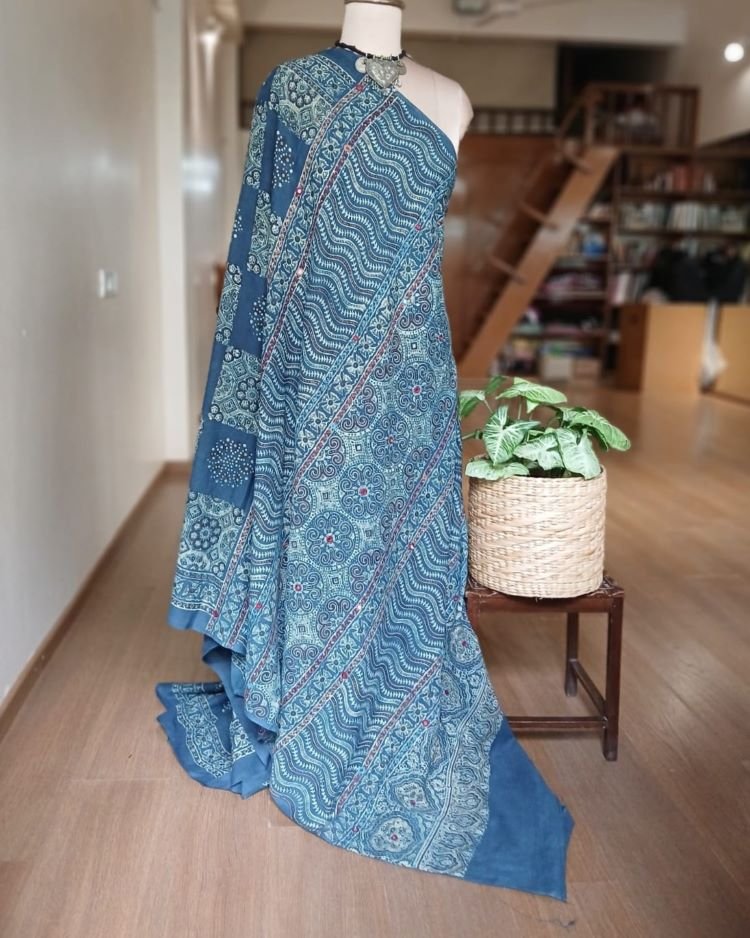Barmer Handblock Ajrakh in Natural Dyes on Mul Cotton Saree, with hand embroidery on the palla.