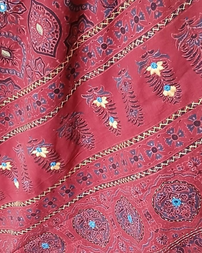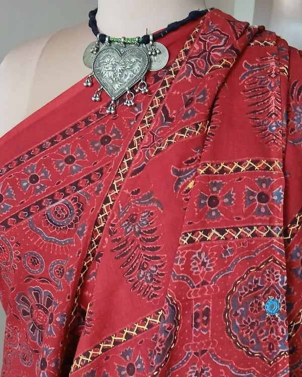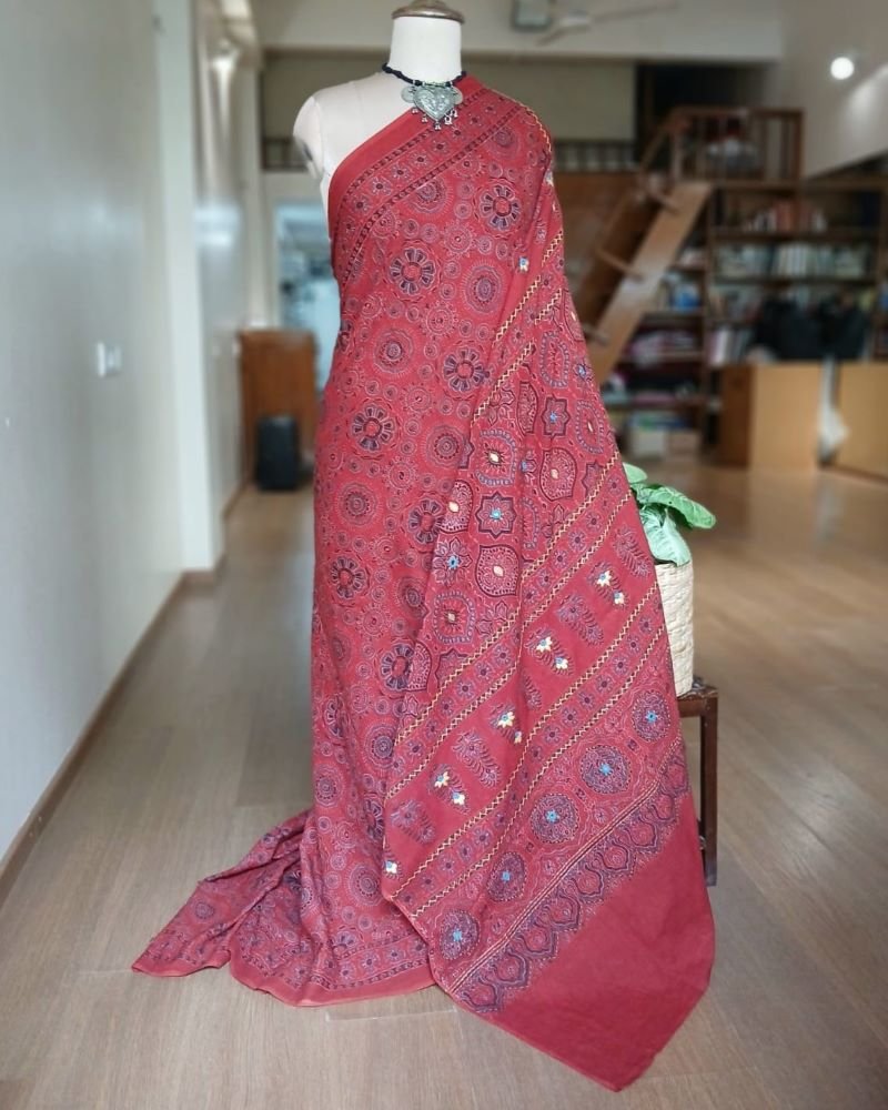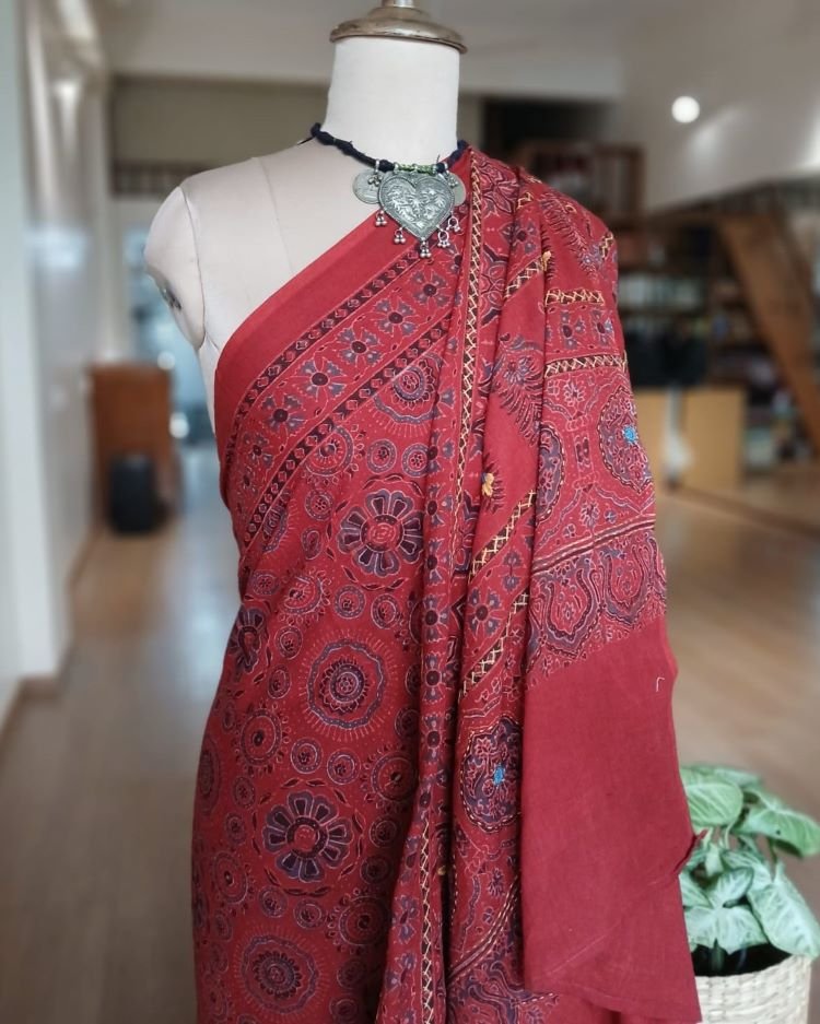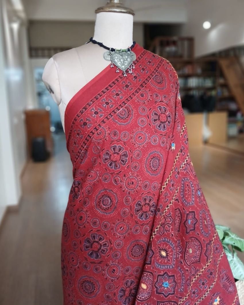 Barmer Handblock Ajrakh in Natural Dyes on Mul Cotton Saree, with hand embroidery on the palla.