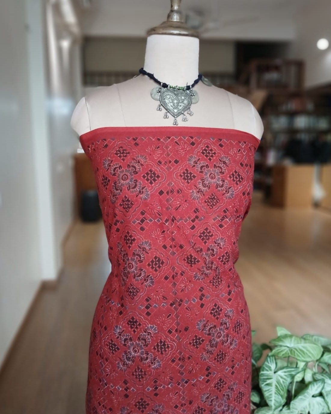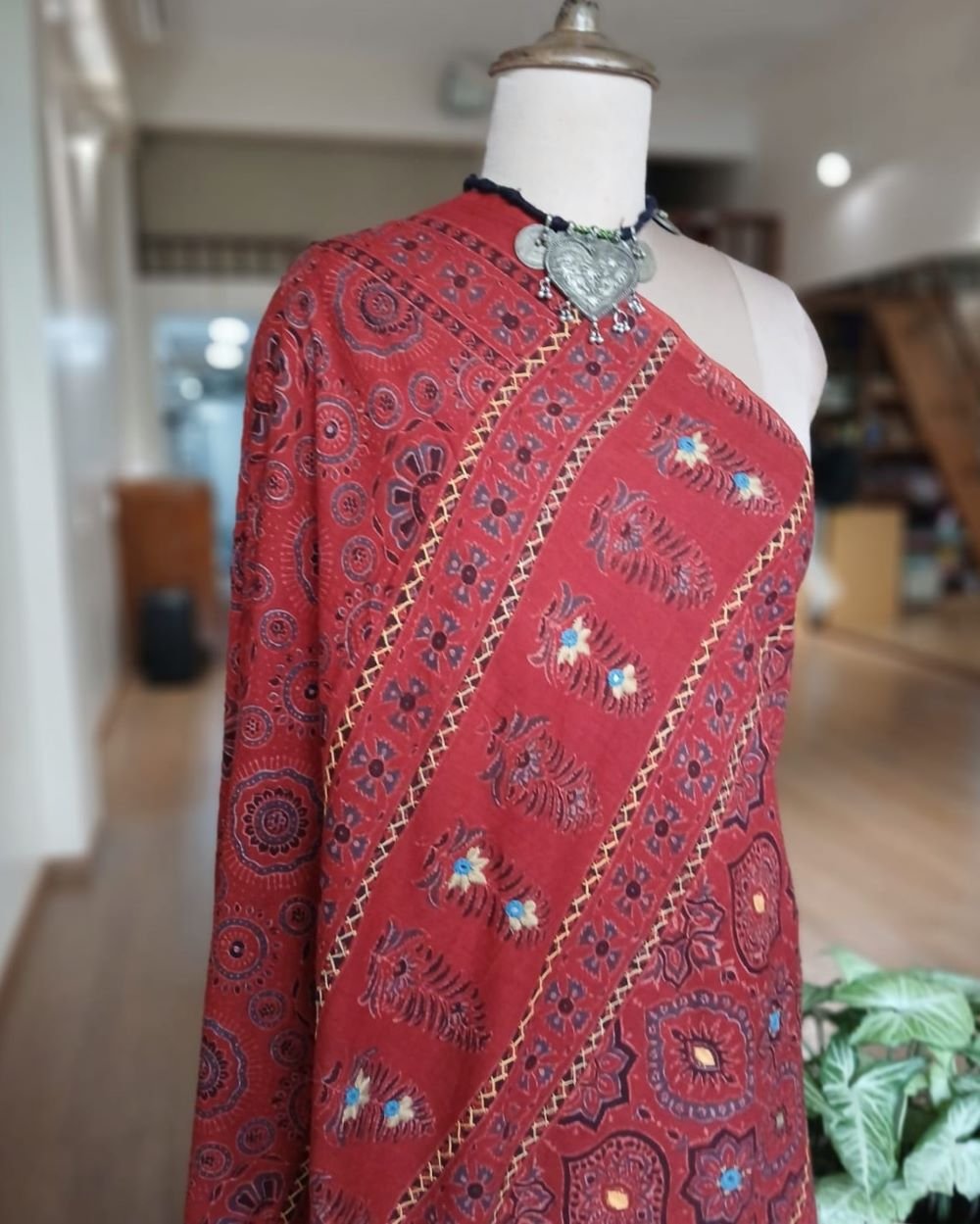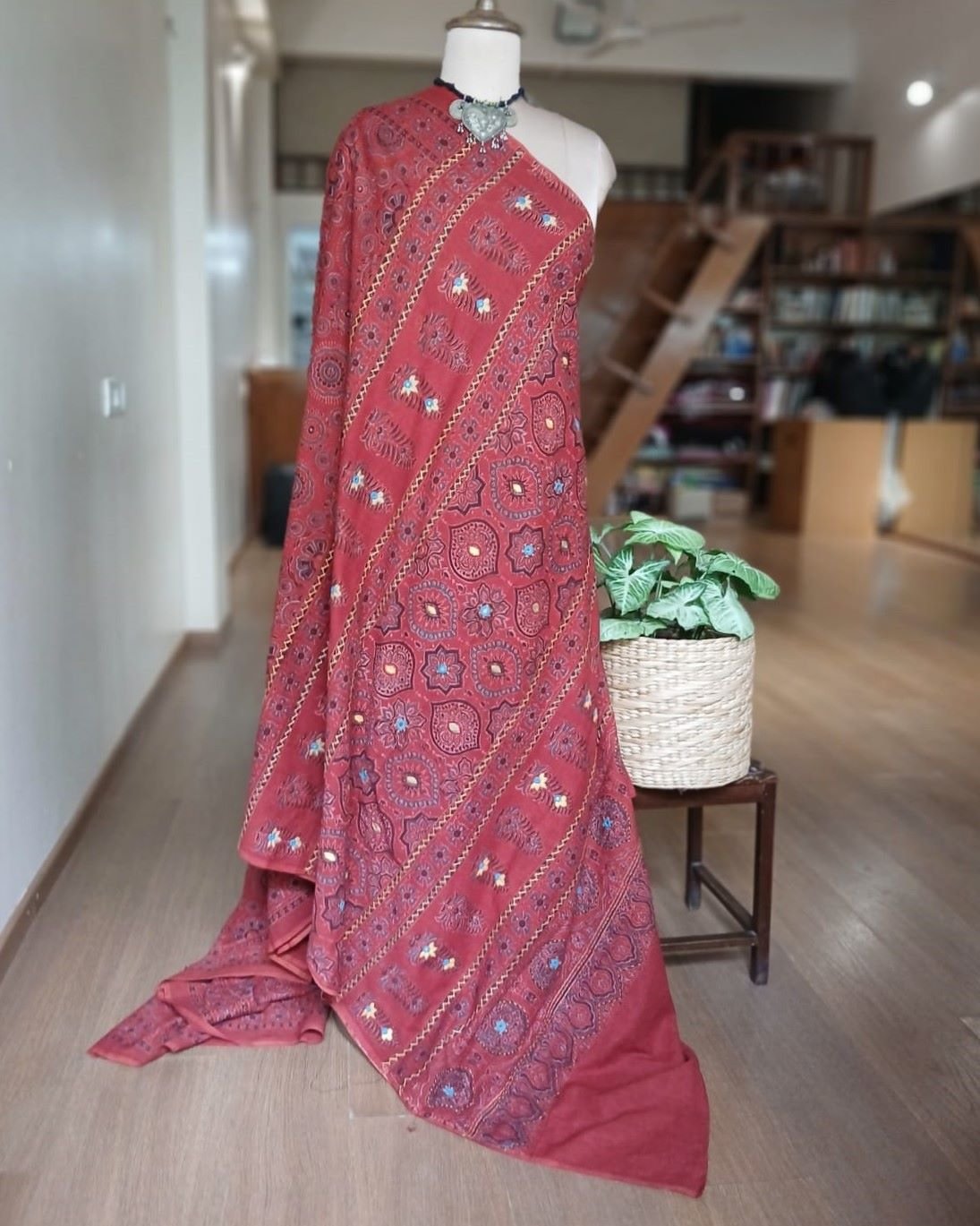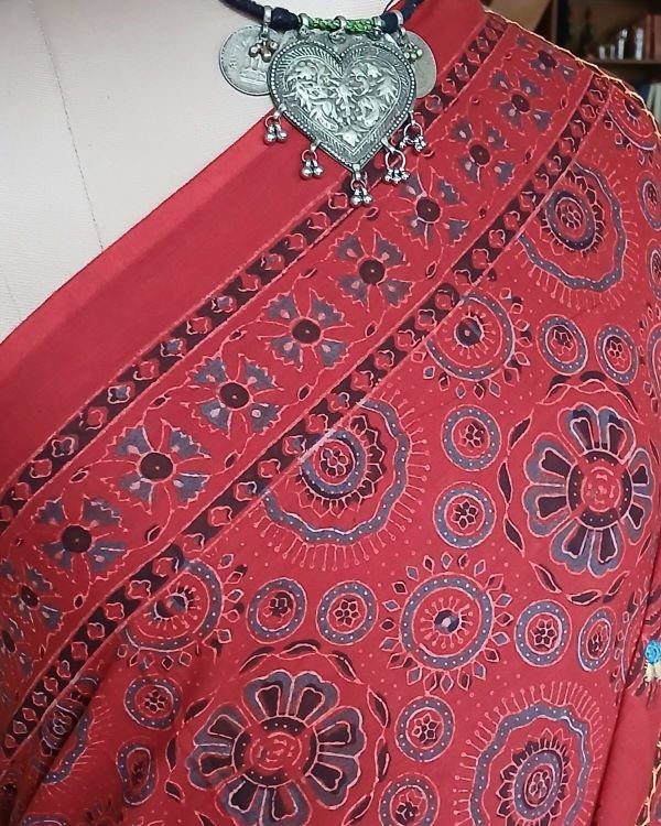 Saree is 6.3 meters in length including a printed Ajrakh blousepiece. Height 45 inches suitable for tall people