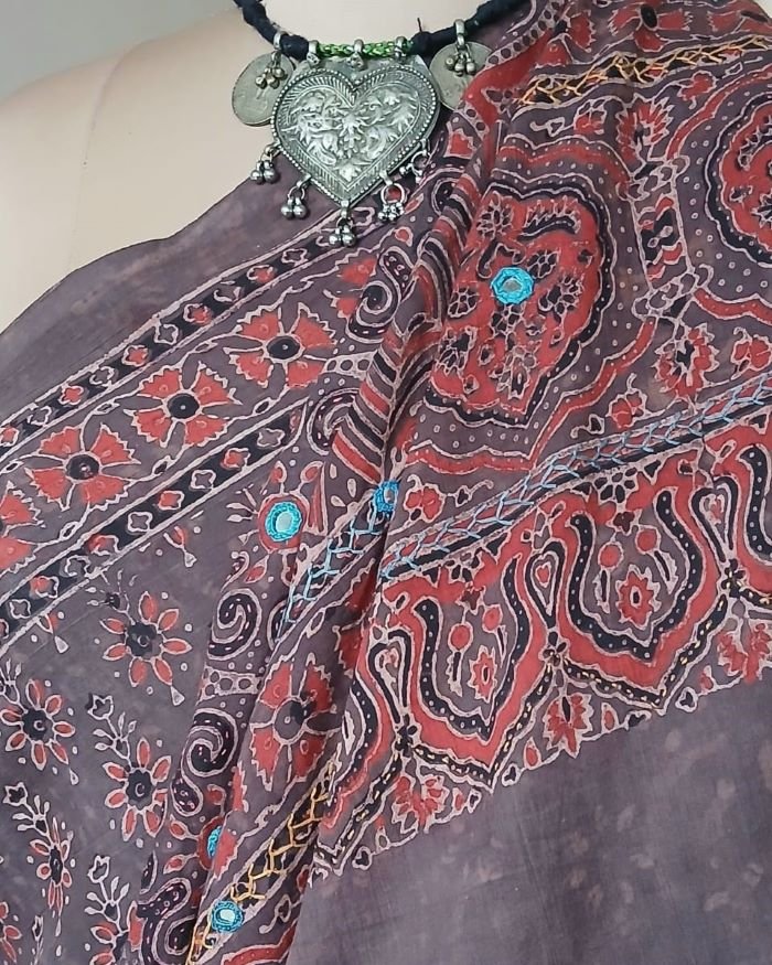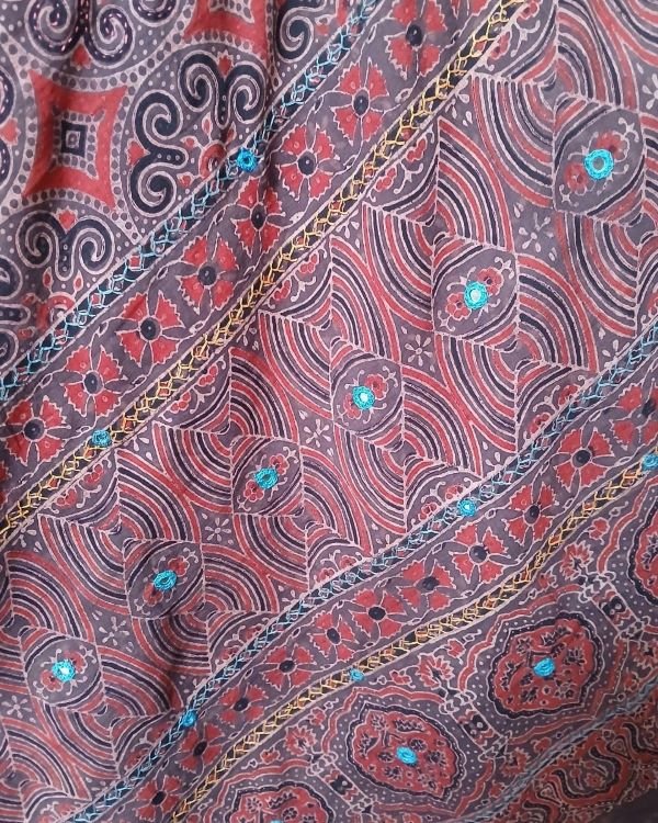 Barmer Handblock Ajrakh in Natural Dyes on Mul Cotton Saree, with hand embroidery on the palla.