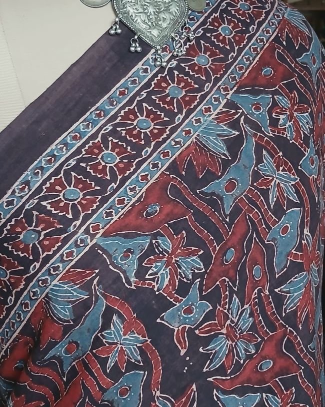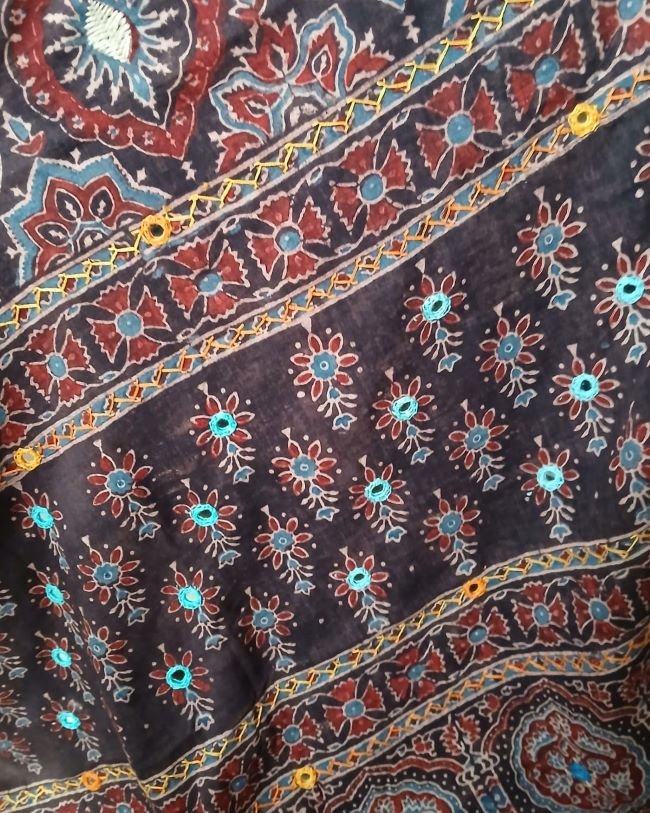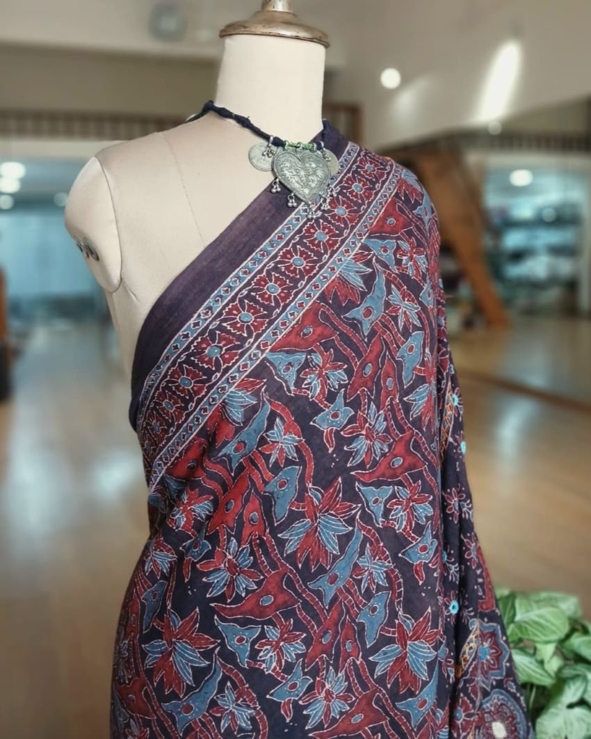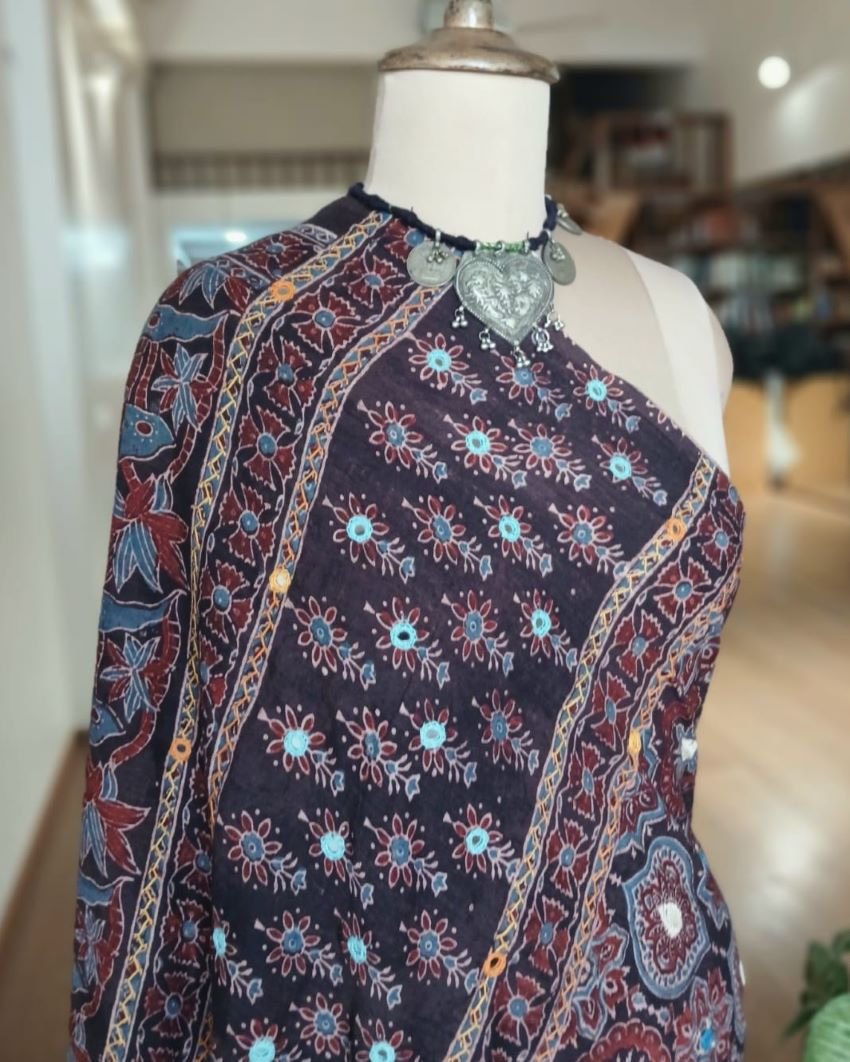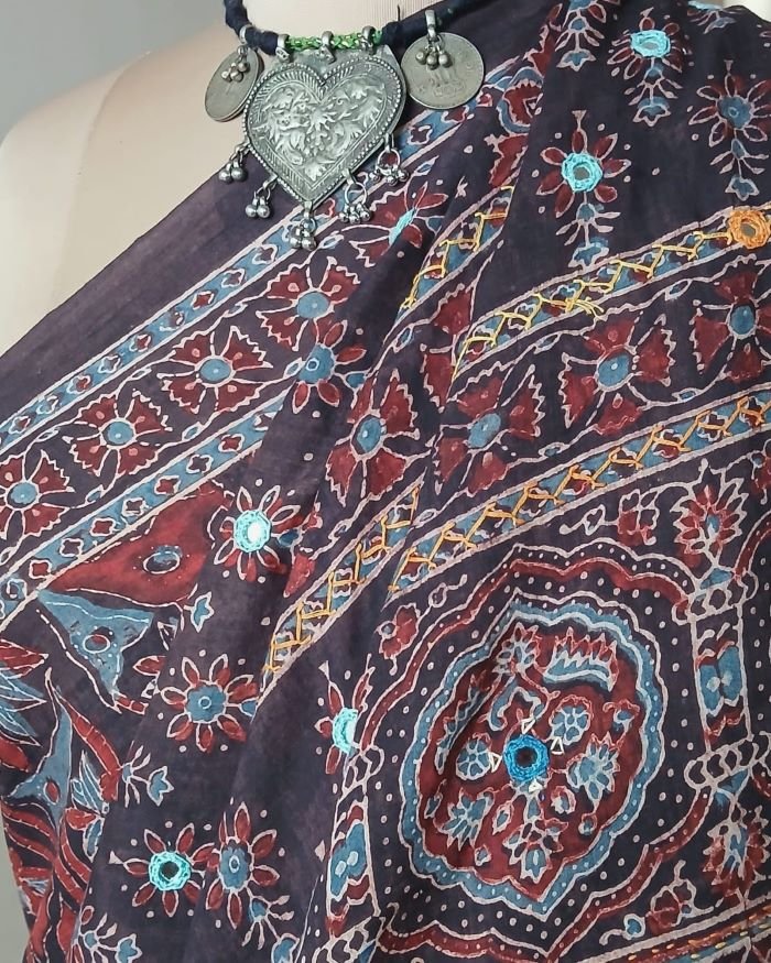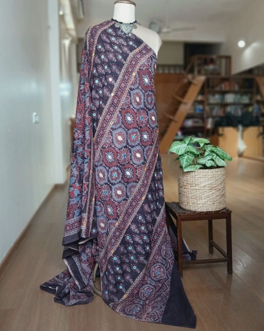 Barmer Handblock Ajrakh in Natural Dyes on Mul Cotton Saree, with hand embroidery on the palla.