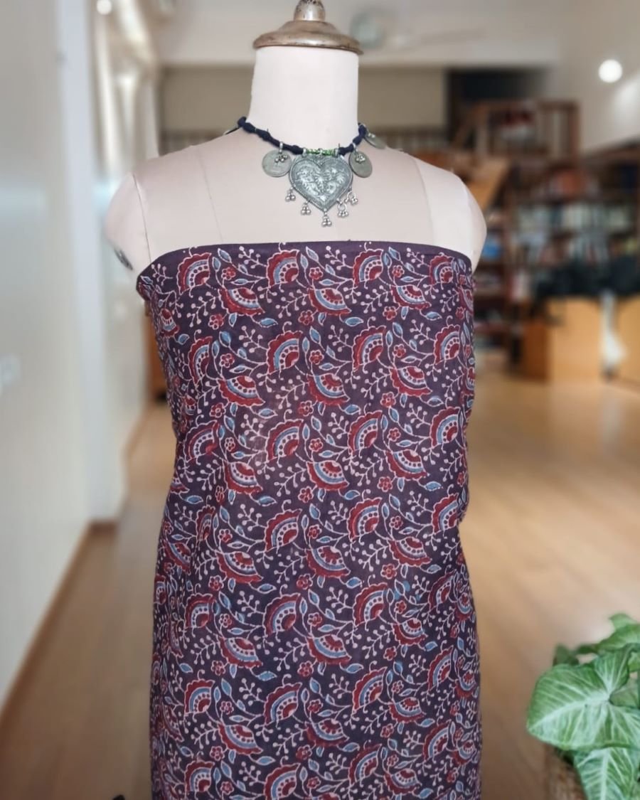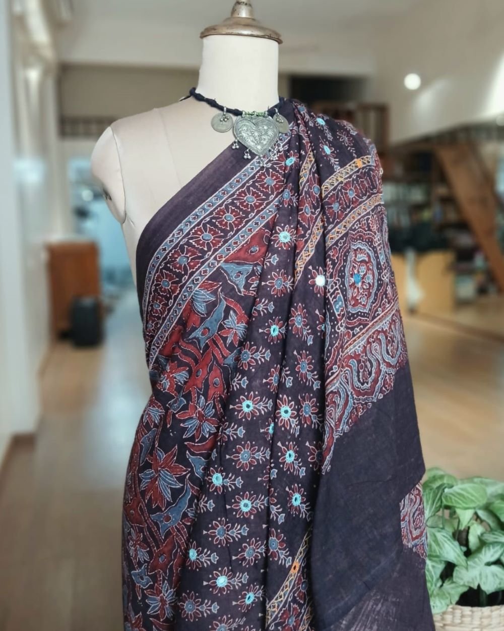 Saree is 6.3 meters in length including a printed Ajrakh blousepiece. Height 45 inches suitable for tall people