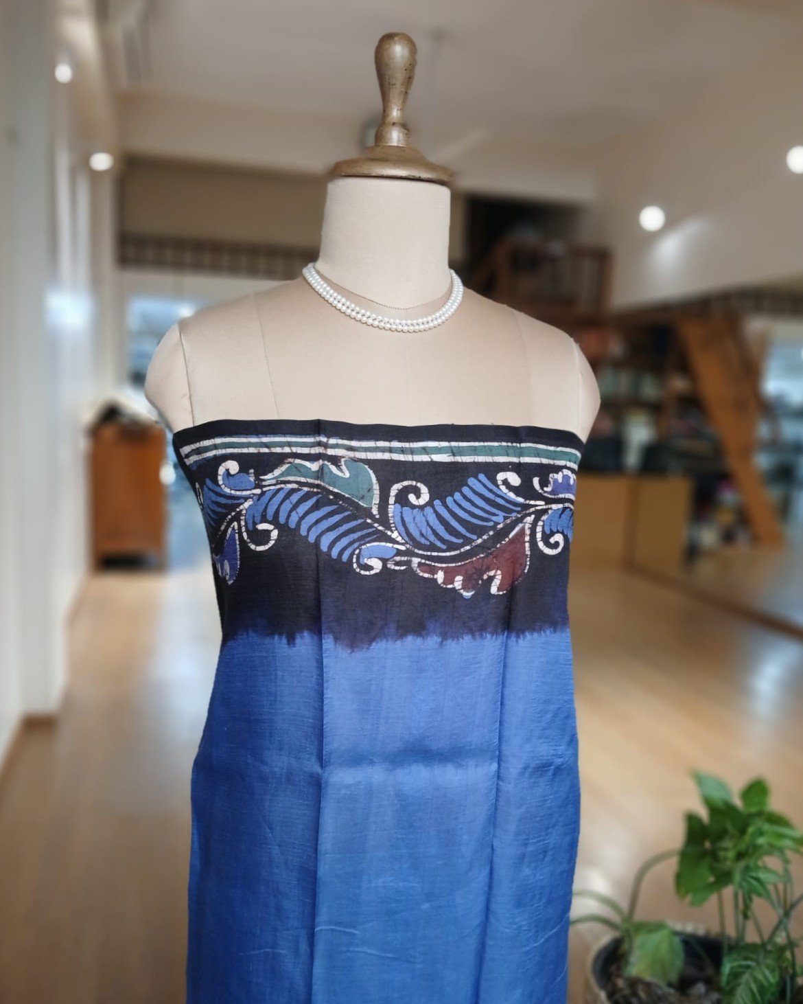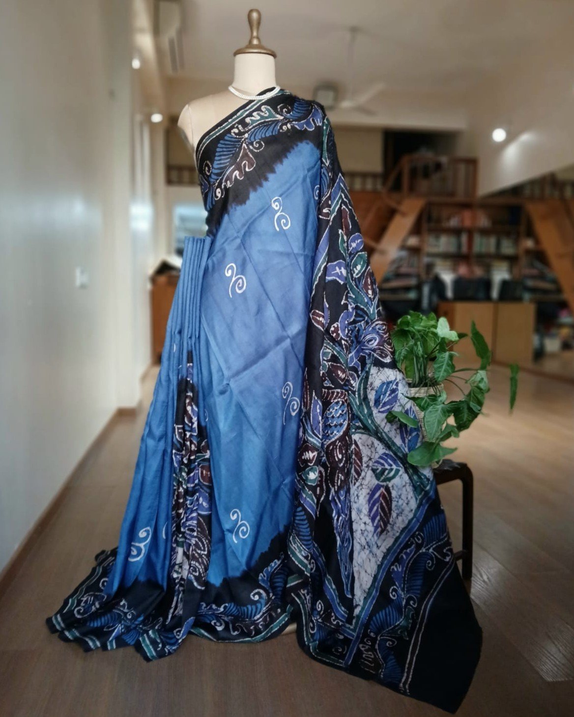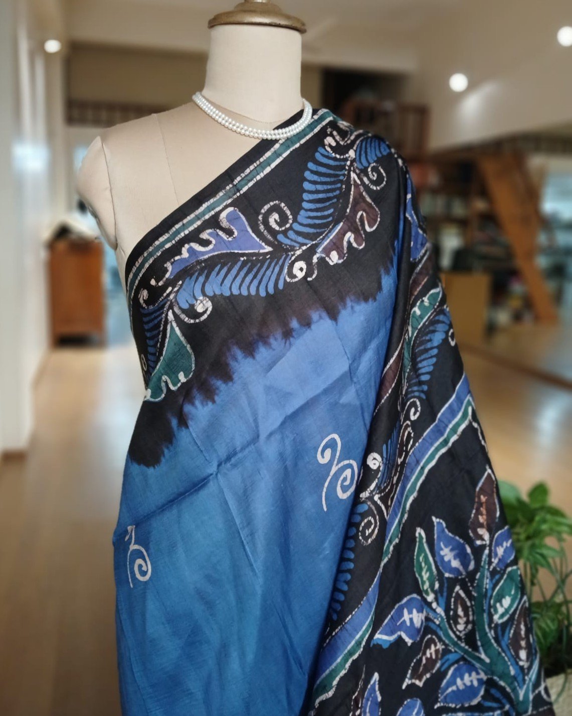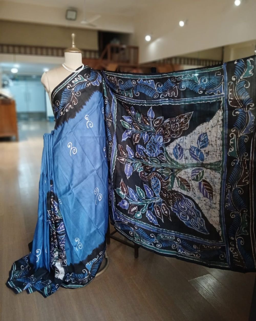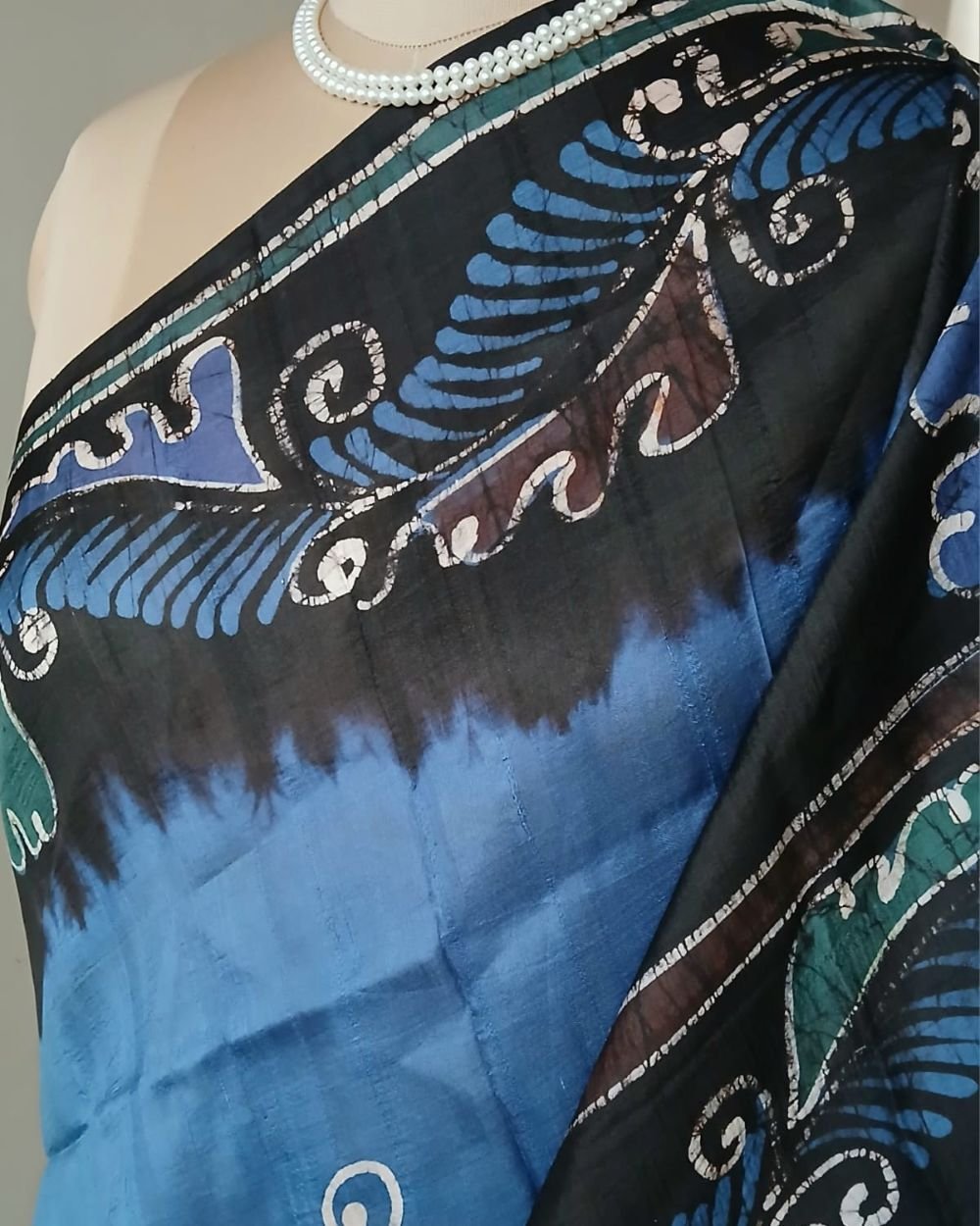 Silk Batik saree from Murshidabad West Bengal using wax resist technique, with contrast borders and pallu.