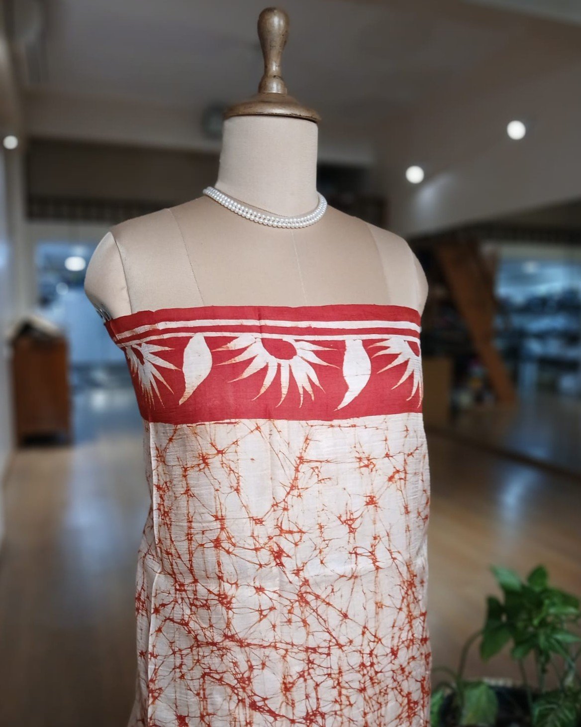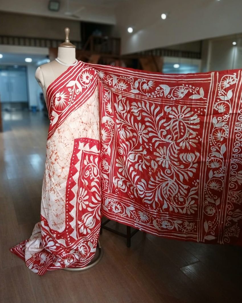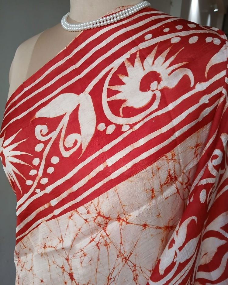 Silk Batik saree from Murshidabad West Bengal using wax resist technique, with contrast borders and pallu.
